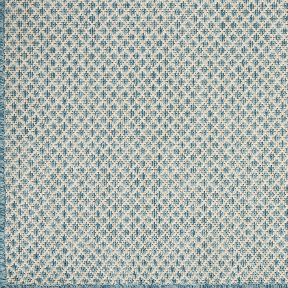 This 9-foot x 12-foot aqua and ivory indoor outdoor area rug, is a great way to add warmth to a room. Versatile in use, durable, and easy to maintain, this rug is an ideal solution to add a decorative and inviting touch to your indoor or outdoor space. Featuring a machine-made construction, this rectangular rug combines style with resilience, making it perfect for high-traffic areas. Its refreshing color palette enhances any decor, creating a tranquil atmosphere for relaxation. 108-inch h x 144-inch w x 0.25-inch d.