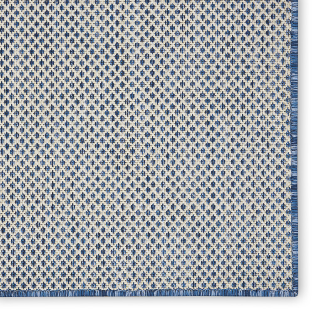 This 9-foot x 12-foot blue and ivory indoor outdoor area rug, is a great way to add warmth to a room. Versatile in use, durable, and easy to maintain, this rug is an ideal solution to add a decorative and inviting touch to your indoor or outdoor space. Crafted using a machine-made technique, it ensures longevity while maintaining its stylish appeal. The classic rectangular shape enhances any setting, making it a perfect centerpiece for your patio or living area. 108-inch h x 144-inch w x 0.25-inch d.