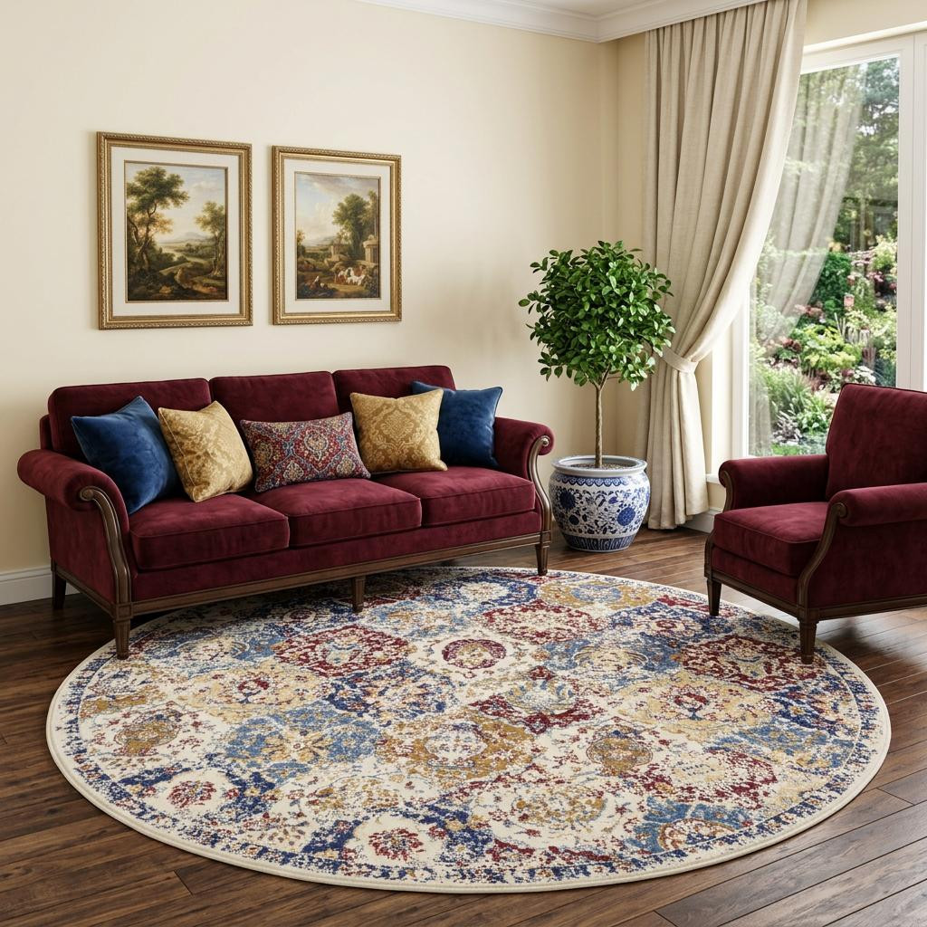 Set an inviting tone in your space with this 8' navy blue round damask power loom distressed area rug. This geometric round shaped rug features a damask pattern in navy blue that combines a good looking print with a unique and updated shape. The mix of shape, color, and design gives this rug refreshing visual interest. Made in Turkey, this rug offers high quality combined with good looking designer sensibilities. Place this area rug against a hardwood or tile floor and it will enliven your living space with style and sophistication. .50" H x 96.00" W x 96.00" D