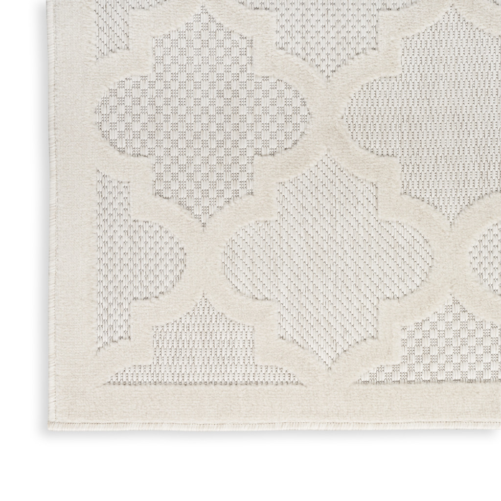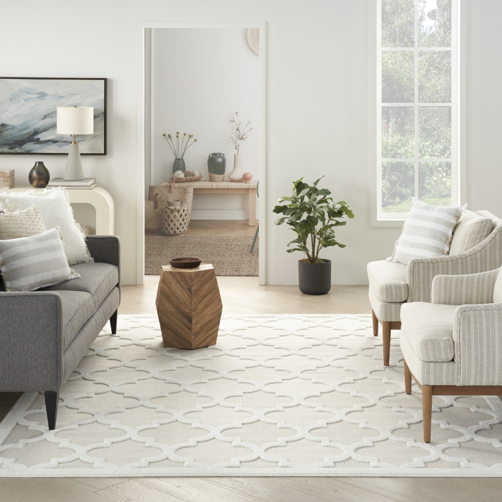 Set an inviting tone in your space with this 7-foot x 10-foot ivory and white indoor outdoor area rug. Versatile in use, durable, and easy to maintain, this rug is an ideal solution to add a decorative and inviting touch to your indoor or outdoor space. Crafted with a machine-made construction, this rectangular rug combines style with functionality. Its color palette of ivory and white effortlessly complements various design aesthetics, making it a perfect addition for enhancing any atmosphere. 84-inch h x 120-inch w x 0.25-inch d.