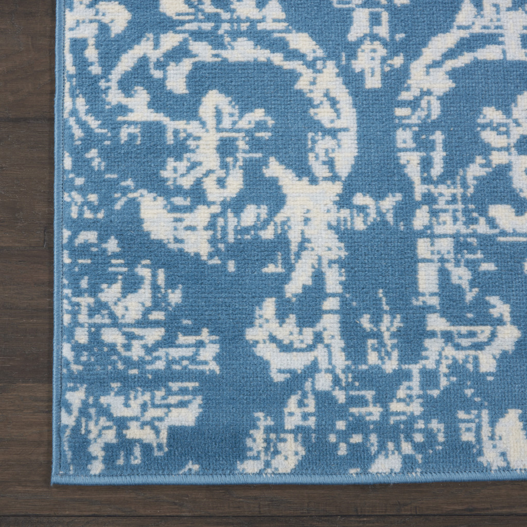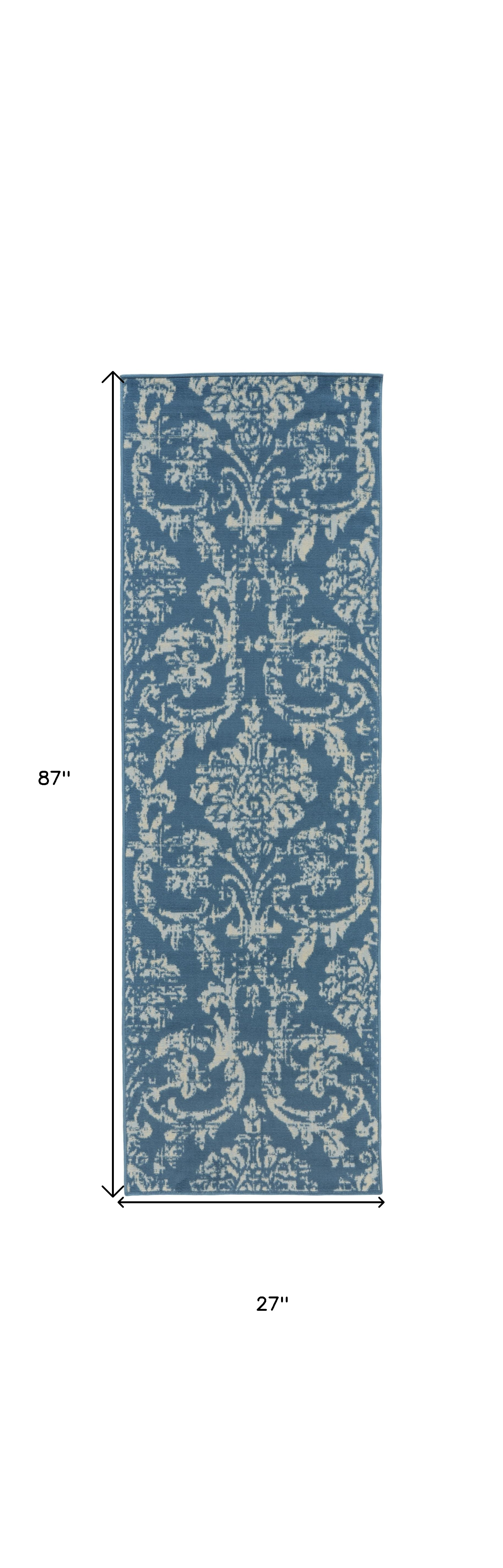Add great coloration and comfortable texture to your space with this 7' blue damask power loom runner rug. This runner shaped rug features a damask design in blue to give it visual interest. A classic shape marries with good looking design for your space This superior Turkish rug represents the highest quality and is built to last. Place this area rug against a hardwood or tile floor and it will enliven your living space with style and sophistication. .50" H x 27" W x 87" D
