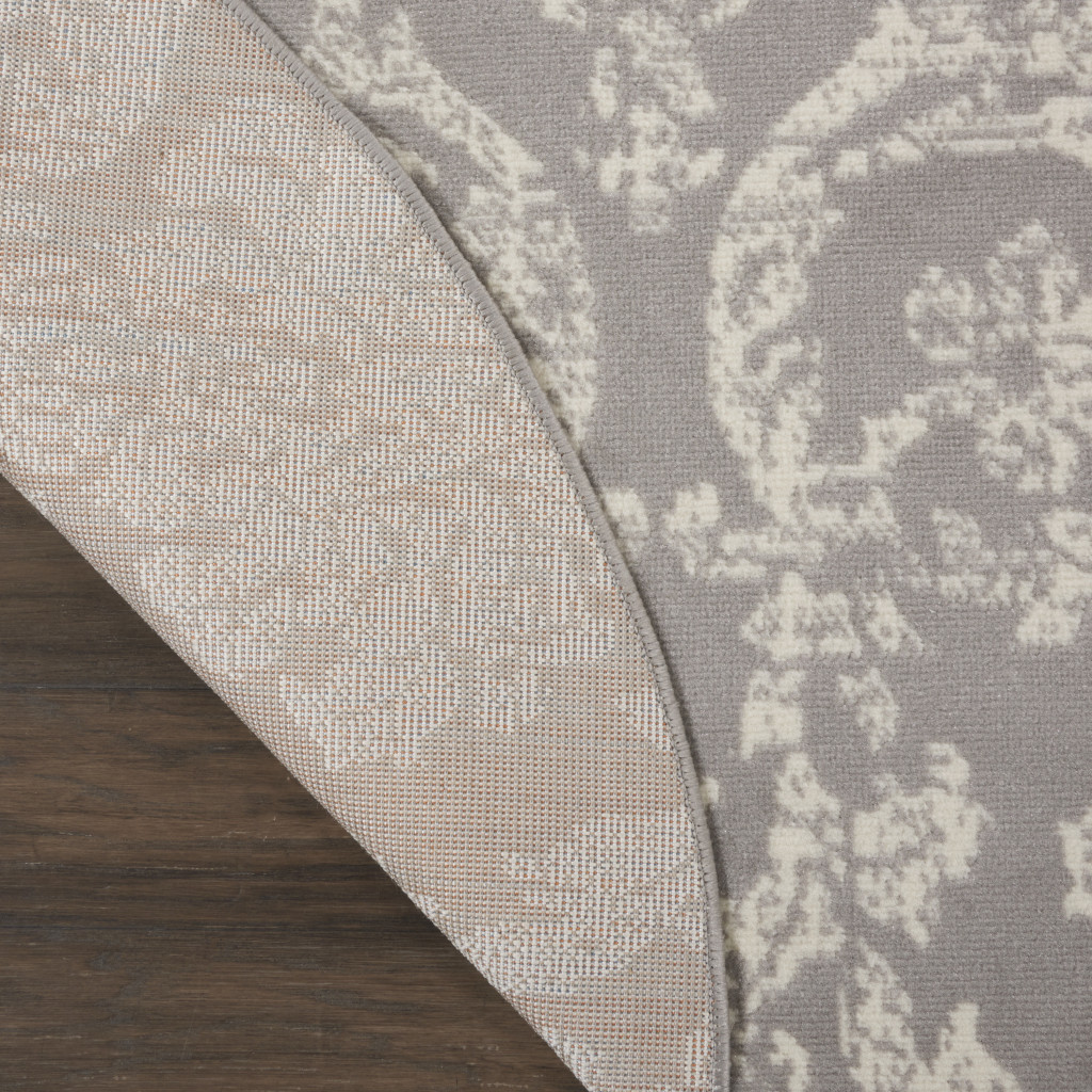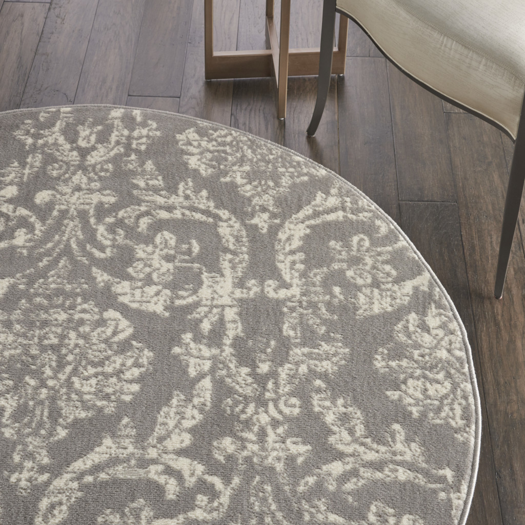 Set an inviting tone in your space with this 5' gray round damask power loom area rug. This geometric round shaped rug features a damask pattern in gray that combines a good looking print with a unique and updated shape. The mix of shape, color, and design gives this rug refreshing visual interest. This superior Turkish rug represents the highest quality and is built to last. Place this area rug against a hardwood or tile floor and it will enliven your living space with style and sophistication. .50" H x 63" W x 63" D