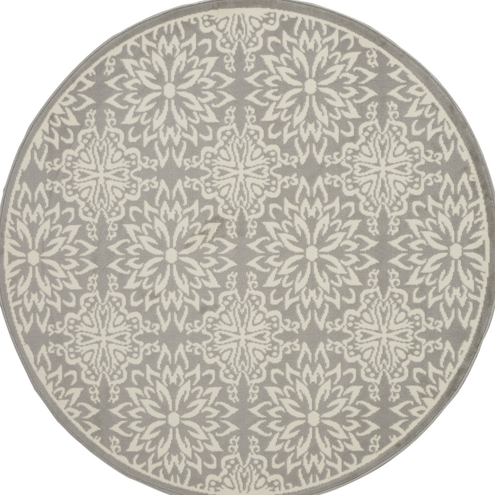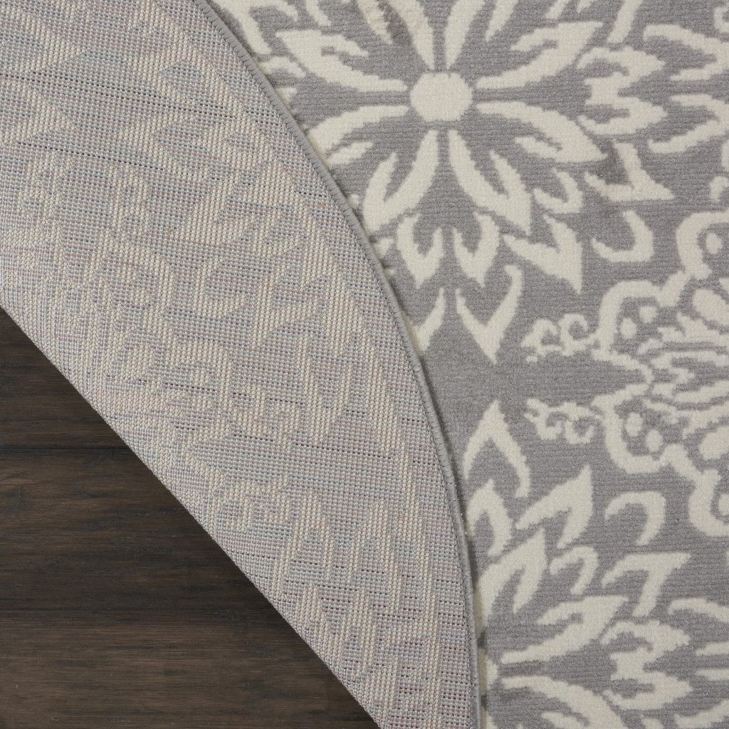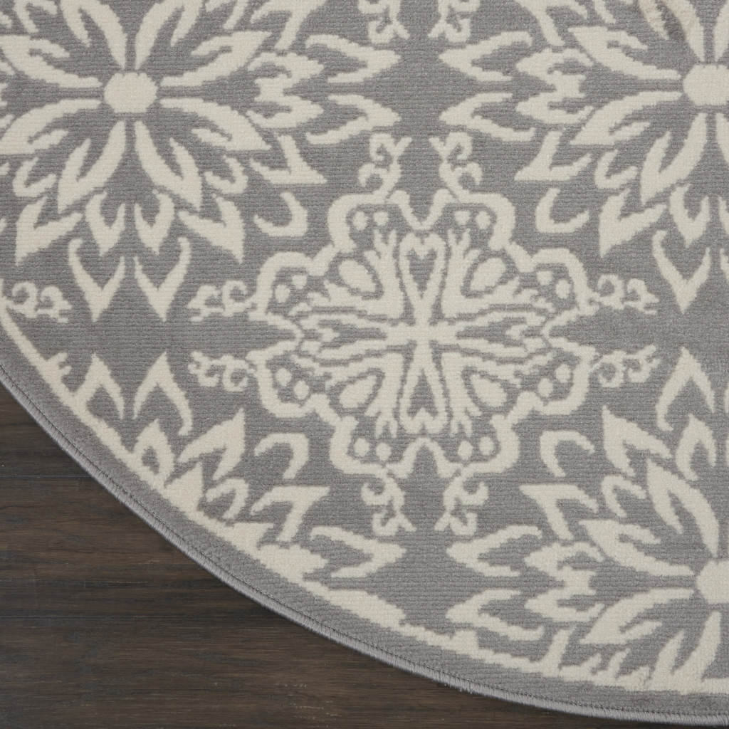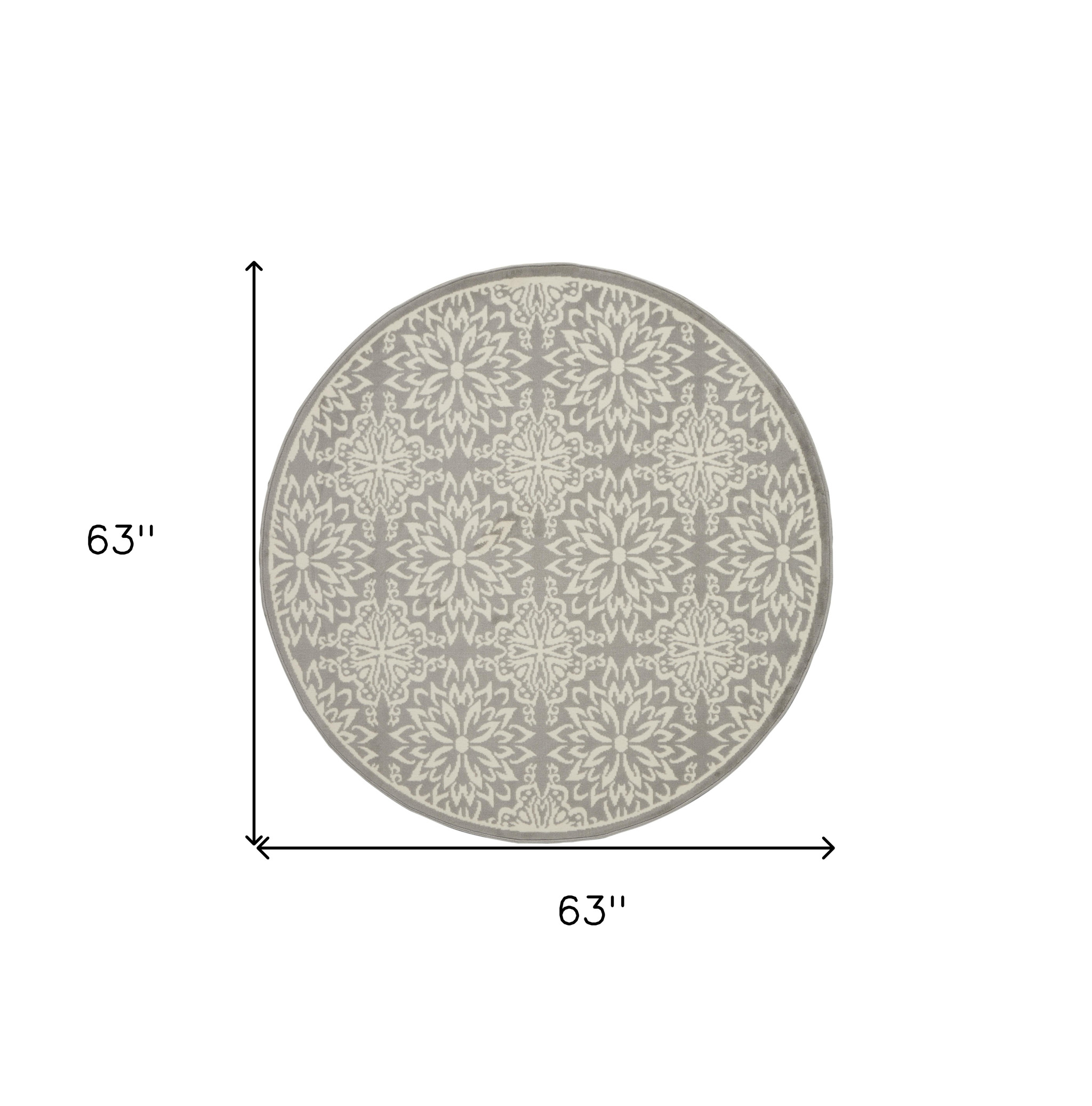 Add great coloration and comfortable texture to your space with this 5' gray round floral power loom area rug. This geometric round shaped rug features a floral pattern in gray that combines a good looking print with a unique and updated shape. The mix of shape, color, and design gives this rug refreshing visual interest. Made in Turkey, this rug offers high quality combined with good looking designer sensibilities. Place this area rug against a hardwood or tile floor and it will enliven your living space with style and sophistication. .50" H x 63" W x 63" D
