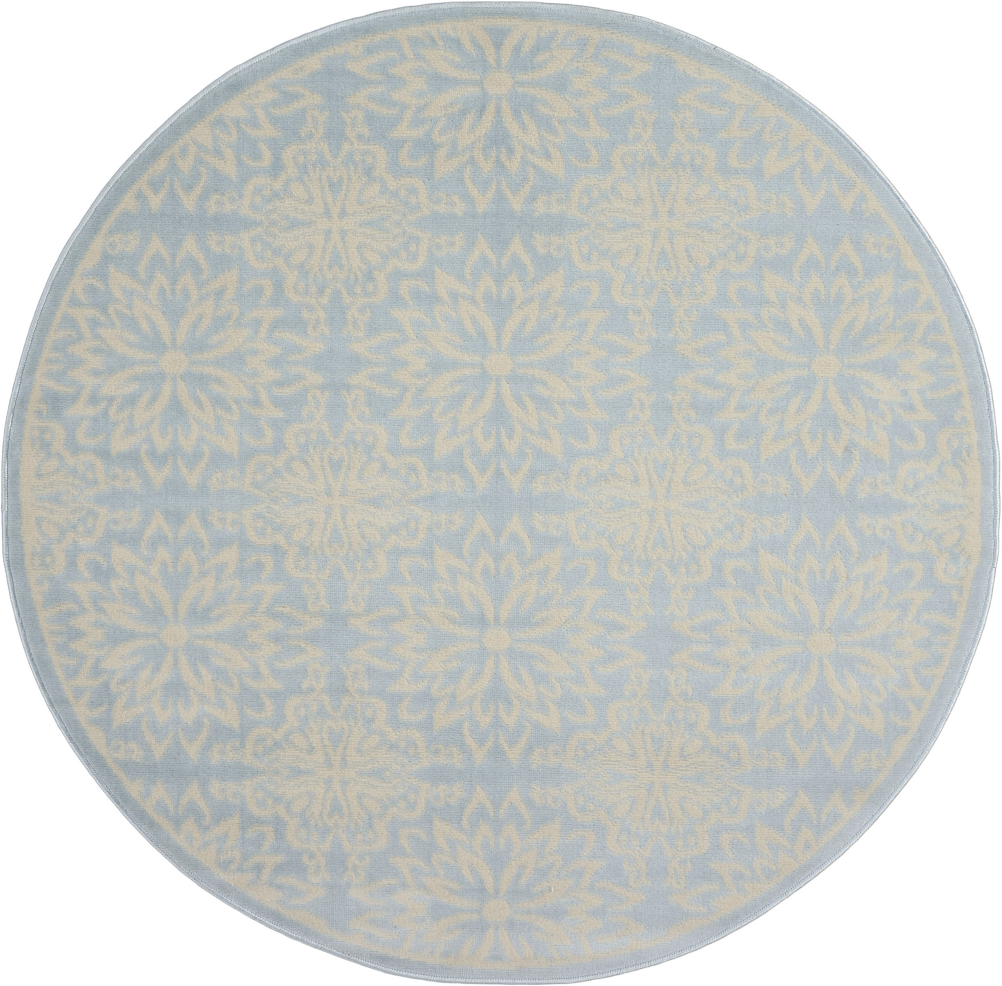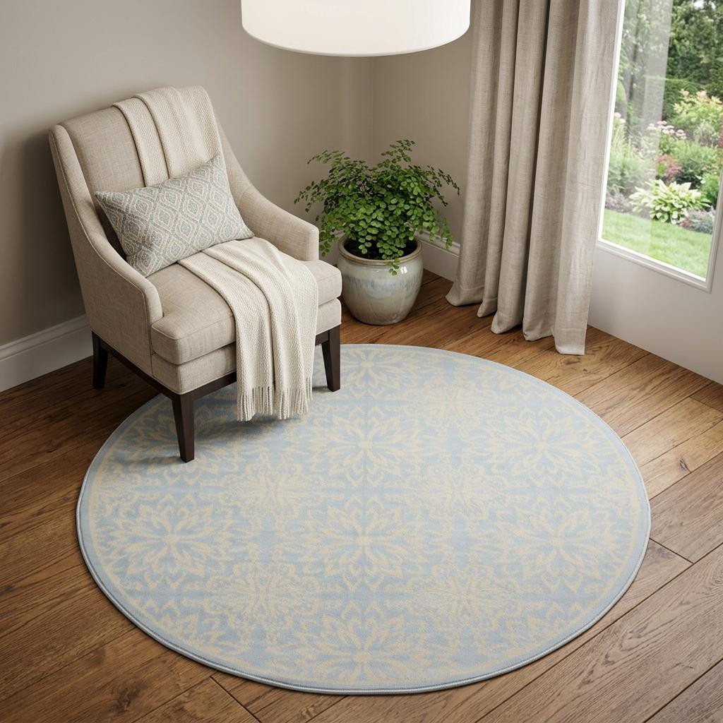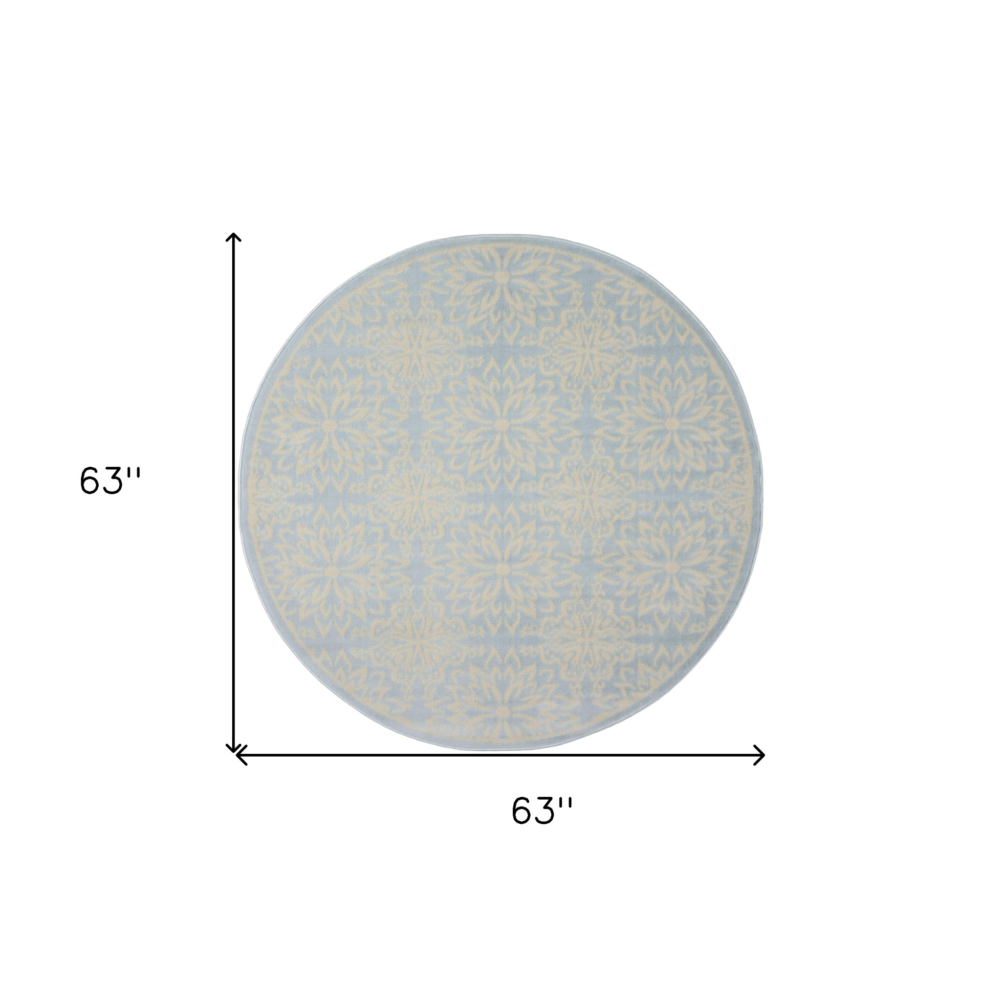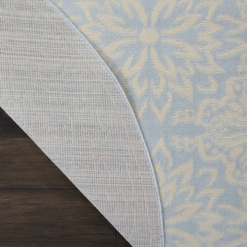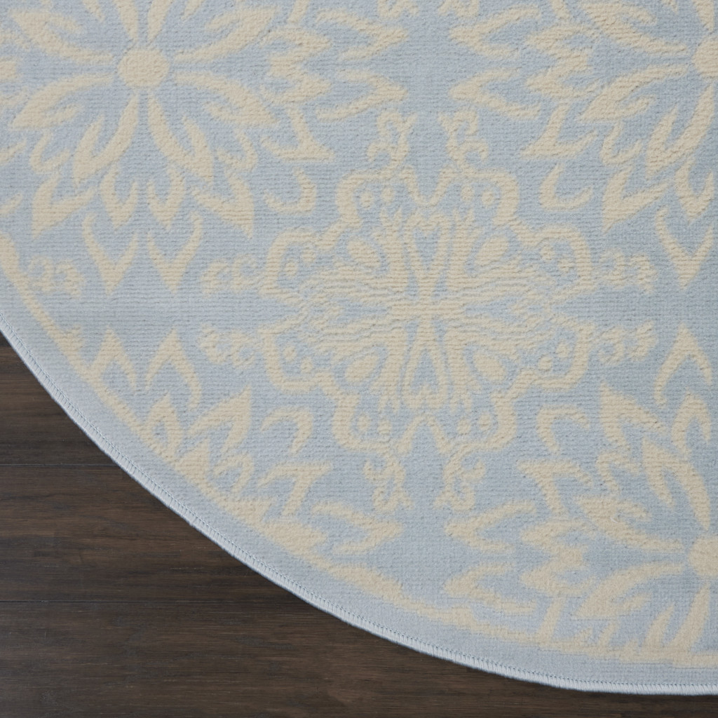 Add great coloration and comfortable texture to your space with this 5' light blue round floral power loom area rug. This geometric round shaped rug features a floral pattern in light blue that combines a good looking print with a unique and updated shape. The mix of shape, color, and design gives this rug refreshing visual interest. This superior Turkish rug represents the highest quality and is built to last. Area Rugs help to give warmth and sense of home to your space. .50" H x 63" W x 63" D