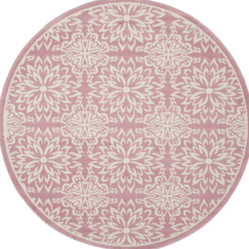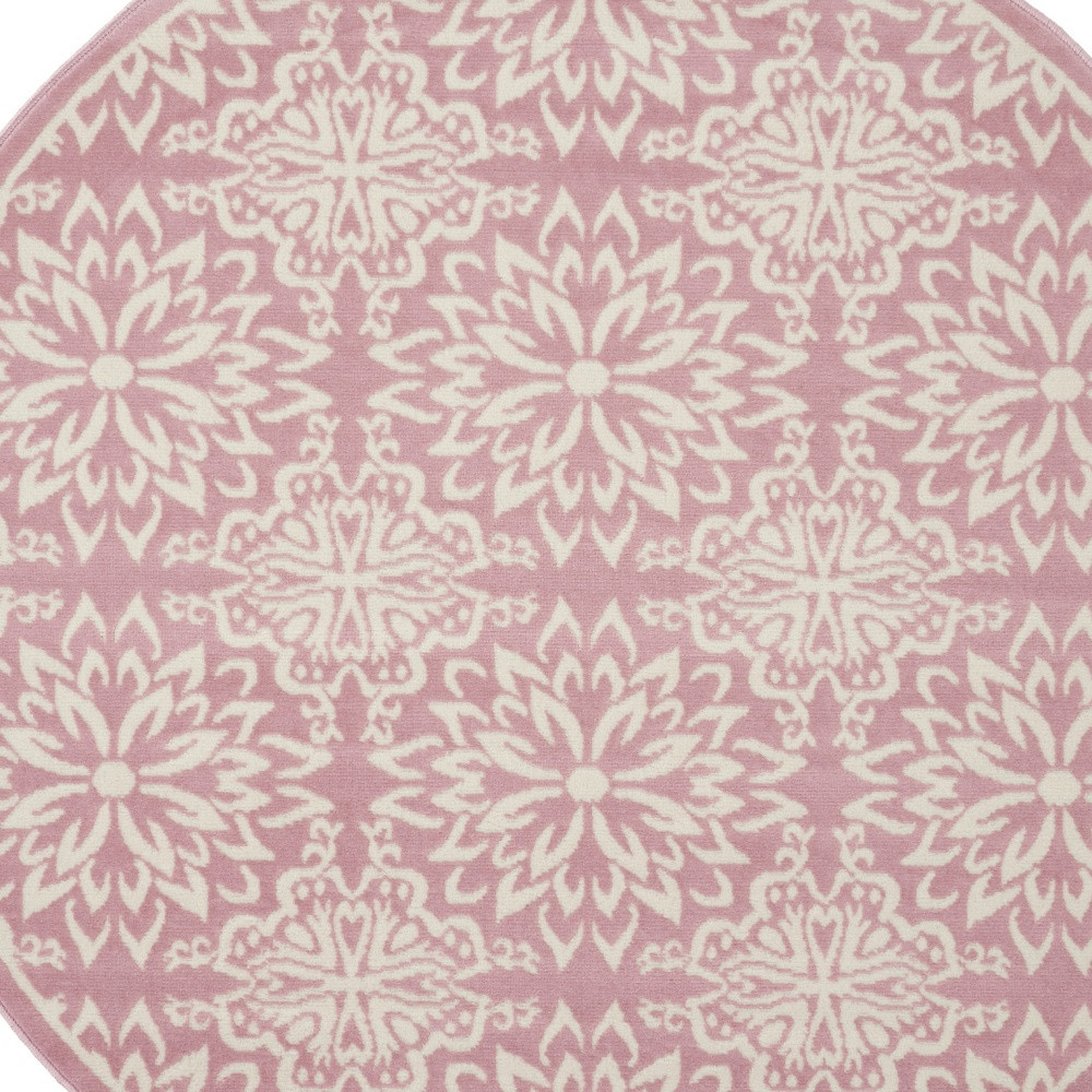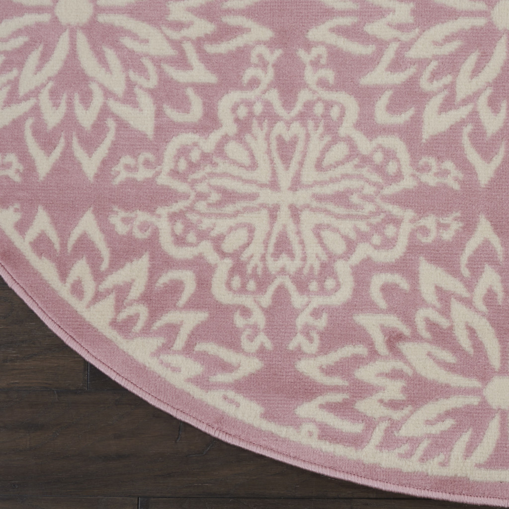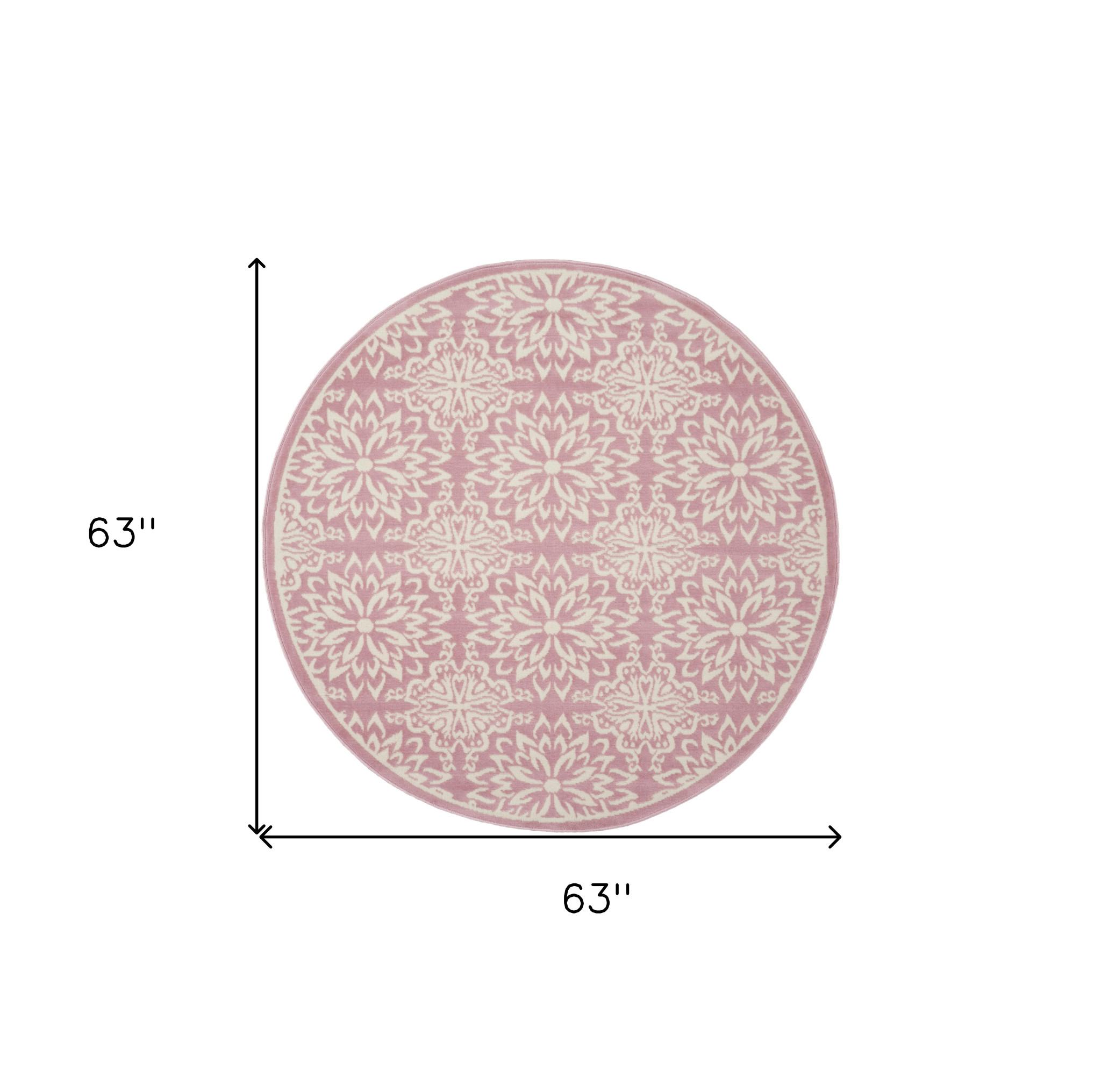 This 5' pink round floral power loom area rug, is a great way to add warmth to a room. This geometric round shaped rug features a floral pattern in pink that combines a good looking print with a unique and updated shape. The mix of shape, color, and design gives this rug refreshing visual interest. This superior Turkish rug represents the highest quality and is built to last. Place this area rug against a hardwood or tile floor and it will enliven your living space with style and sophistication. .50" H x 63" W x 63" D