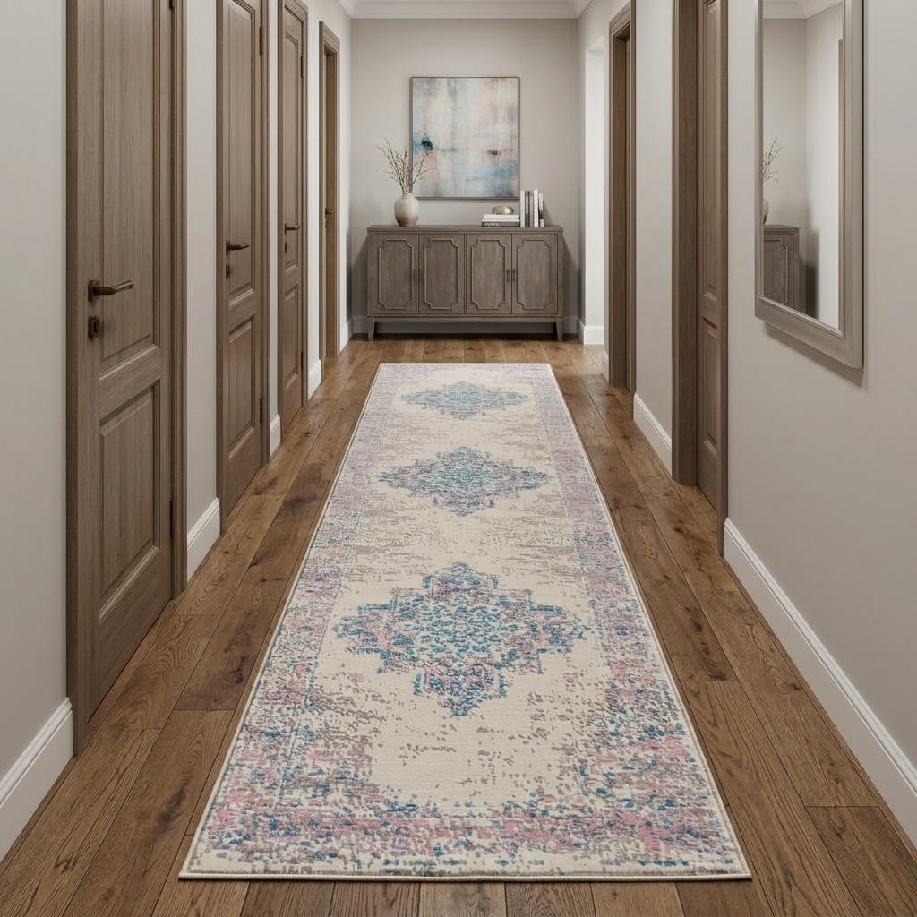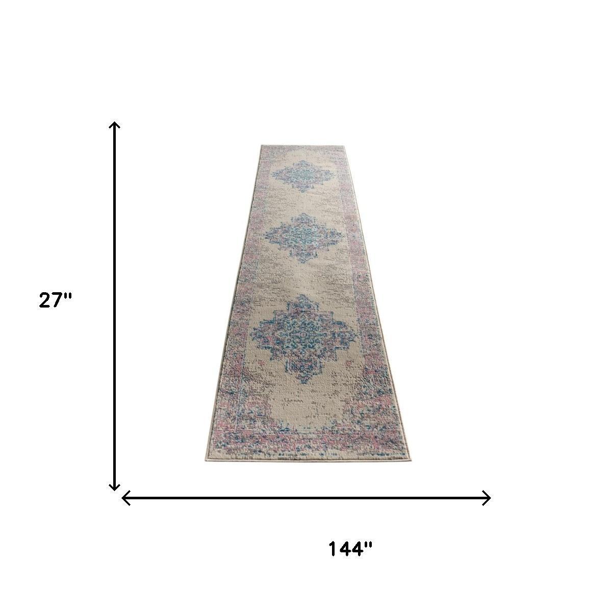 Add great coloration and comfortable texture to your space with this 12-foot pink and ivory medallion runner rug. Built to last, this rug crafted from polypropylene fibers is known for its durability and long lasting appeal. Rugs are a great way to showcase your style, hide imperfections, warm your home and reduce noise. This rectangular shaped rug features a abstract design that will add a functional and decorative accent to your space. This transitional style runner makes a great accent for the hallway, in front of cabinets, in the laundry room, or any other space you need a narrow and long rug. 27-inch h x 144-inch w x 0.5-inch d.