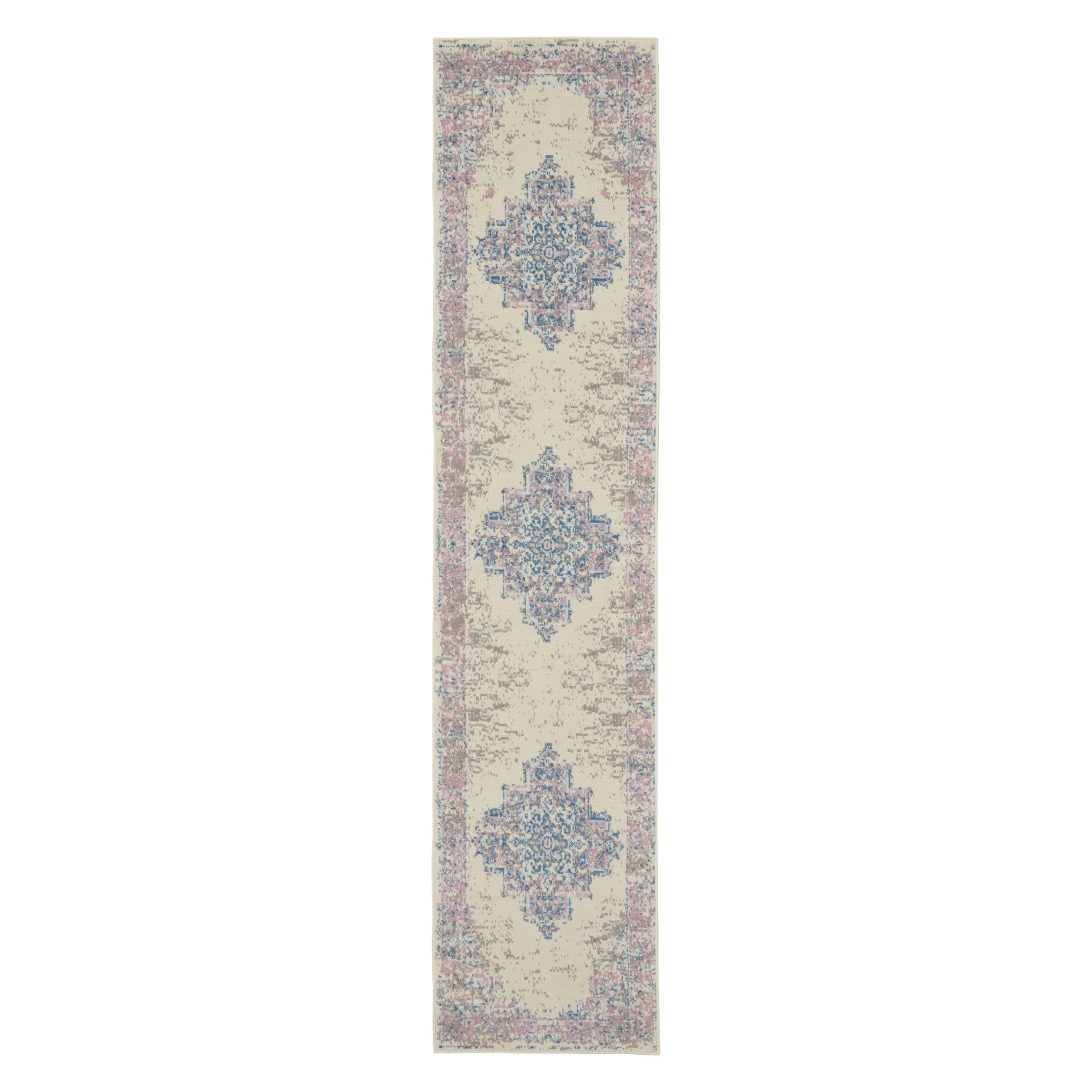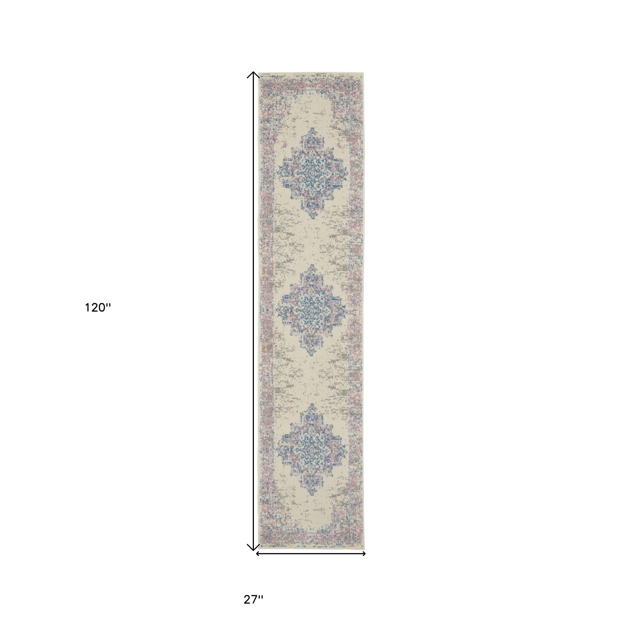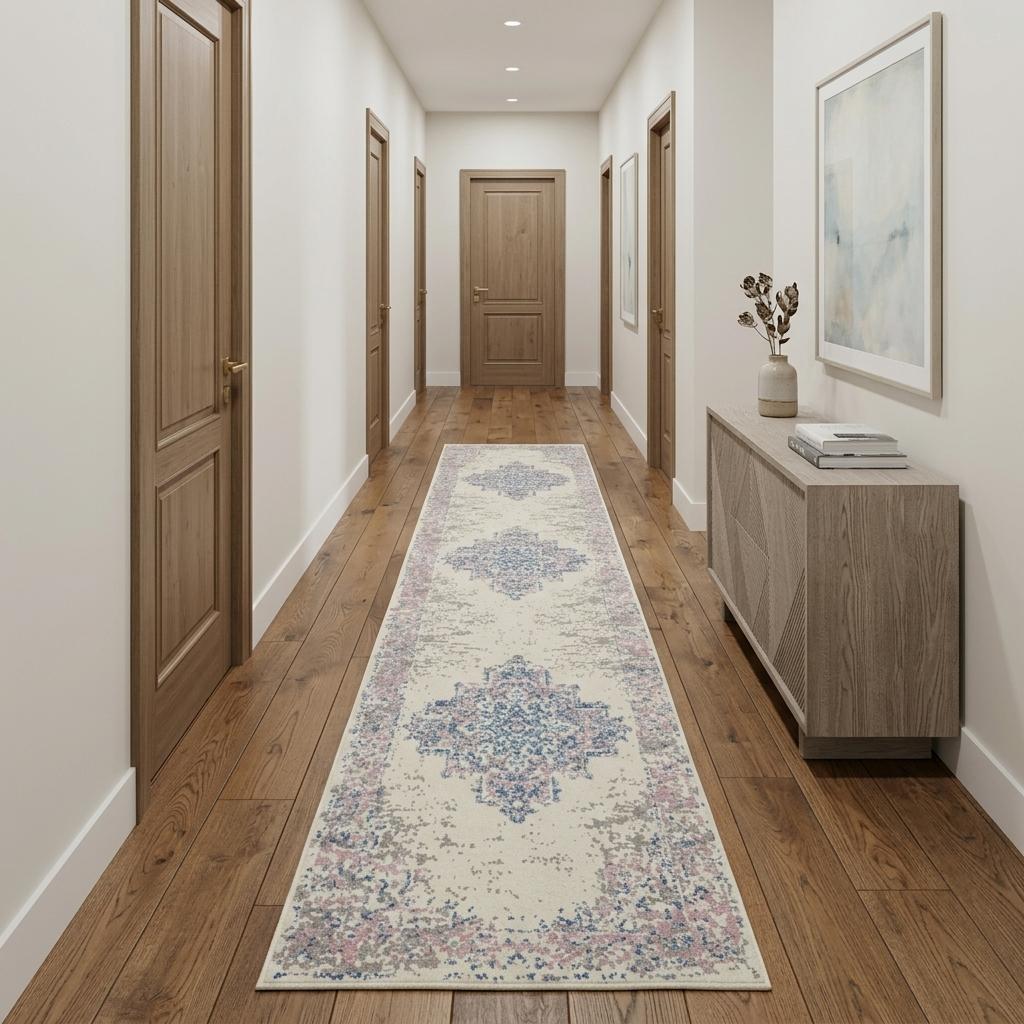 This 10-foot pink and ivory medallion runner rug, is a great way to add warmth to a room. Built to last, this rug crafted from polypropylene fibers is known for its durability and long lasting appeal. Rugs are a great way to showcase your style, hide imperfections, warm your home and reduce noise. This rectangular shaped rug features a abstract design that will add a functional and decorative accent to your space. This transitional style runner makes a great accent for the hallway, in front of cabinets, in the laundry room, or any other space you need a narrow and long rug. 27-inch h x 120-inch w x 0.5-inch d.