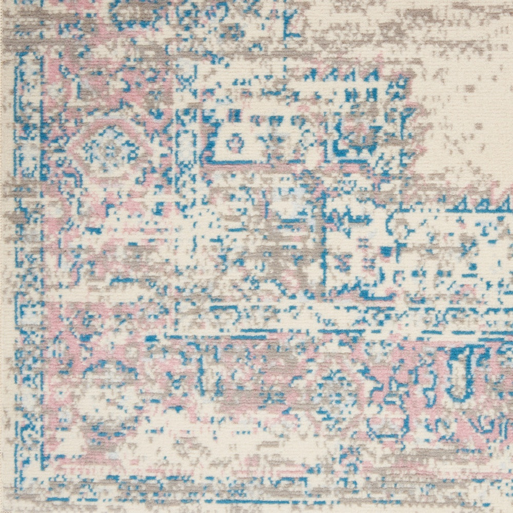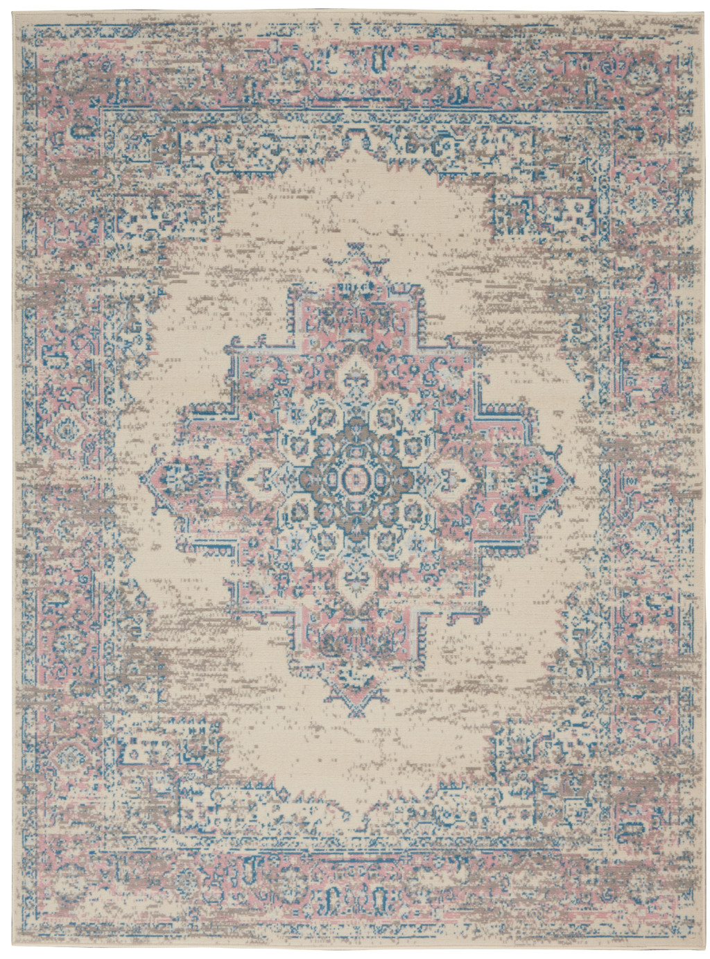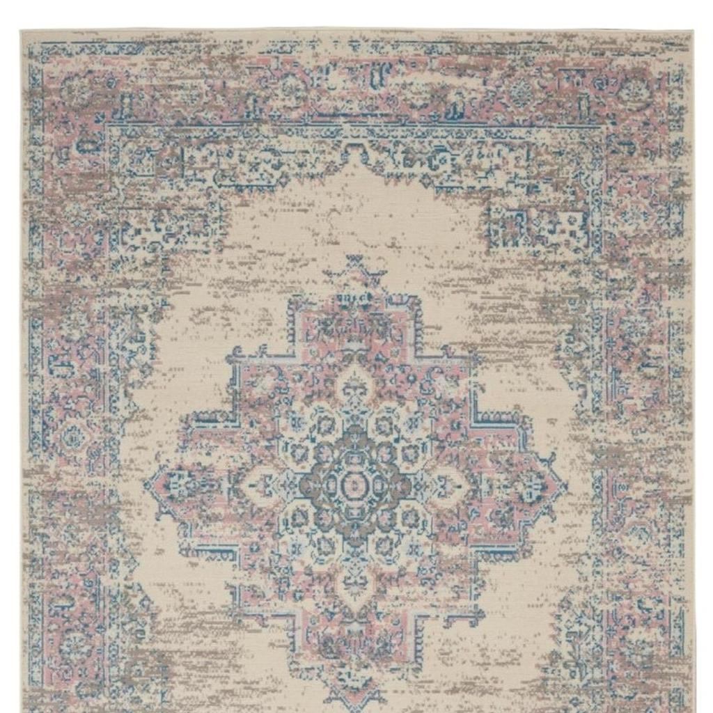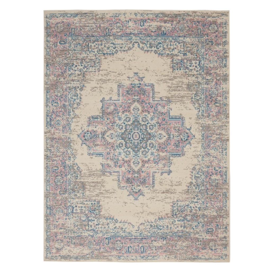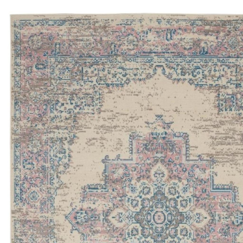 Add great coloration and comfortable texture to your space with this 6-foot x 9-foot ivory pink and blue medallion area rug. Built to last, this rug crafted from polypropylene fibers is known for its durability and long lasting appeal. Rugs are a great way to showcase your style, hide imperfections, warm your home and reduce noise. This larger sized, transitional styled rug is ready to create a focal point or statement piece in your room. 72.00-inch h x 108.00-inch w x 0.50-inch d.