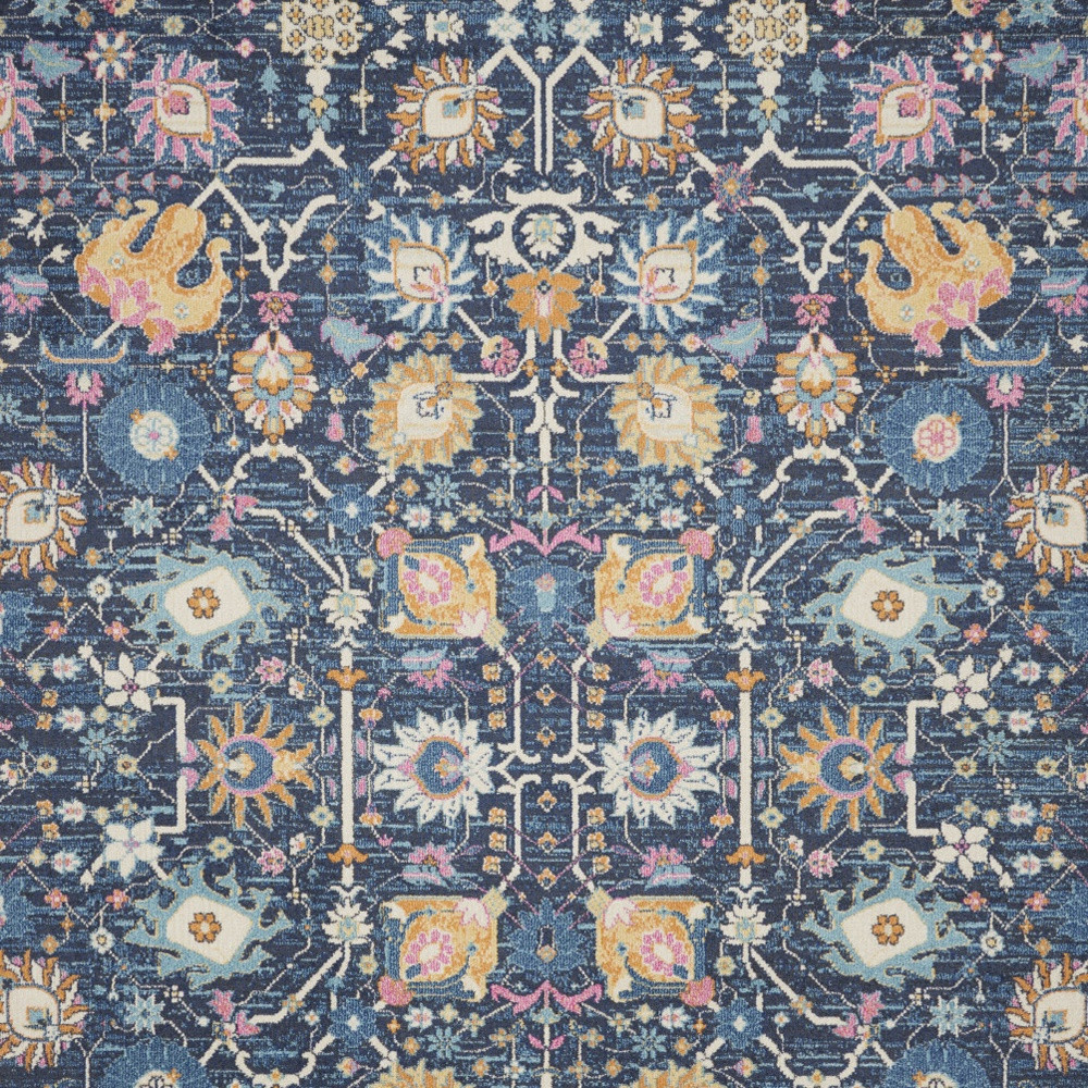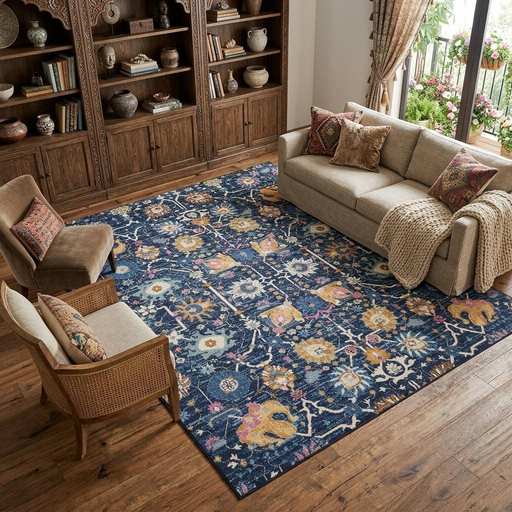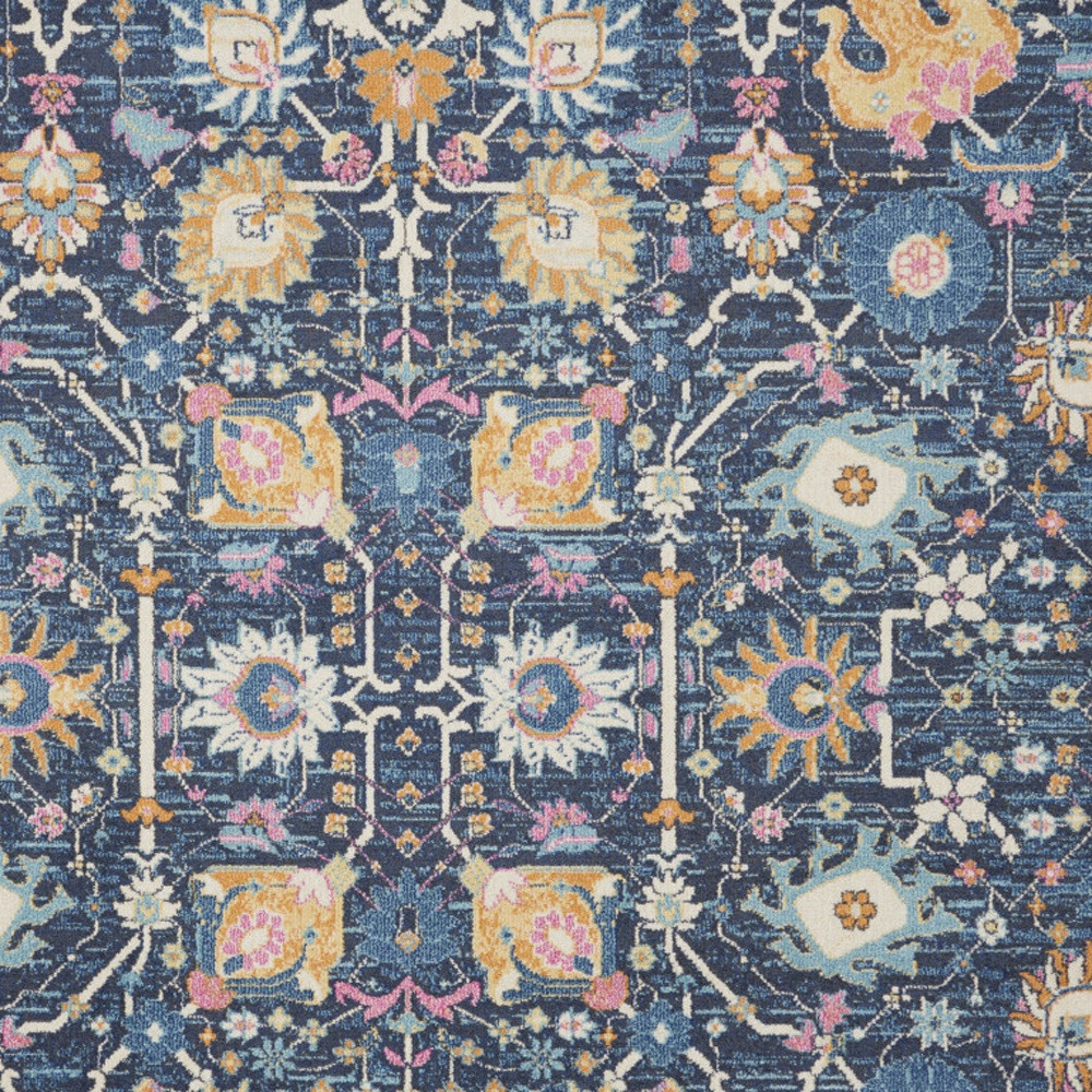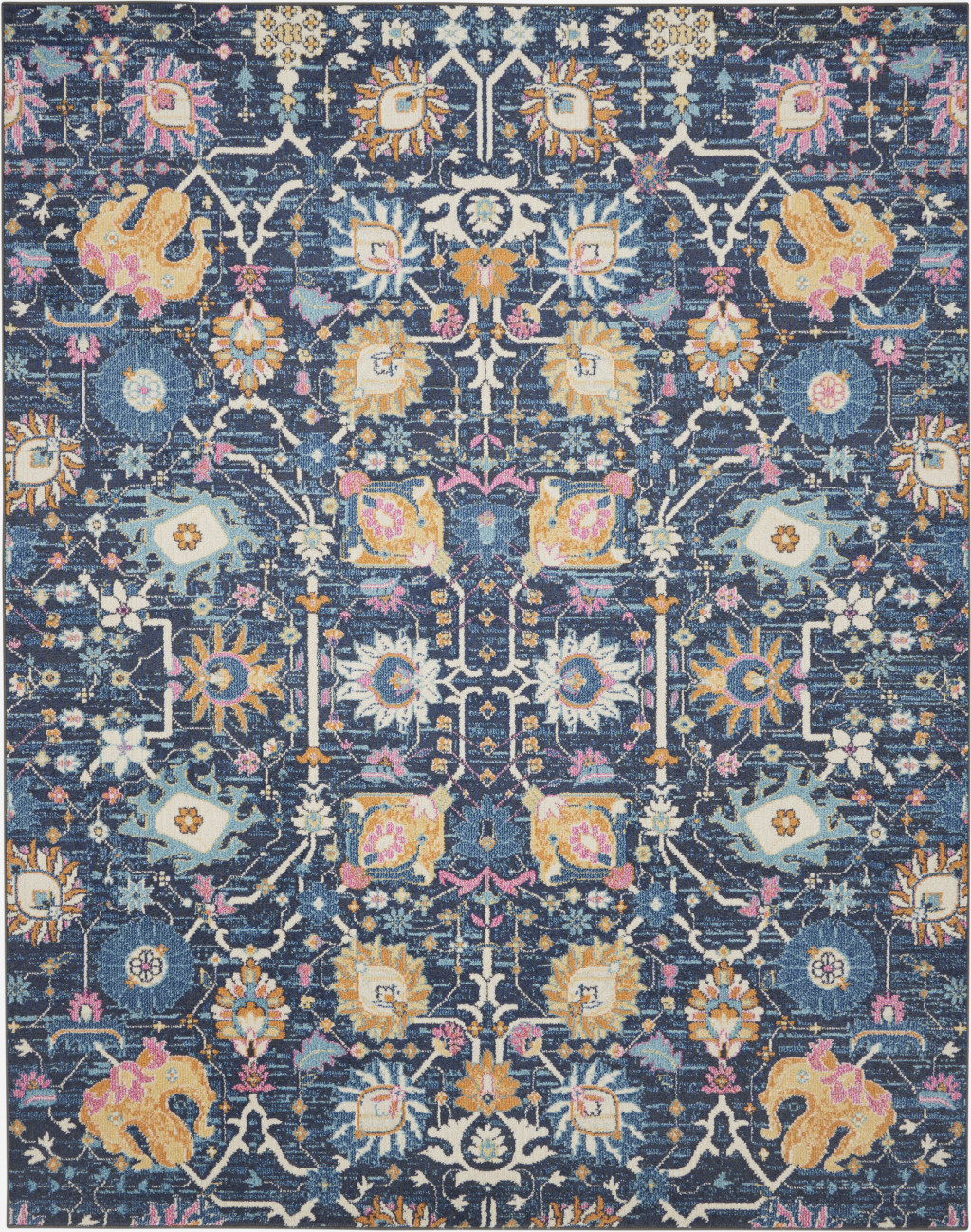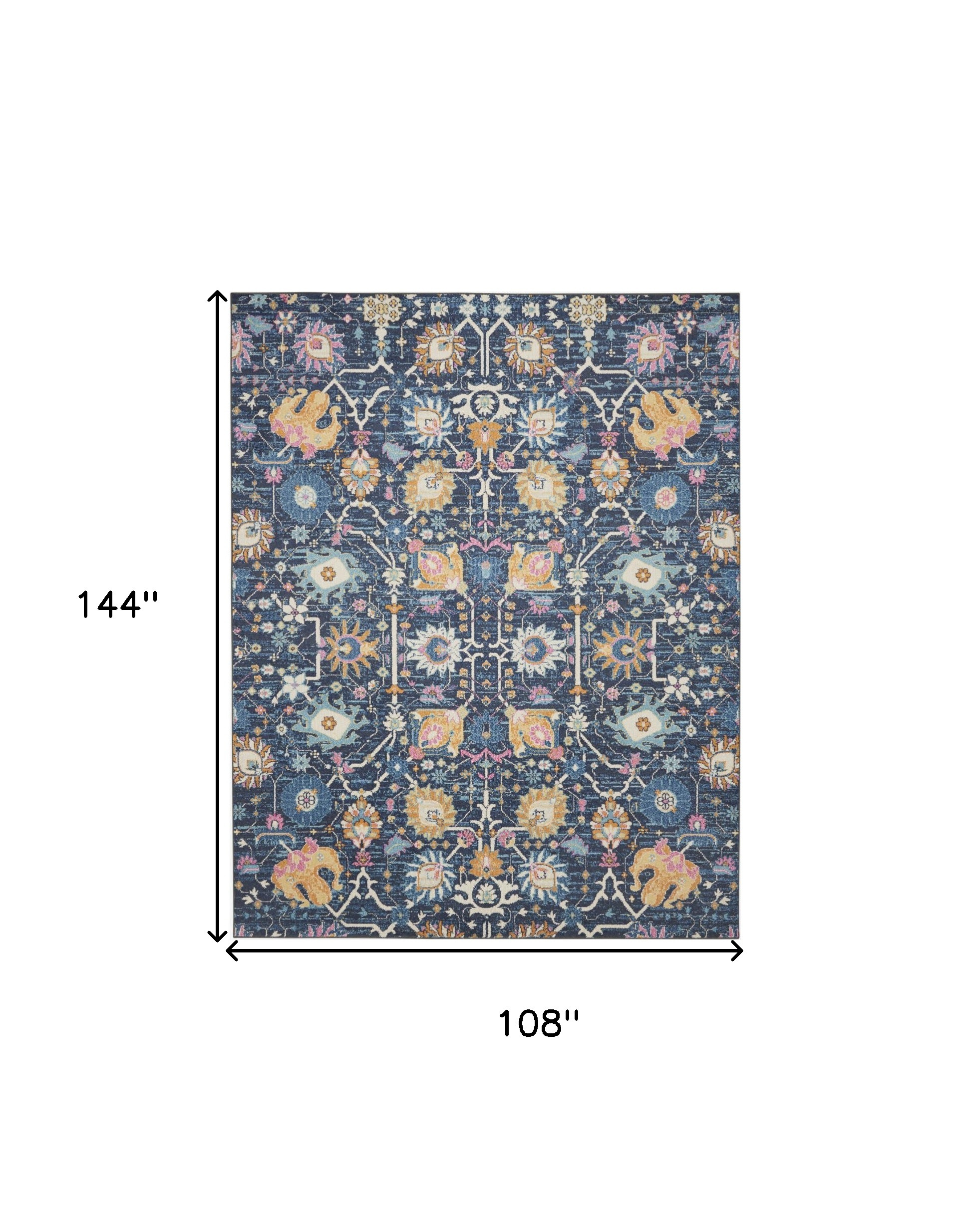 This 9-foot x 12-foot blue and gold floral area rug, is a great way to add warmth to a room. Built to last, this rug crafted from polypropylene fibers is known for its durability and long lasting appeal. Rugs are a great way to showcase your style, hide imperfections, warm your home and reduce noise. This larger sized, bohemian styled rug is ready to create a focal point or statement piece in your room. 108-inch h x 144-inch w x 0.5-inch d.