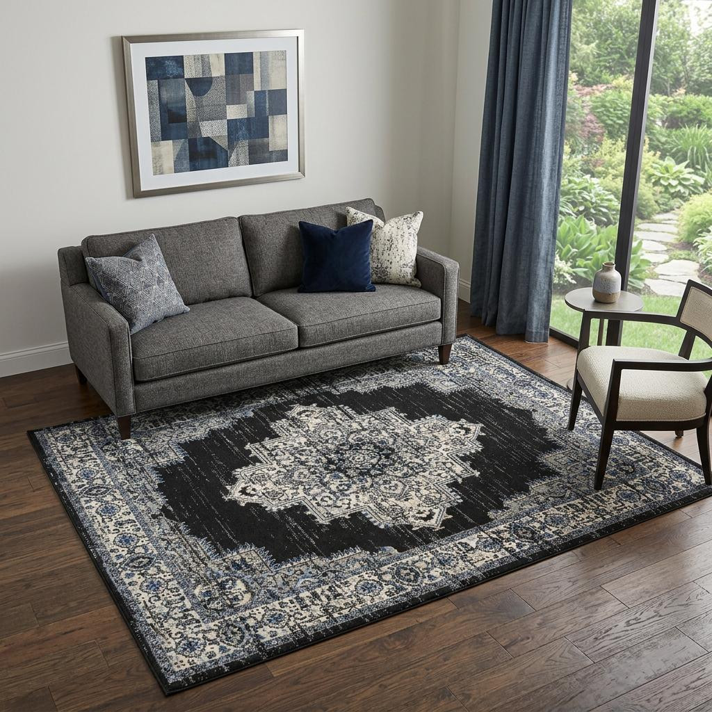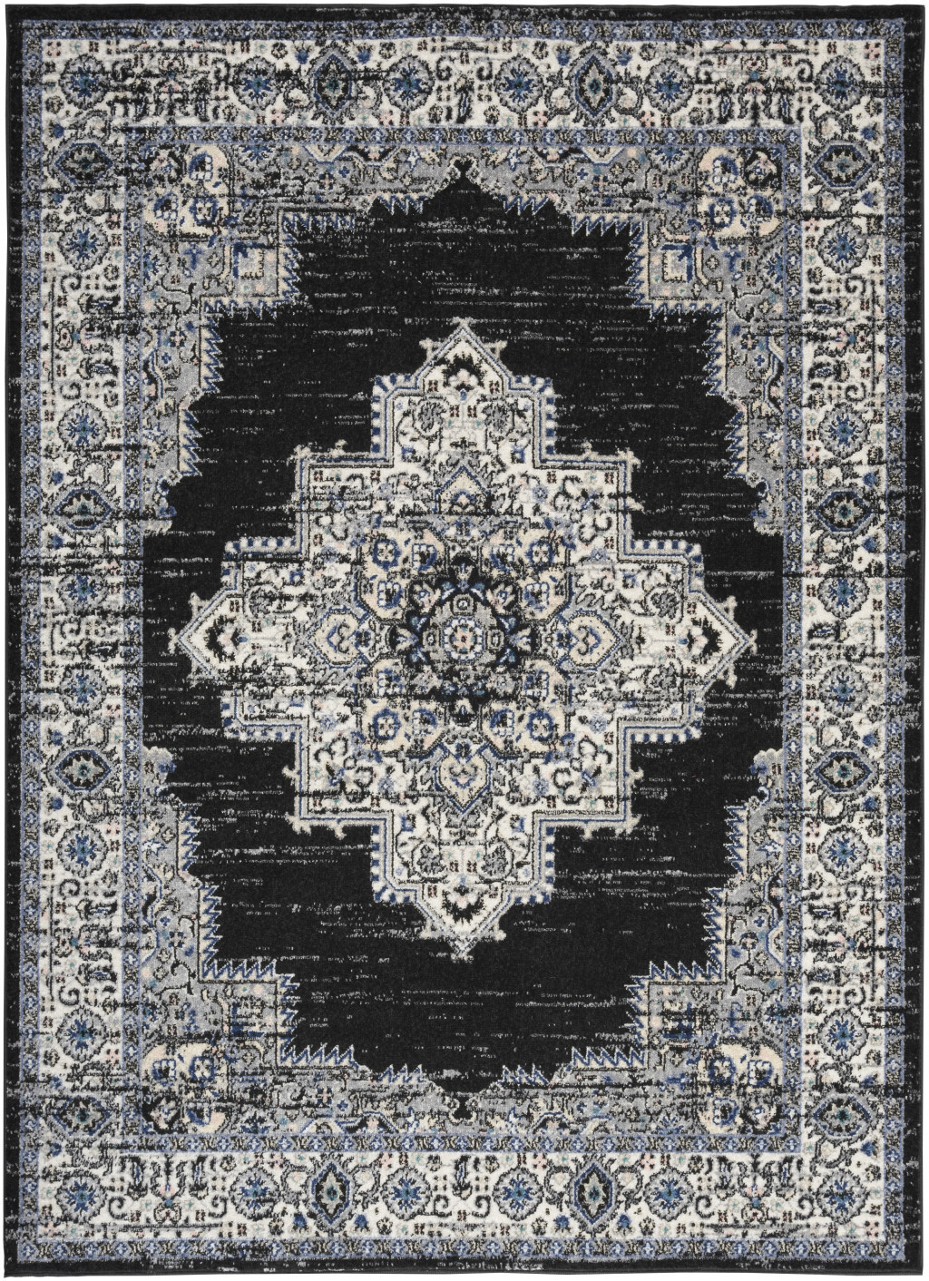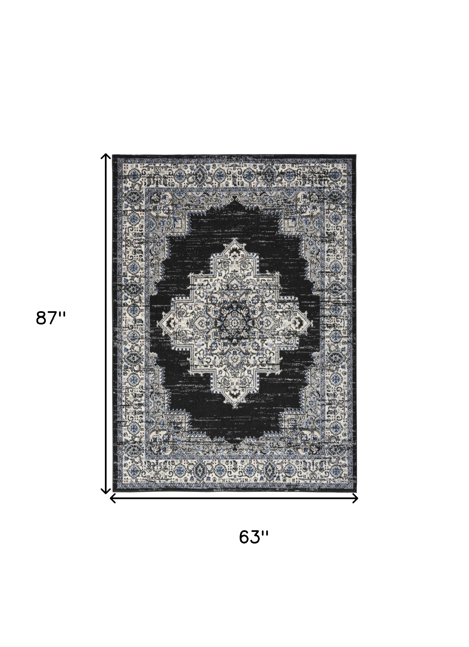 Set an inviting tone in your space with this 5' x 7' black floral power loom distressed area rug. This rectangle shaped rug features a floral design in black to give it visual interest. A classic shape marries with good looking design for your space The coloration of this rug infuses an updated and modern vibe into your space. Made in Turkey, this rug offers high quality combined with good looking designer sensibilities. Place this area rug against a hardwood or tile floor and it will enliven your living space with style and sophistication. .50" H x 63.00" W x 87.00" D