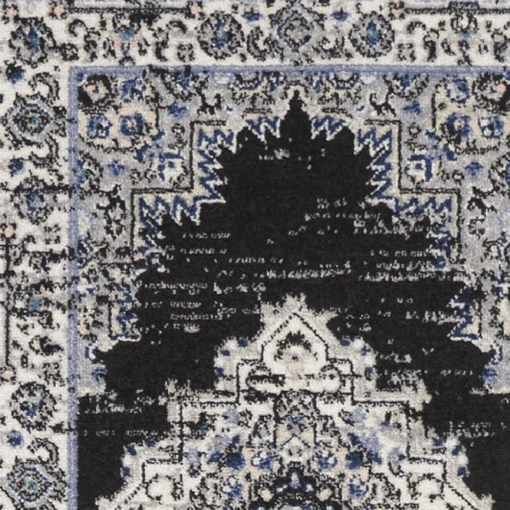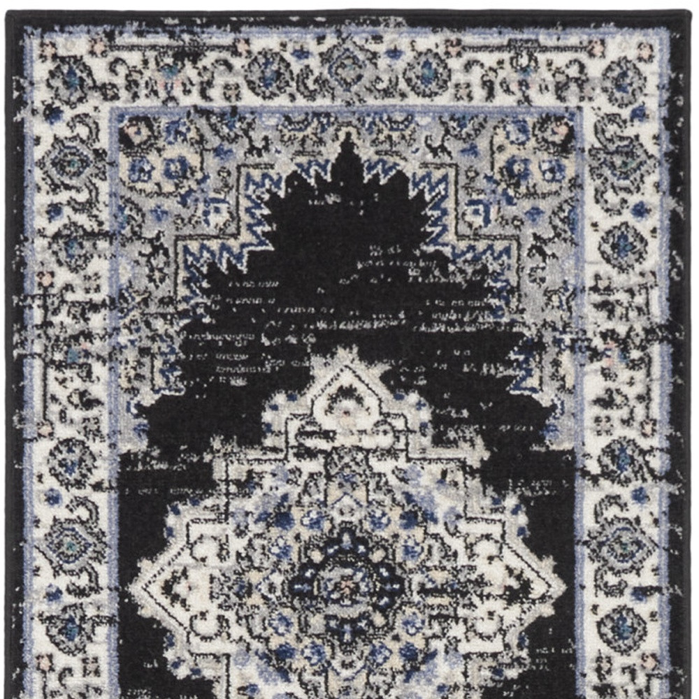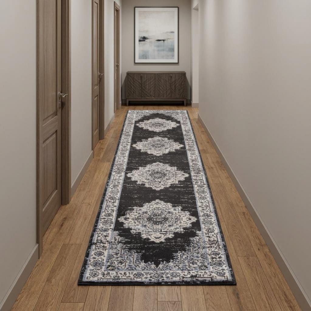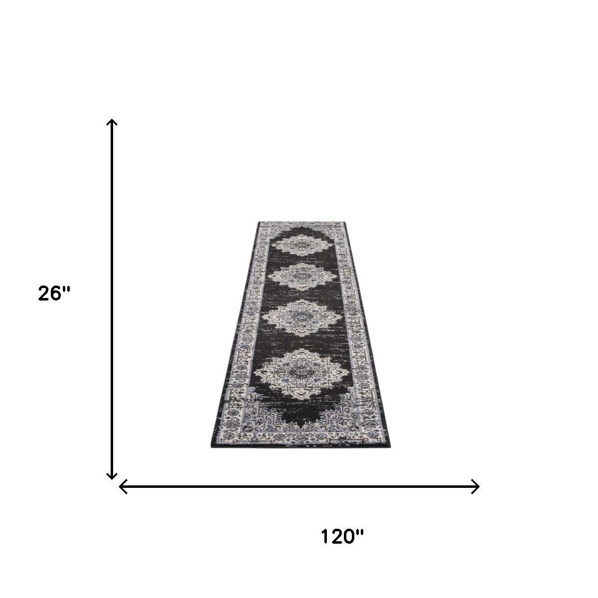 This 10-foot black and ivory floral distressed runner rug, is a great way to add warmth to a room. Built to last, this rug crafted from polypropylene fibers is known for its durability and long lasting appeal. Rugs are a great way to showcase your style, hide imperfections, warm your home and reduce noise. This rectangular shaped rug features a abstract design that will add a functional and decorative accent to your space. This transitional style runner makes a great accent for the hallway, in front of cabinets, in the laundry room, or any other space you need a narrow and long rug. 26-inch h x 120-inch w x 0.5-inch d.