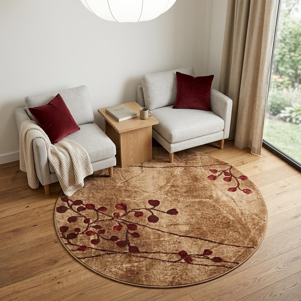 Add some artistry to your room with this 6' brown round floral power loom area rug. This geometric round shaped rug features a floral pattern in brown that combines a good looking print with a unique and updated shape. The mix of shape, color, and design gives this rug refreshing visual interest. Place this area rug against a hardwood or tile floor and it will enliven your living space with style and sophistication. .50" H x 66" W x 66" D