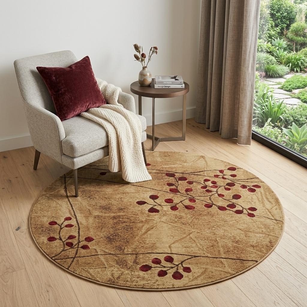 Add great coloration and comfortable texture to your space with this 4' brown round floral power loom area rug. This geometric round shaped rug features a floral pattern in brown that combines a good looking print with a unique and updated shape. The mix of shape, color, and design gives this rug refreshing visual interest. Place this area rug against a hardwood or tile floor and it will enliven your living space with style and sophistication. .50" H x 42" W x 42" D