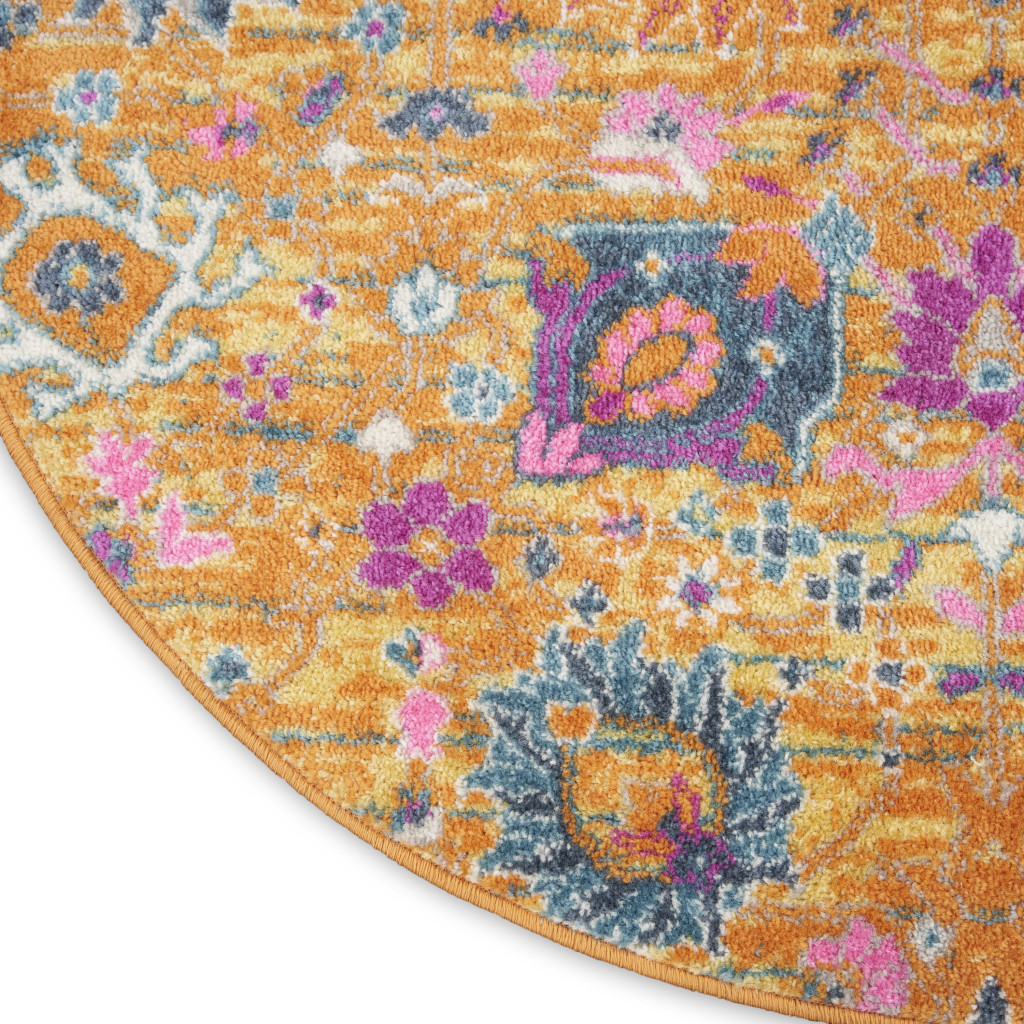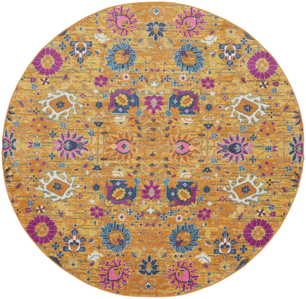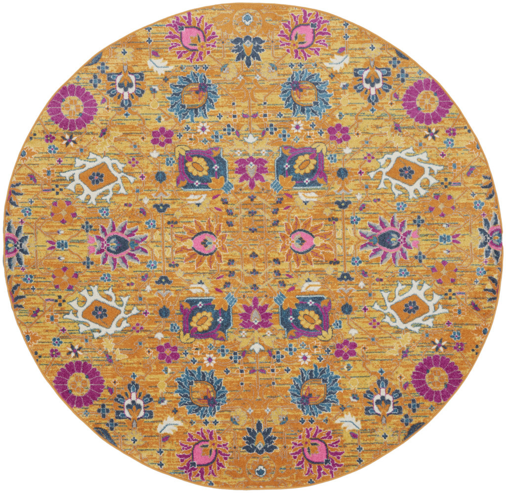 Add great coloration and comfortable texture to your space with this 8' gold round floral power loom area rug. This geometric round shaped rug features a floral pattern in gold that combines a good looking print with a unique and updated shape. The mix of shape, color, and design gives this rug refreshing visual interest. This superior Turkish rug represents the highest quality and is built to last. Place this area rug against a hardwood or tile floor and it will enliven your living space with style and sophistication. .50" H x 96.00" W x 96.00" D