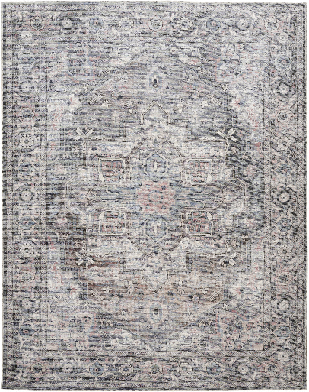 Set an inviting tone in your space with this 8' x 10' gray floral power loom distressed washable area rug. This rectangle shaped rug features a floral design in gray to give it visual interest. A classic shape marries with good looking design for your space This superior Turkish rug represents the highest quality and is built to last. Place this area rug against a hardwood or tile floor and it will enliven your living space with style and sophistication. .28" H x 94.00" W x 118.00" D