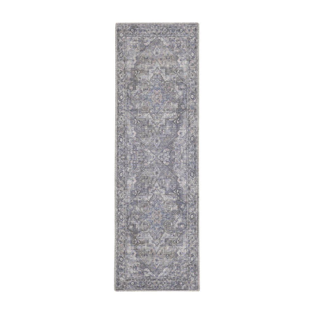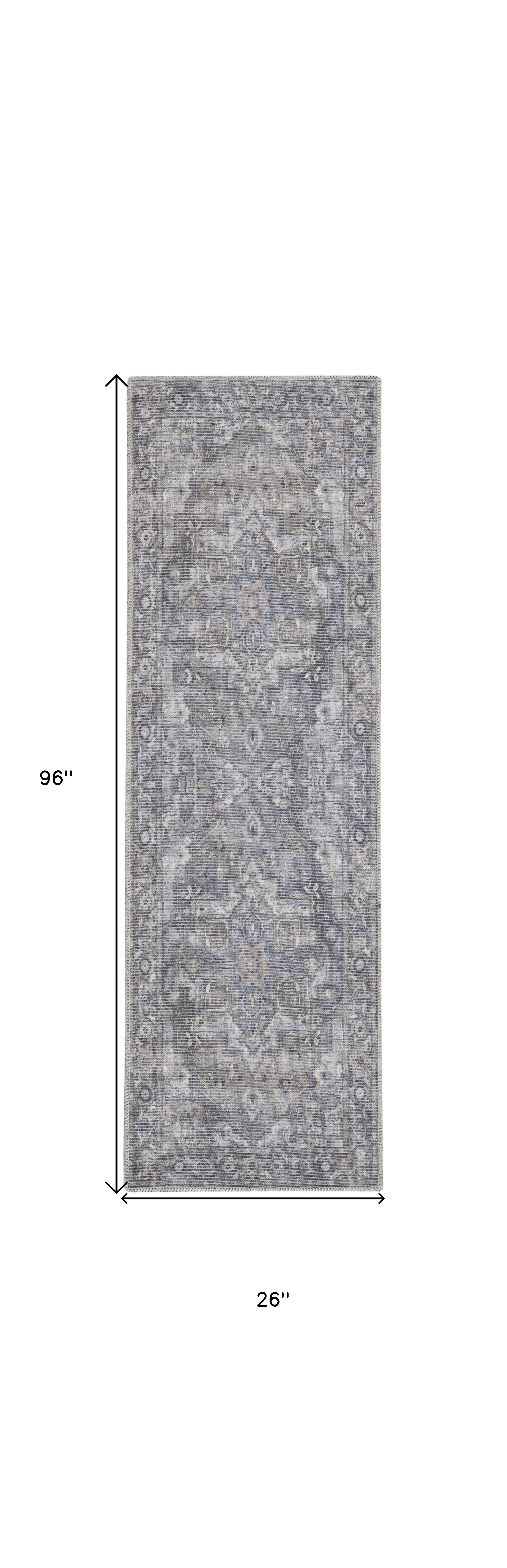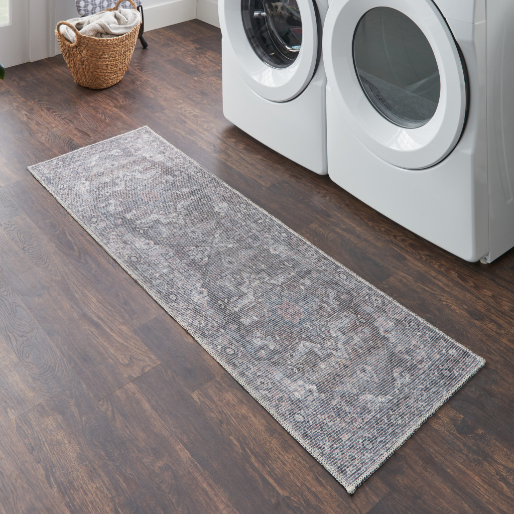 Add great coloration and comfortable texture to your space with this 8' gray floral power loom distressed washable runner rug. This runner shaped rug features a floral design in gray to give it visual interest. A classic shape marries with good looking design for your space Made in Turkey, this rug offers high quality combined with good looking designer sensibilities. Place this area rug against a hardwood or tile floor and it will enliven your living space with style and sophistication. .28" H x 26.00" W x 96.00" D