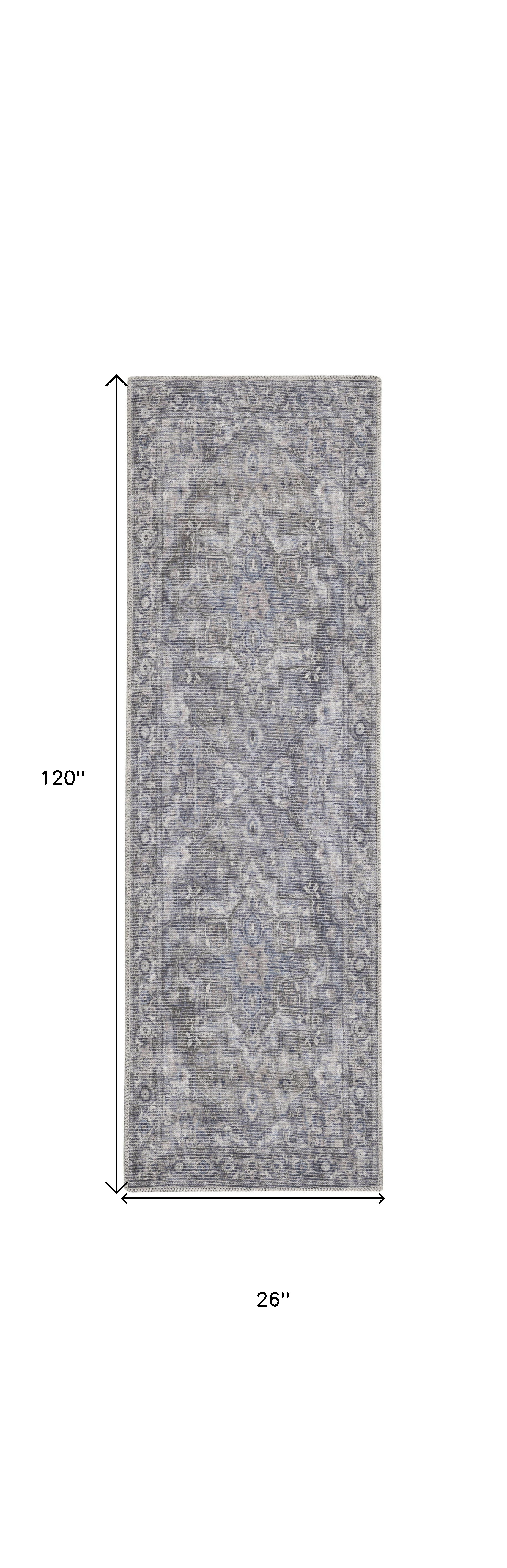 Add some artistry to your room with this 10' gray floral power loom distressed washable runner rug. This runner shaped rug features a floral design in gray to give it visual interest. A classic shape marries with good looking design for your space This superior Turkish rug represents the highest quality and is built to last. Area Rugs help to give warmth and sense of home to your space. .28" H x 26.00" W x 120.00" D