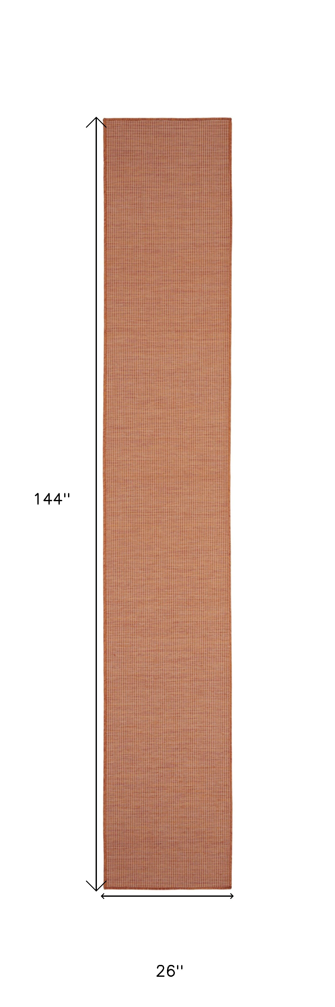 Add great coloration and comfortable texture to your space with this 12-foot terracotta indoor outdoor area rug. This runner shaped rug flaunts a terracotta color that will be a great way to accent your space. Solid colors are versatile and will blend with any existing decor style. Makes a great way to dress up your patio, porch, or poolside, but also works well as a durable and easy to maintain option in the kitchen, family room, or mudroom. 26-inch h x 144-inch w x 0.25-inch d.