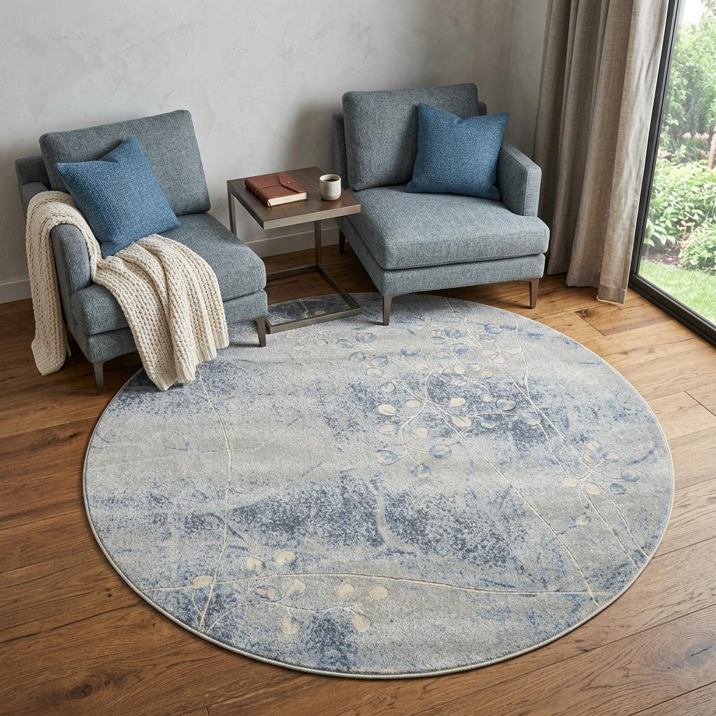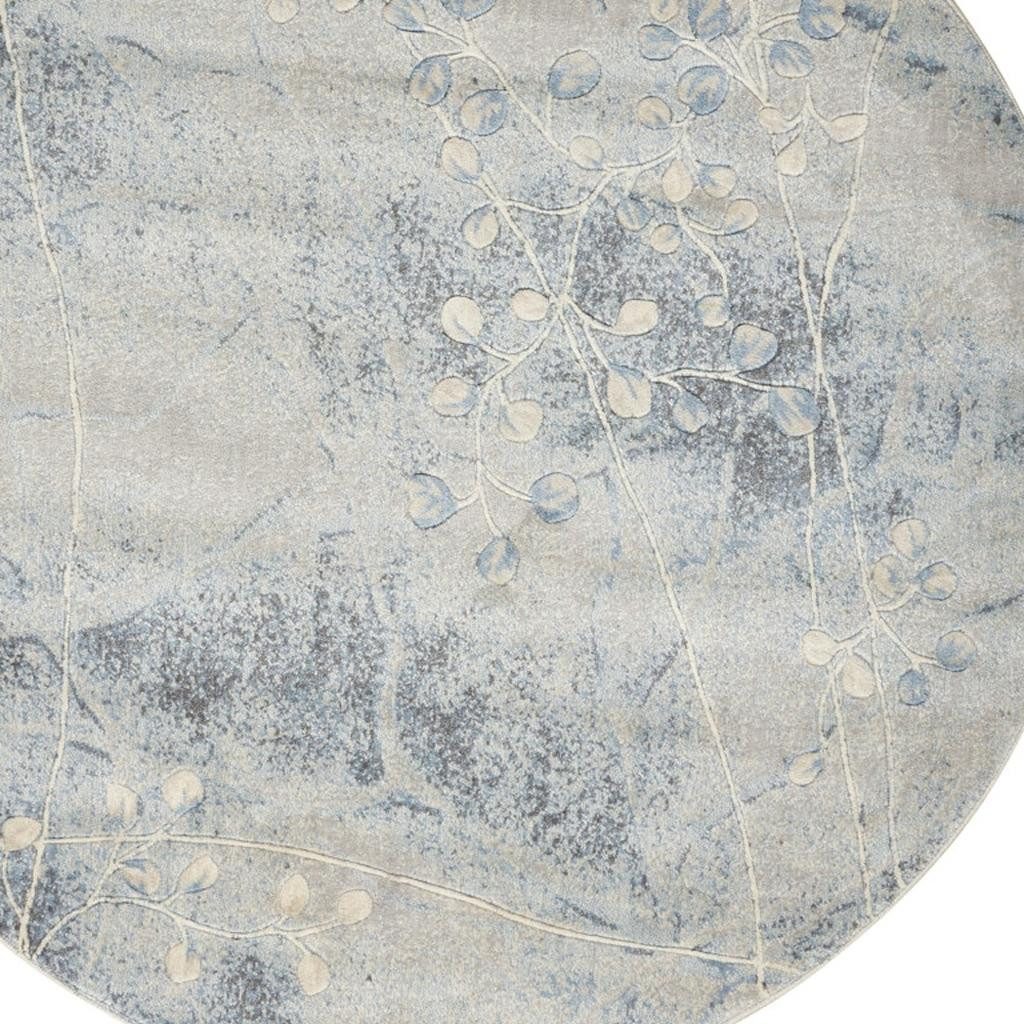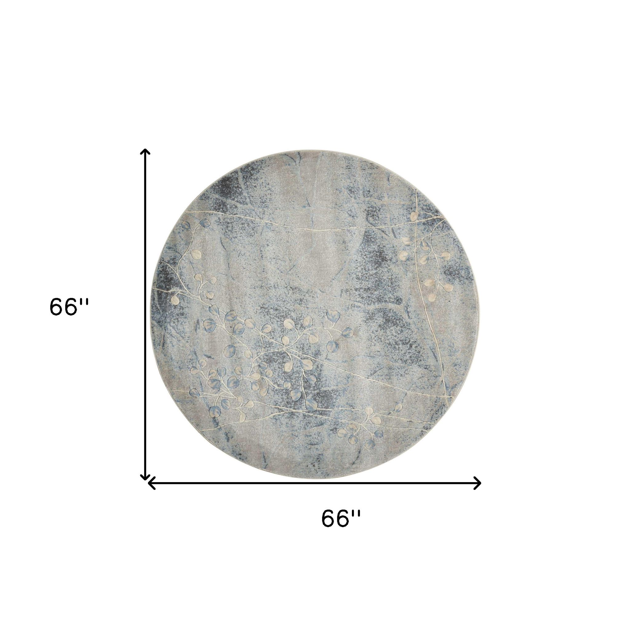 Add some artistry to your room with this 6' blue round floral power loom area rug. This geometric round shaped rug features a floral pattern in blue that combines a good looking print with a unique and updated shape. The mix of shape, color, and design gives this rug refreshing visual interest. Place this area rug against a hardwood or tile floor and it will enliven your living space with style and sophistication. .50" H x 66" W x 66" D