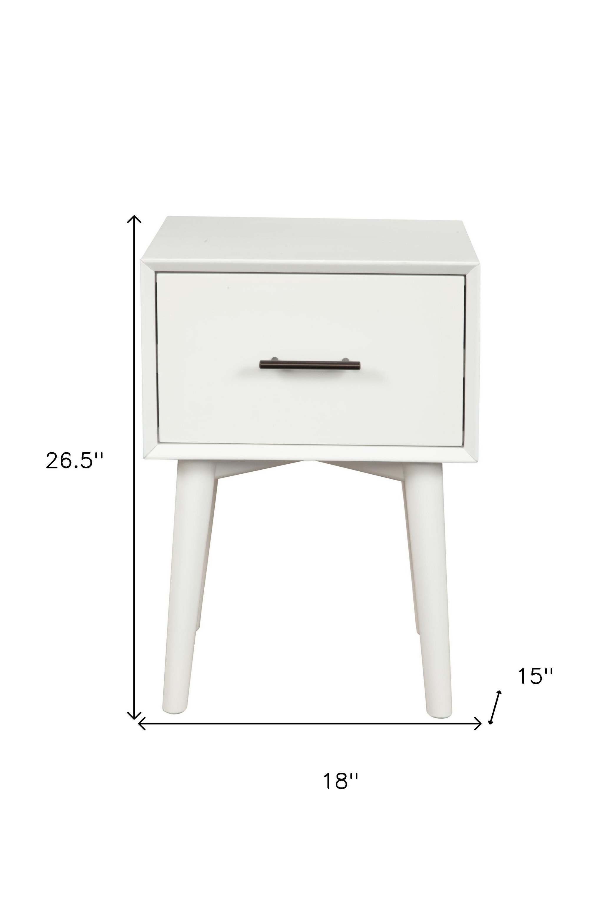 Distinctive in style the 27" white solid manufactured wood end table with drawer radiates a versatile charm. Made of solid manufactured wood, the white coloration throughout gives this piece an updated and refreshing look. Includes a single easy pull out drawer for handy storage of life's little essentials. A great accent on either side of the sofa or bed, this adorable end or side table is just what you need. You can also use it as an entryway table to hold your keys. 26.5" H x 18" W x 15" D