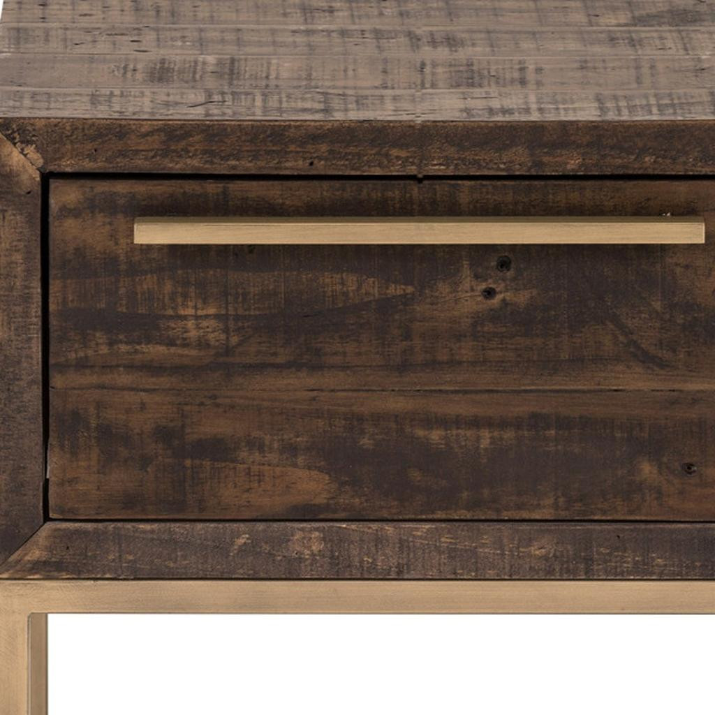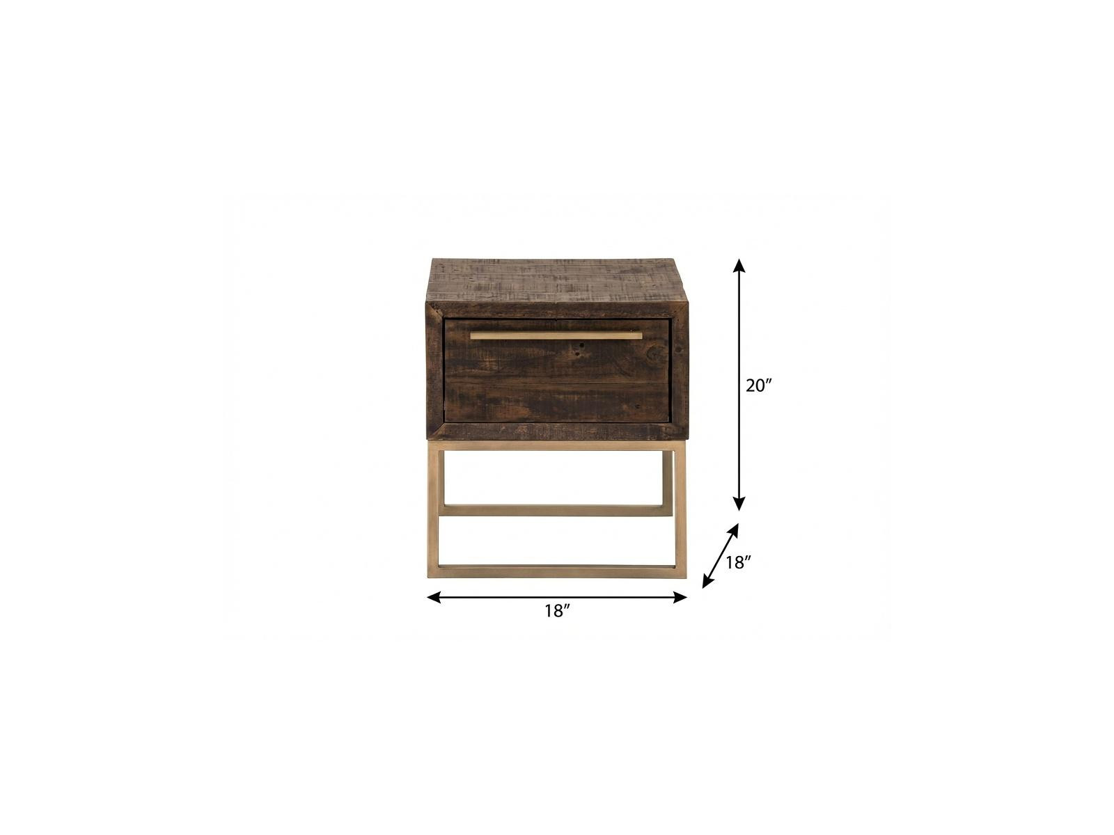 Show off your exquisite taste with this 18" antiqued brass and brown reclaimed wood end table with drawer. The base of this table is made from steel in a antiqued gold/brass color that is a nice contrast to the brown rustic reclaimed wood tabletop. Includes a single easy pull out drawer for handy storage of life's little essentials. Side tables are a great way to flank your sofa, use as an accent next to your favorite chair, or can even be used bedside. This versatile table is a great accent for most any room. 20" H x 18" W x 18" D