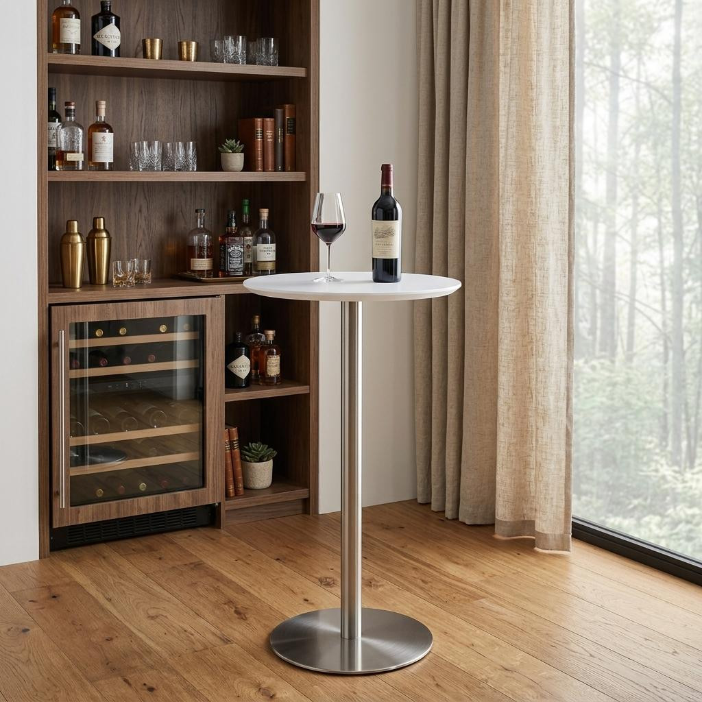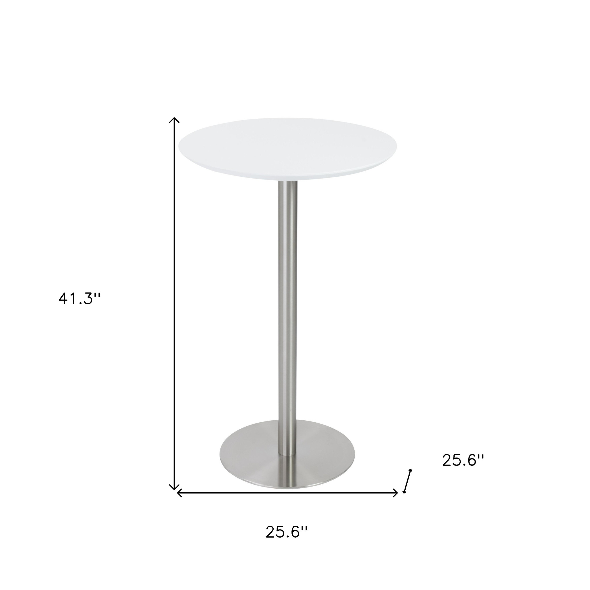 Elevate your dining experience with this modern 26-inch white and silver rounded steel bar table. Crafted with a sleek manufactured wood top in white and a sturdy steel base in silver with a glossy finish, this round table promises both style and durability. Its fixed mechanism and pedestal base type ensure stability for your bar or restaurant setting, making it a chic focal point for any space. Add a touch of contemporary charm with this elegant piece that effortlessly blends a clean white top with a metallic silver base, creating a sophisticated ambiance for your guests to enjoy. 41.3-inch h x 25.6-inch w x 25.6-inch d.