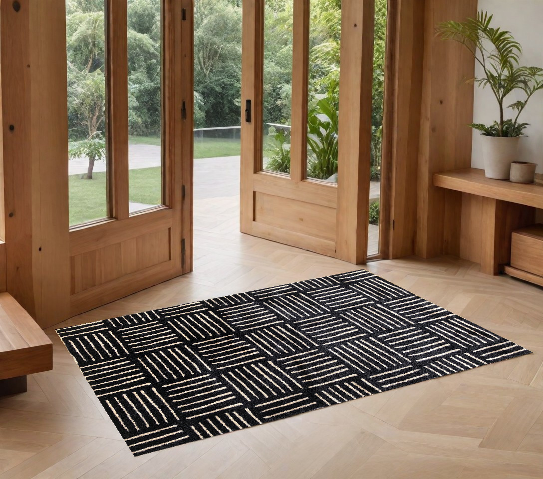 Add great coloration and comfortable texture to your space with this 2' x 4' black and off white abstract machine tufted washable area rug with UV protection. This rectangle shaped rug features a abstract design in black and off white to give it visual interest. A classic shape marries with good looking design for your space Ideal for spaces with kids and pets, this rug is stain resistant to help repel stains and spilled liquids. Area Rugs help to give warmth and sense of home to your space. 0.25" H x 27.5" W x 47" D