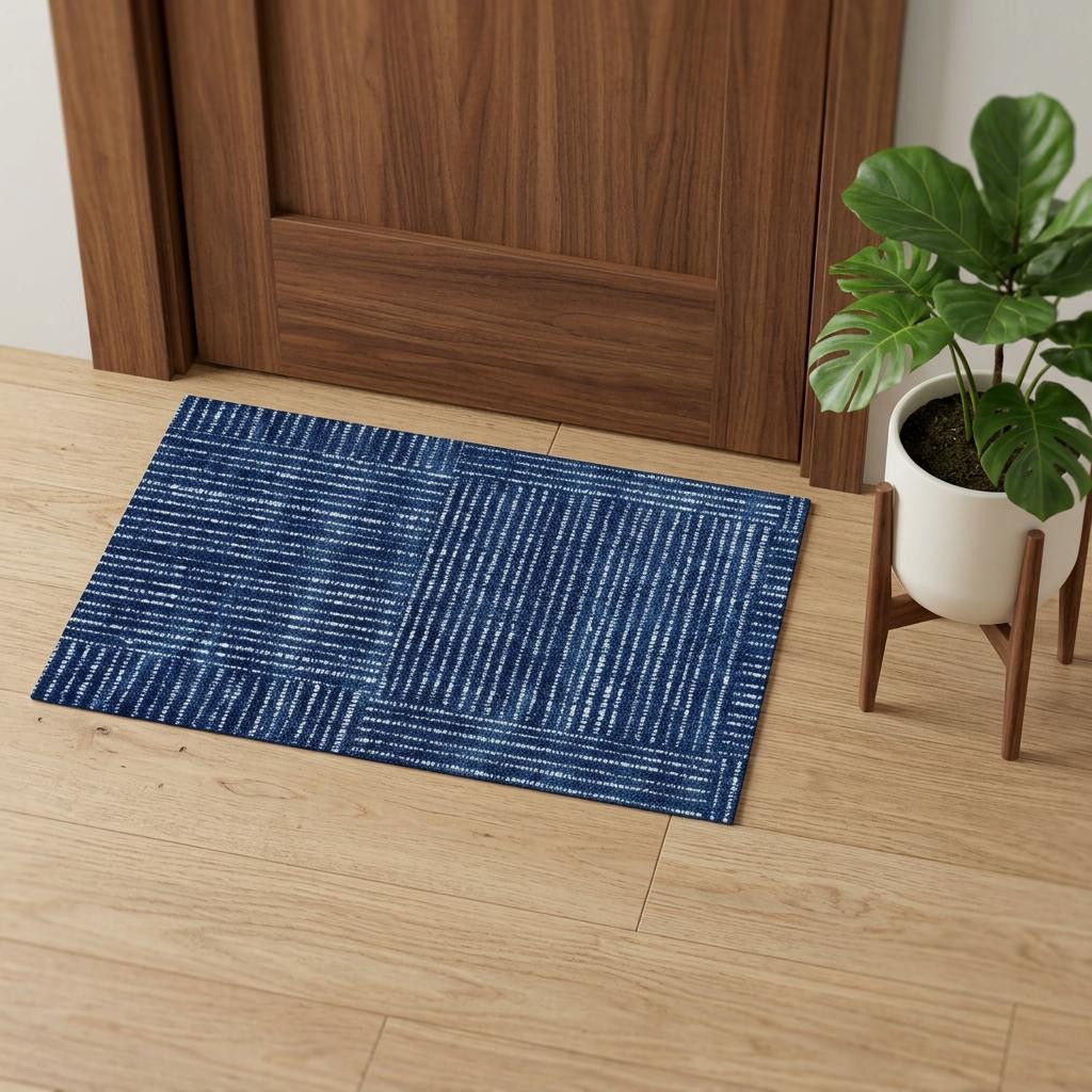Add great coloration and comfortable texture to your space with this 2' x 3' navy blue striped washable area rug with UV protection. This rectangle shaped rug features a modern striped design in navy blue and white to give it visual interest. A classic shape marries with good looking design for your space. Ideal for heavily trafficked spaces with kids and pets, this rug is stain resistant to help repel stains and spilled liquids. Area Rugs help to give warmth and sense of home to your space. 0.25" H x 20" W x 27.5" D