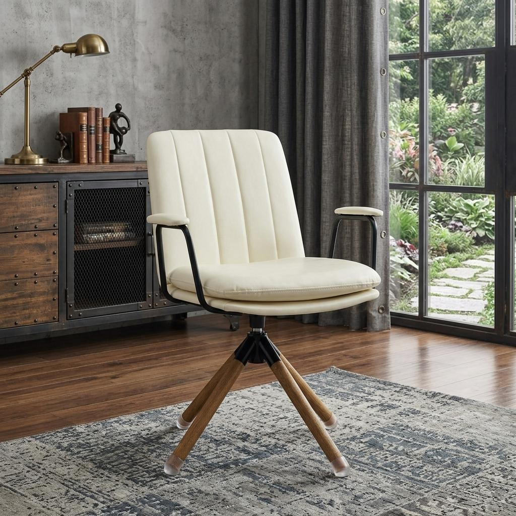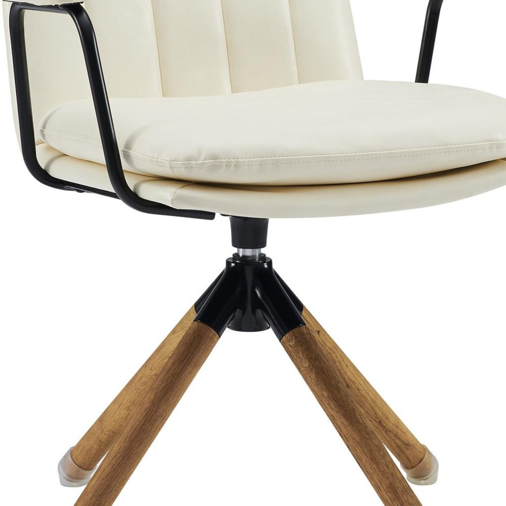 Unique and decorative, this 23" off white faux leather and brown swivel arm chair will leave a lasting impression. This gorgeous solid color off white arm chair is masterfully upholstered in durable faux leather. This chair features a swivel function so that you can turn and angle easily to interact with your space. 34.06" H x 23.3" W x 25.1" D