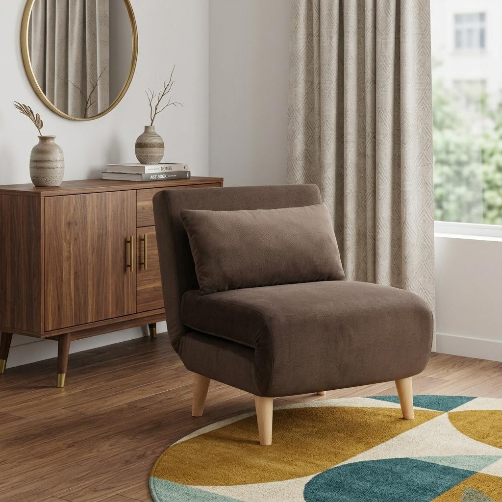 Add an air of fashion to your room and rejuvenate the space with this 27-inch brown and natural upholstered convertible chair and toss pillow. This sturdy 100% polyester upholstered convertible chair comes in a chic solid brown color to give your space just the right look. Giving the chair stability and structure, the inner frame is constructed with high quality solid wood and features a cushion back that comes complete with soft and comfortable cushioning. This versatile chair opens to a single sleeper. Comes complete with a decorative toss pillow to give the chair the perfect accent. 30.31-inch h x 26.77-inch w x 28.35-inch d.