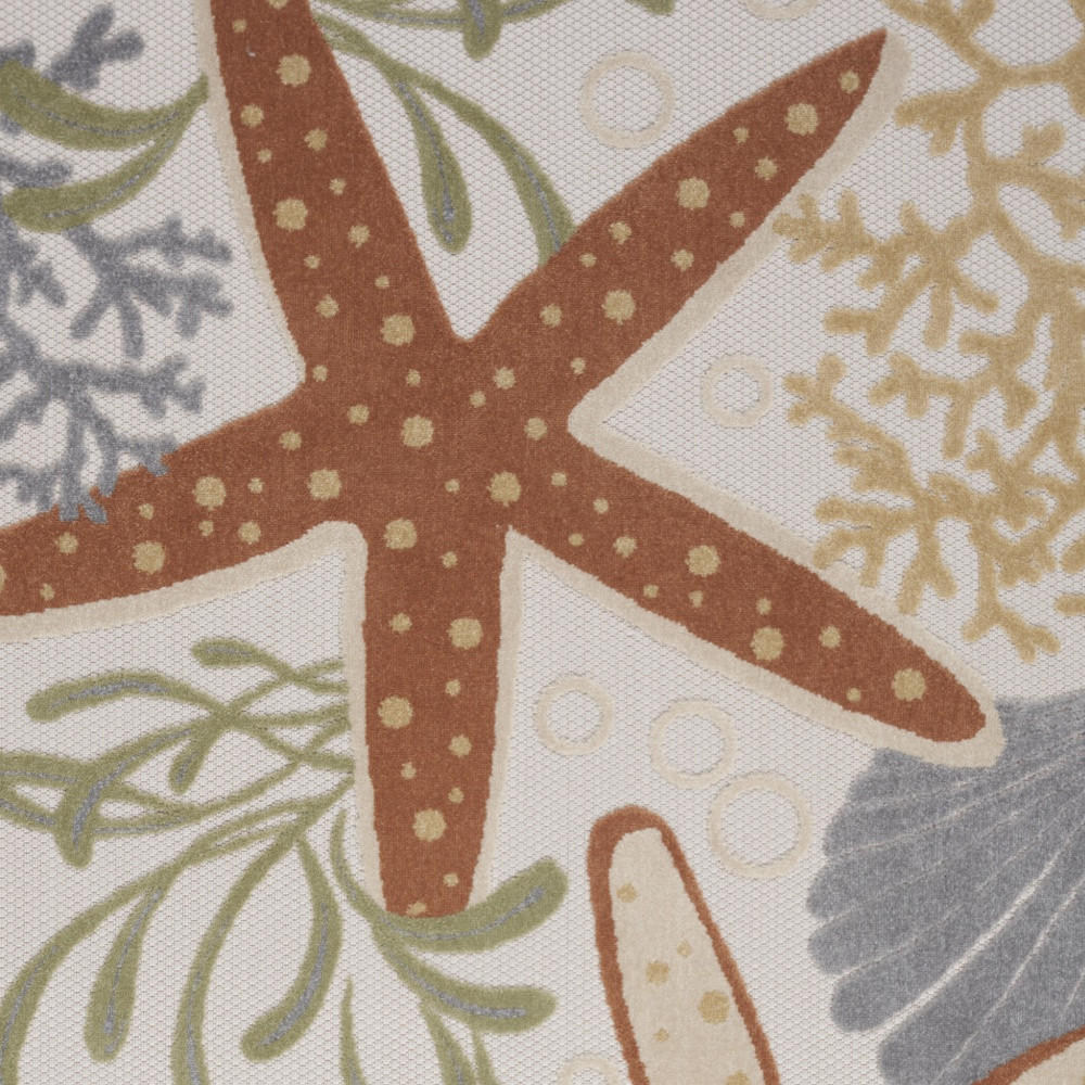 This 6-foot x 9-foot ivory orange and blue indoor outdoor area rug is a great way to add warmth to a room. Versatile in use, durable, and easy to maintain, this rug is an ideal solution to add a decorative and inviting touch to your indoor or outdoor space. Crafted through machine-made construction, this rectangle-shaped rug features a harmonious blend of colors that enhance any decor while providing comfort underfoot. Transform your space effortlessly with this stylish addition. 72-inch h x 108-inch w x 0.25-inch d.