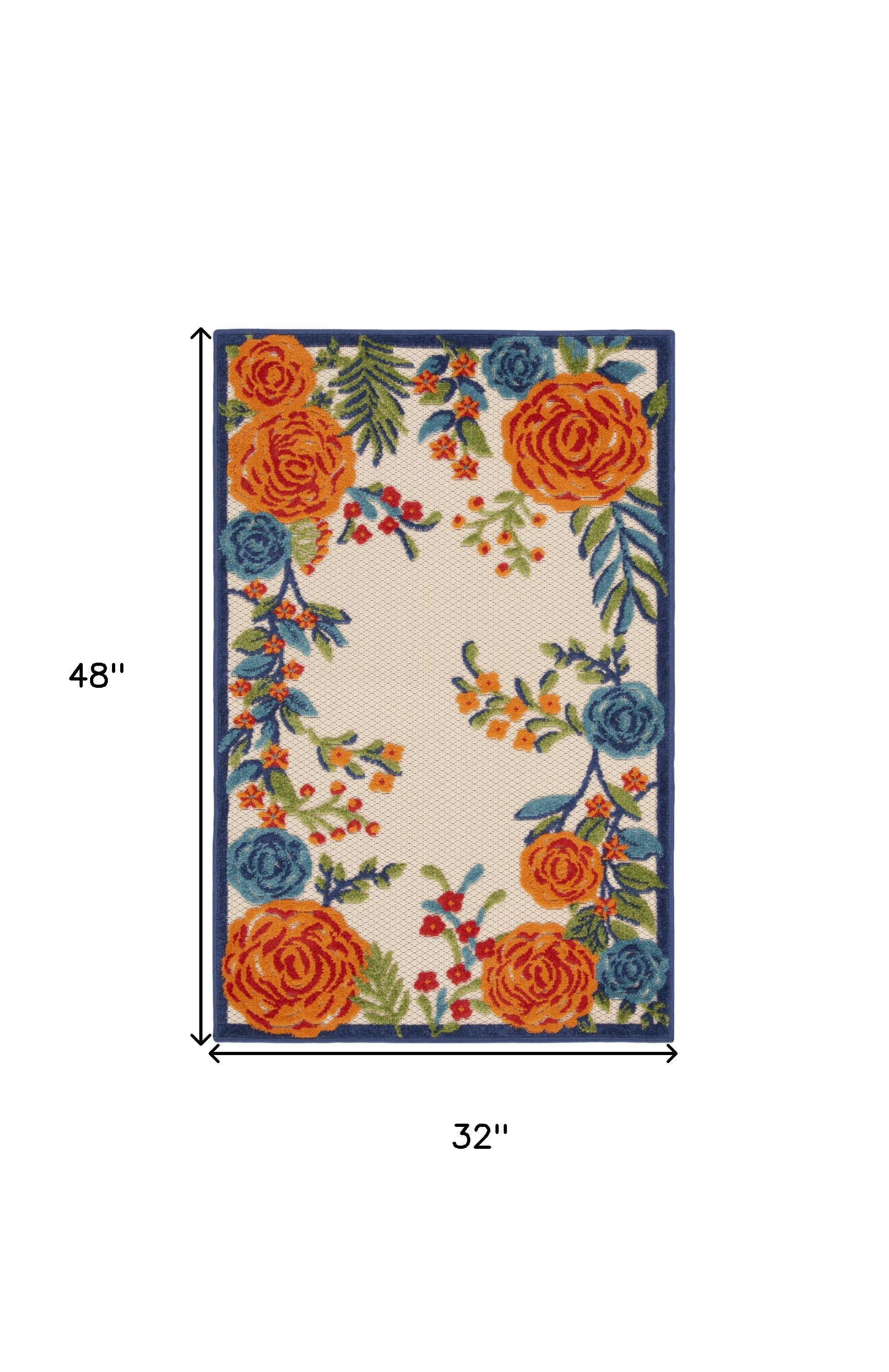 Set an inviting tone in your space with this 3-foot x 4-foot ivory orange and blue floral indoor outdoor area rug. This rectangle shaped rug features a floral design that will work well both indoors or out. A classic shape marries with good looking design for your living room, hall, bedroom, porch, patio, or poolside. Versatile in use, durable, and easy to maintain, this rug is an ideal solution to add a decorative and inviting touch to your indoor or outdoor space. 32-inch h x 48-inch w x 0.25-inch d.