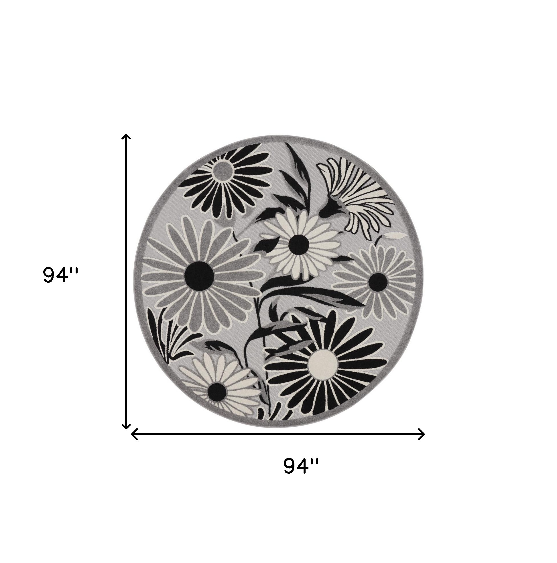 Add great coloration and comfortable texture to your space with this 8-foot black and white round floral indoor outdoor area rug. This geometric round shaped rug features a floral pattern in black and white that combines a good looking print with a unique and updated shape. The mix of shape, color, and design gives this rug refreshing visual interest. The coloration of this rug infuses an updated and modern vibe into your space. Makes a great way to dress up your patio, porch, or poolside, but also works well as a durable and easy to maintain option in the kitchen, family room, or mudroom. 94-inch h x 94-inch w x 0.25-inch d.