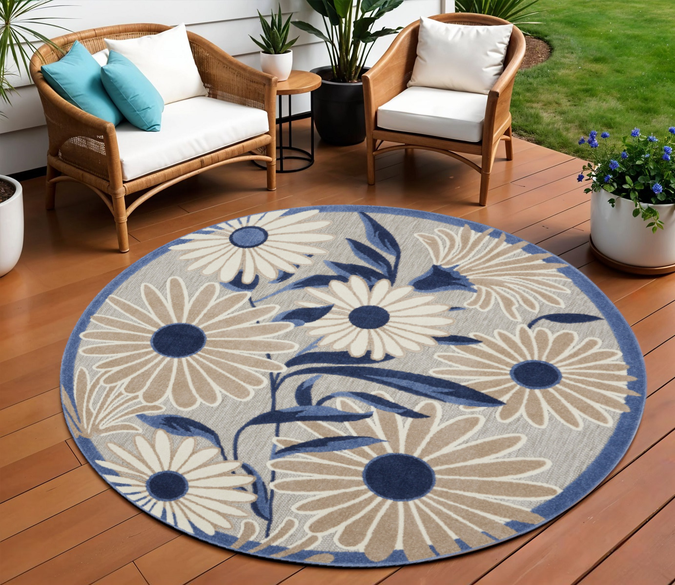 floral indoor outdoor area rug, indoor outdoor area rug, outdoor area rug, blue gray round floral indoor, gray round floral indoor outdoor |