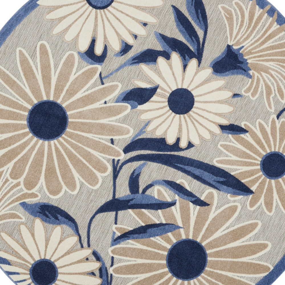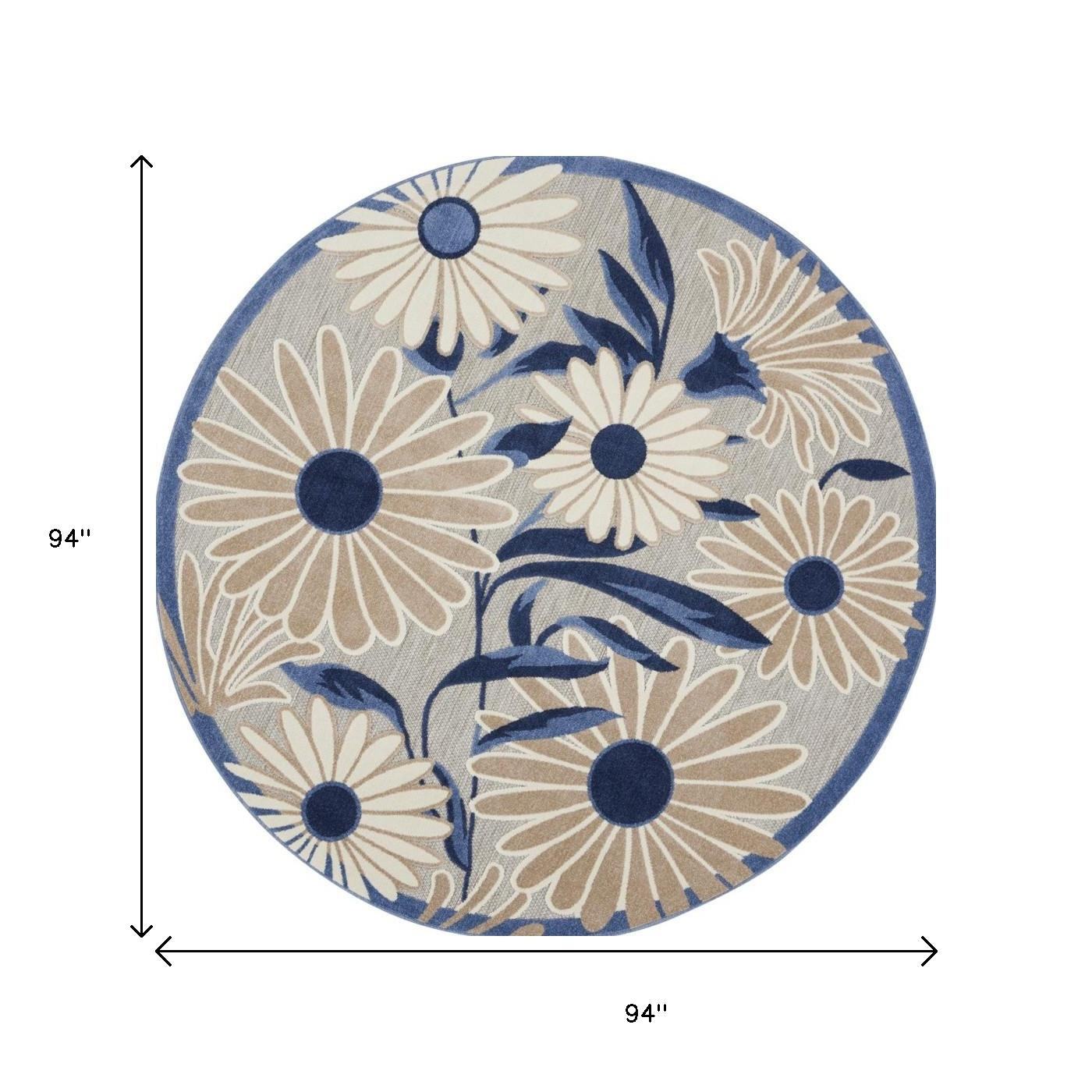 Set an inviting tone in your space with this 8-foot blue and gray round floral indoor outdoor area rug. This geometric round shaped rug features a floral pattern in blue and gray that combines a good looking print with a unique and updated shape. The mix of shape, color, and design gives this rug refreshing visual interest. Makes a great way to dress up your patio, porch, or poolside, but also works well as a durable and easy to maintain option in the kitchen, family room, or mudroom. 94-inch h x 94-inch w x 0.25-inch d.