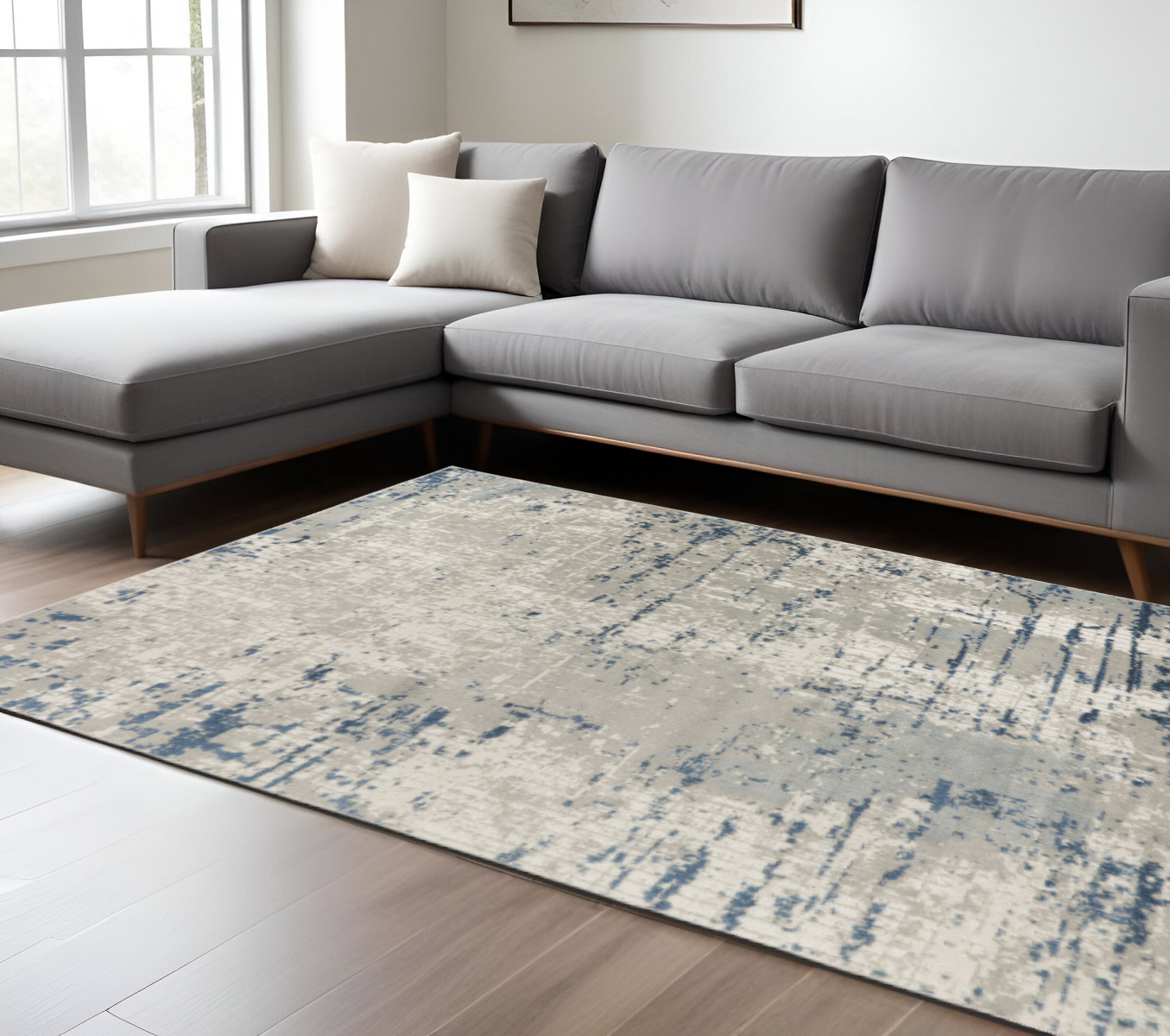 Add great coloration and comfortable texture to your space with this 10-foot x 14-foot ivory gray and blue abstract distressed area rug. Built to last, this rug crafted from polypropylene and polyester fibers is known for its durability and long lasting appeal. Rugs are a great way to showcase your style, hide imperfections, warm your home and reduce noise. This larger sized, modern styled rug is ready to create a focal point or statement piece in your room. 120-inch h x 168-inch w x 0.32-inch d.