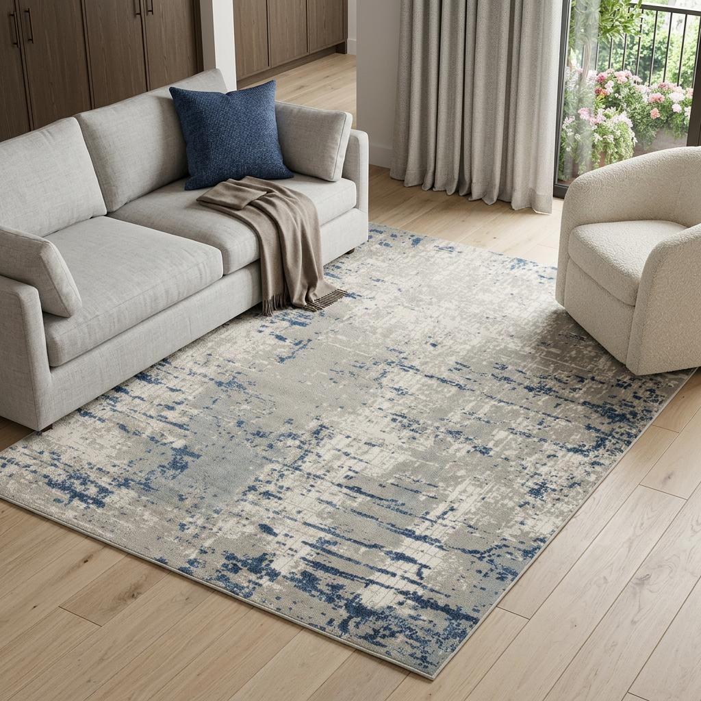 Add some artistry to your room with this 7' x 10' blue and gray abstract power loom area rug. This rectangle shaped rug features a abstract design in blue and gray to give it visual interest. A classic shape marries with good looking design for your space This superior Turkish rug represents the highest quality and is built to last. Place this area rug against a hardwood or tile floor and it will enliven your living space with style and sophistication. .32" H x 79.00" W x 114.00" D