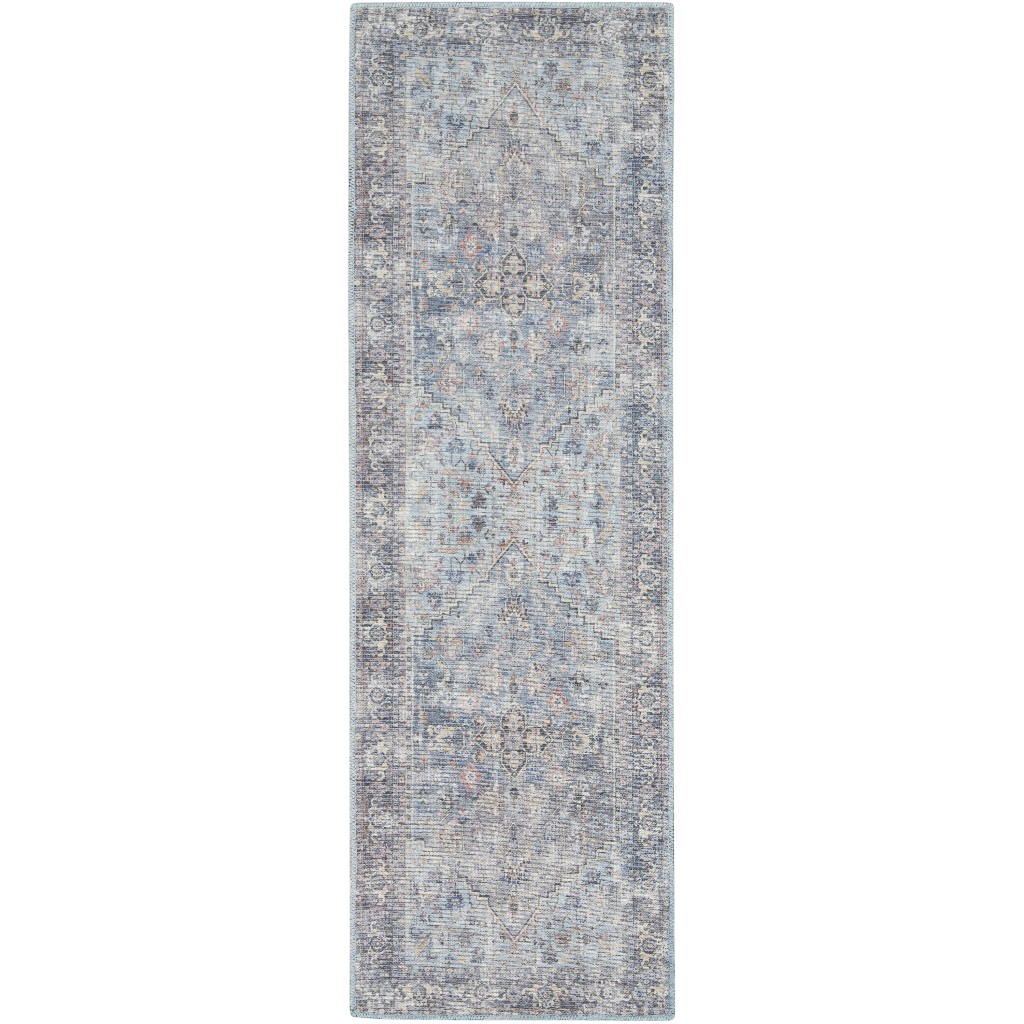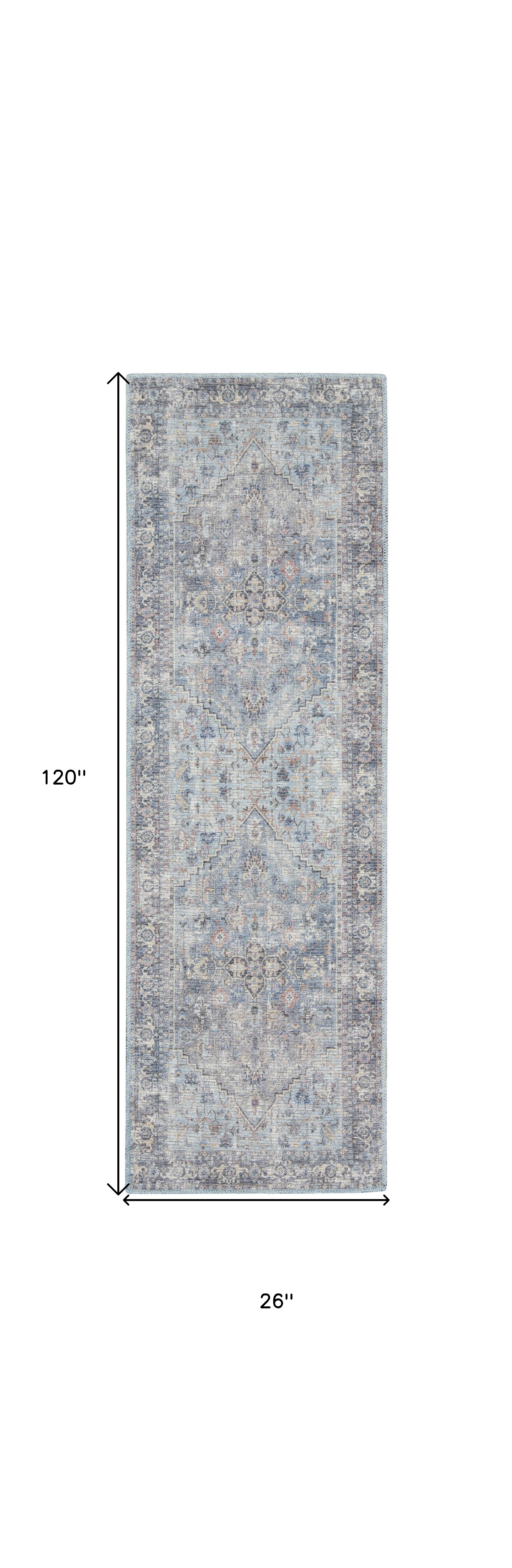 This 10-foot gray floral power loom distressed washable runner rug, is a great way to add warmth to a room. This runner shaped rug features a oriental design in blue and gray to give it visual interest. A classic shape marries with good looking design for your space area rugs help to give warmth and sense of home to your space. 26-inch H x 120-inch W x 0.28-inch D