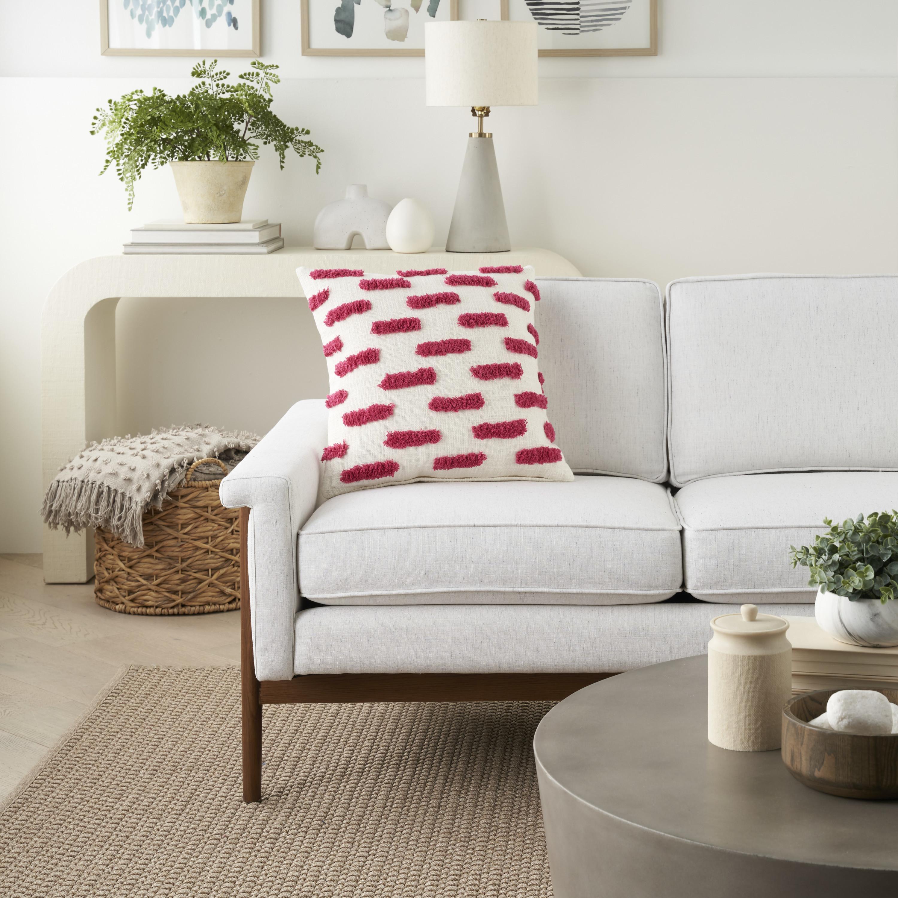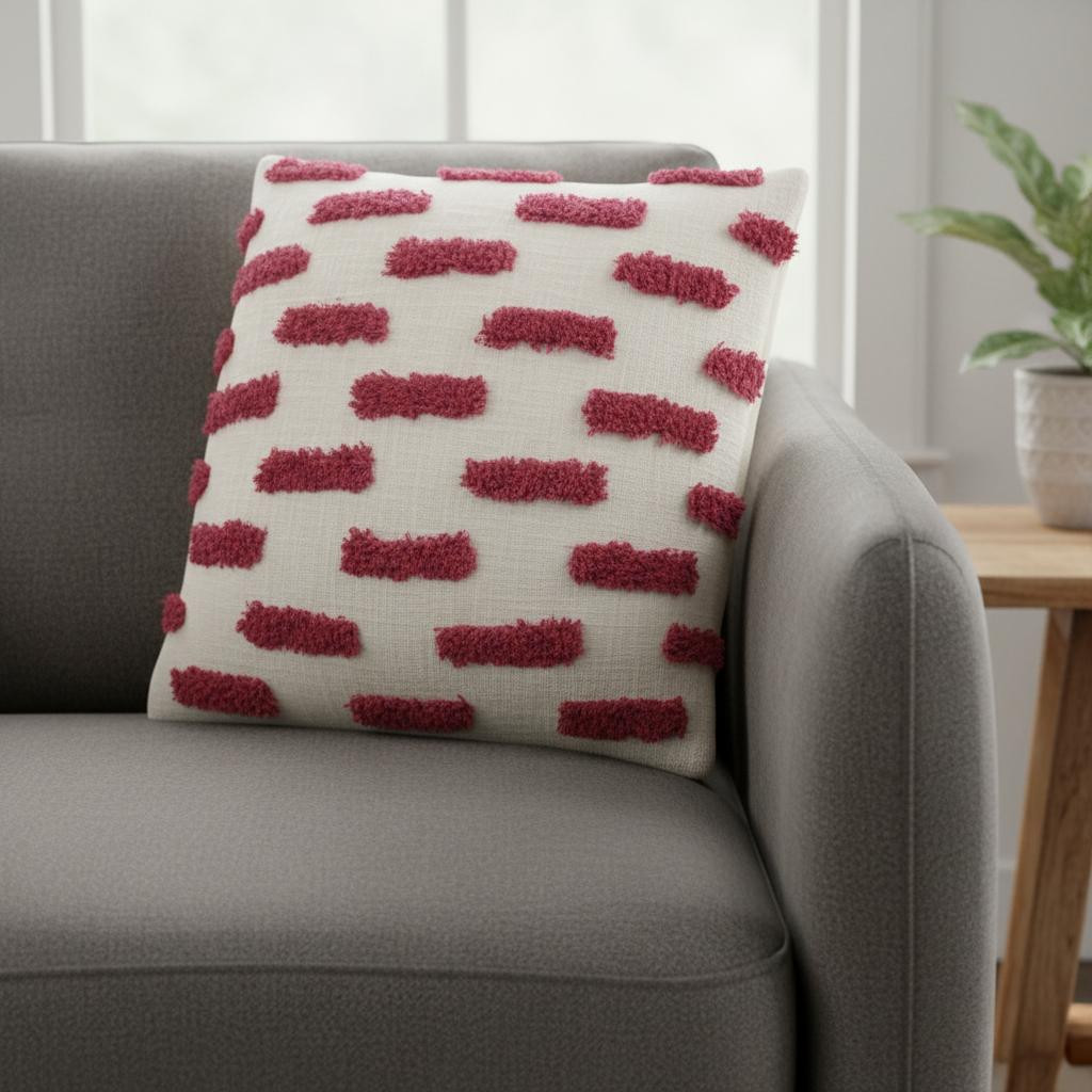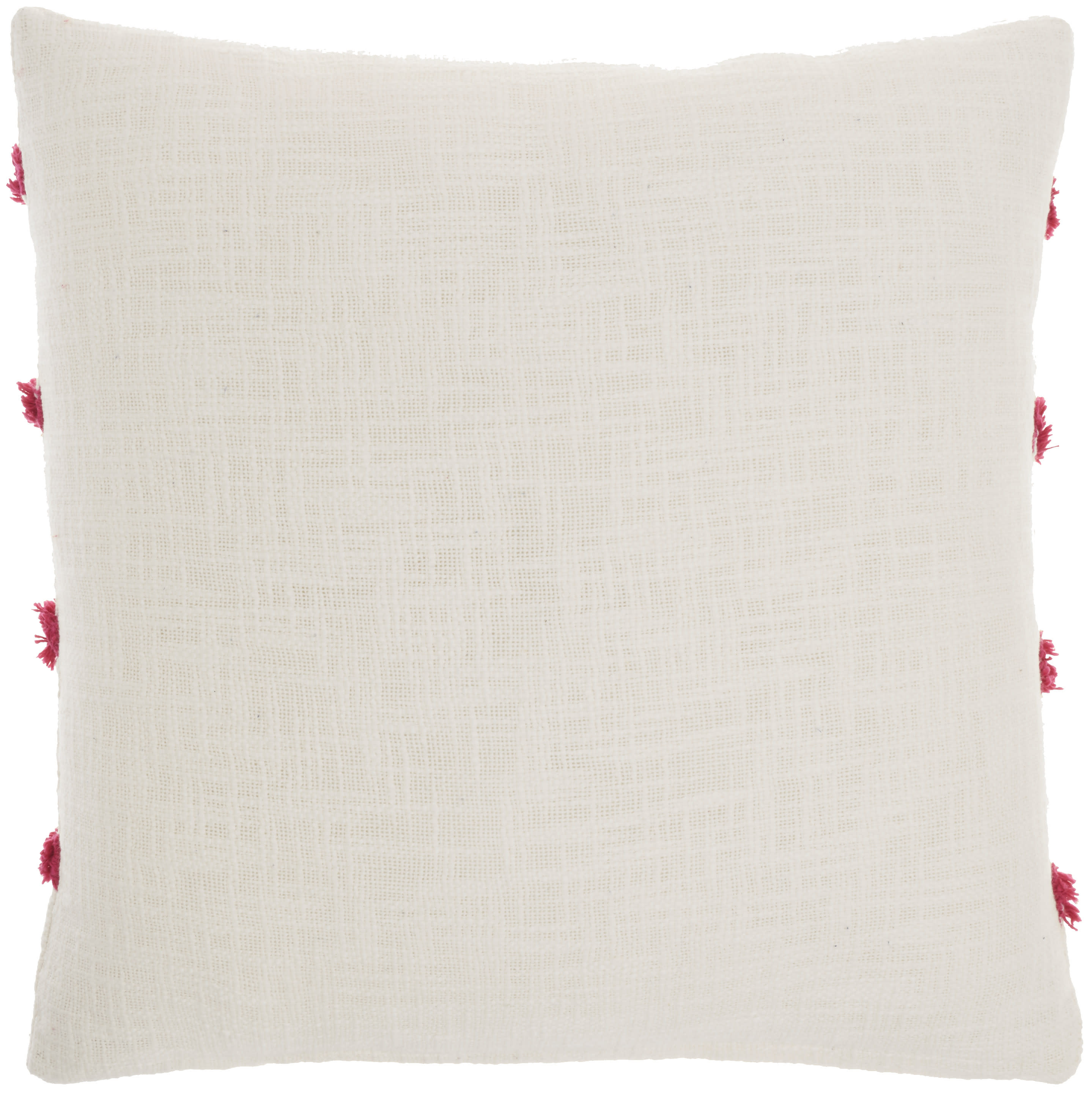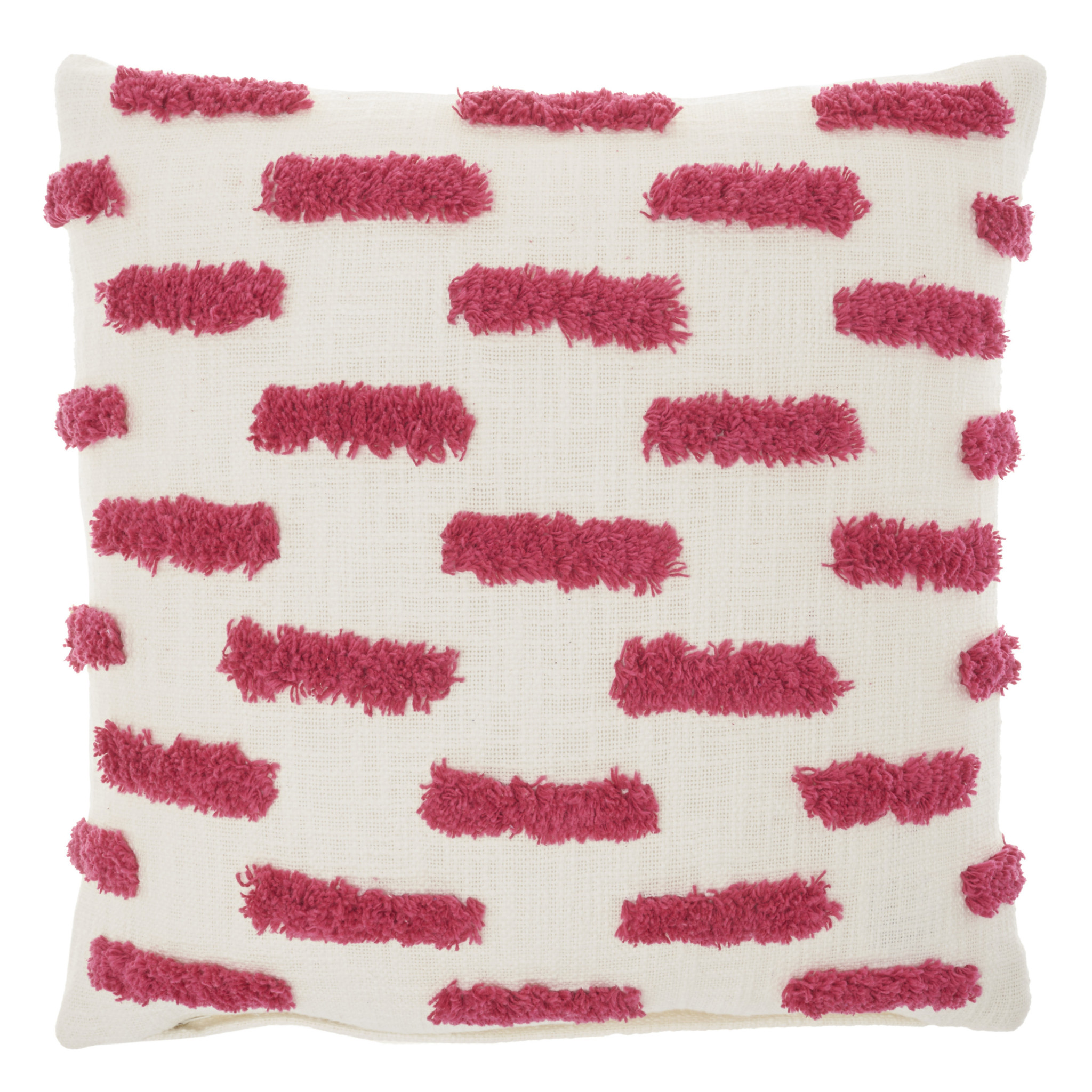 Unique and decorative, this comfortable 18-inch pink and white geometric cotton throw pillow will leave a lasting impression. The pink and white coloring of the extremely durable and long lasting cotton will add dimension and texture to your space. This soft polyester filled pillow not only is decorative but made to be comfy and cozy all day long. Decorative throw pillows not only add color and dimension to your space but can be comfy and supportive when you are lounging and cuddling as well. Decorative pillows are a great way to change up the look and feel of your space easily and quickly. 18-inch H x 18-inch W x 5-inch D