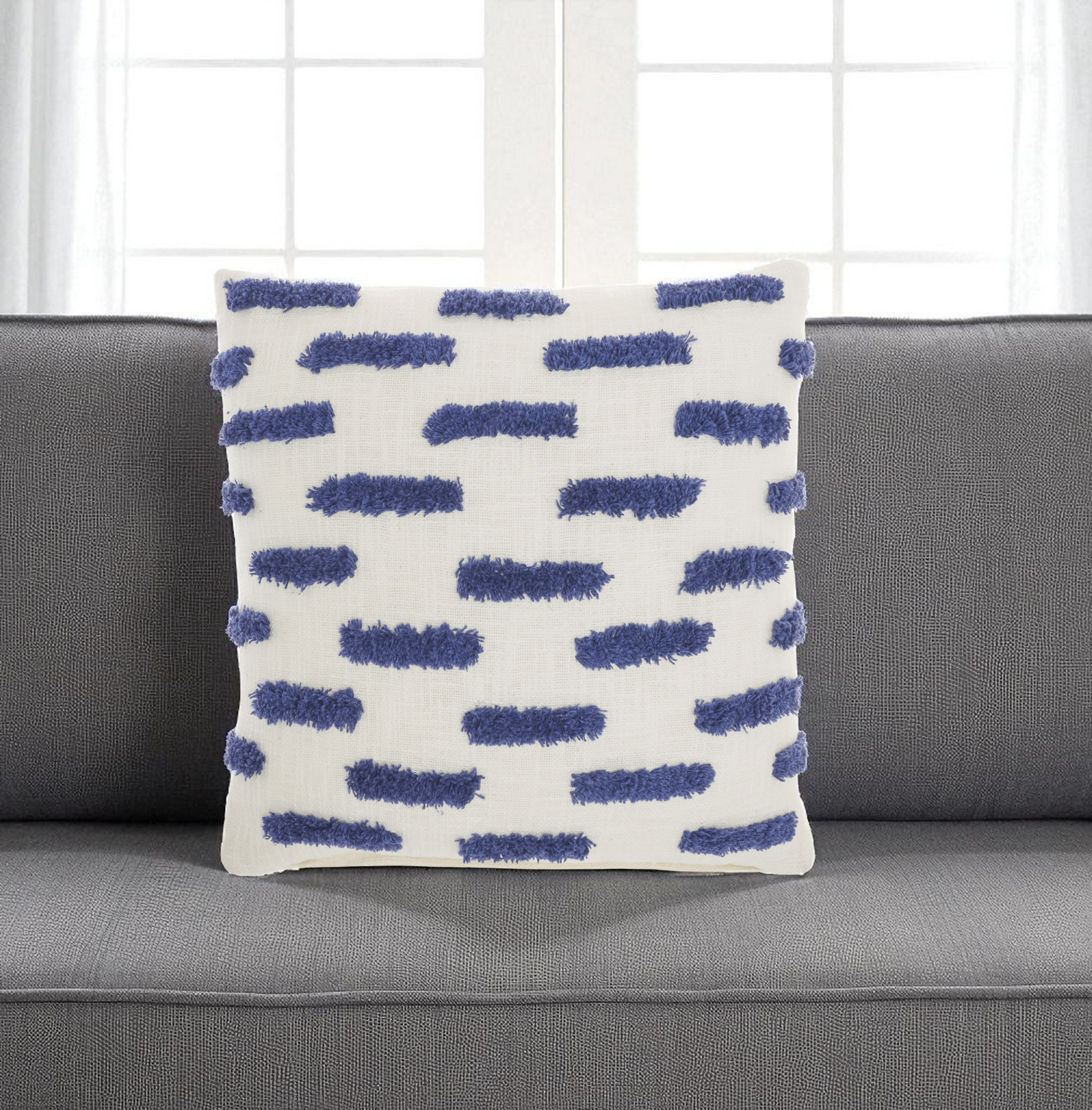 Unique and decorative, this comfortable 18-inch blue and white geometric cotton throw pillow will leave a lasting impression. This blue and white hued piece represents quality construction, expertly made from durable cotton that is not only long lasting but soft to the touch as well. This soft polyester filled pillow not only is decorative but made to be comfy and cozy all day long. Decorative throw pillows not only add color and dimension to your space but can be comfy and supportive when you are lounging and cuddling as well. A great decorative accessory for your favorite chair, to accent your sofa, or to use as part of your bed ensemble. 18-inch H x 18-inch W x 5-inch D