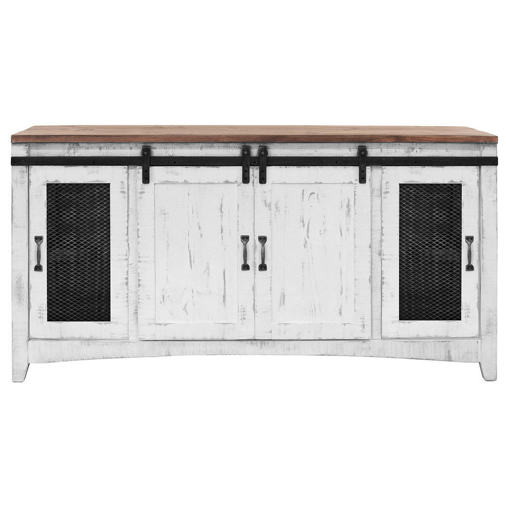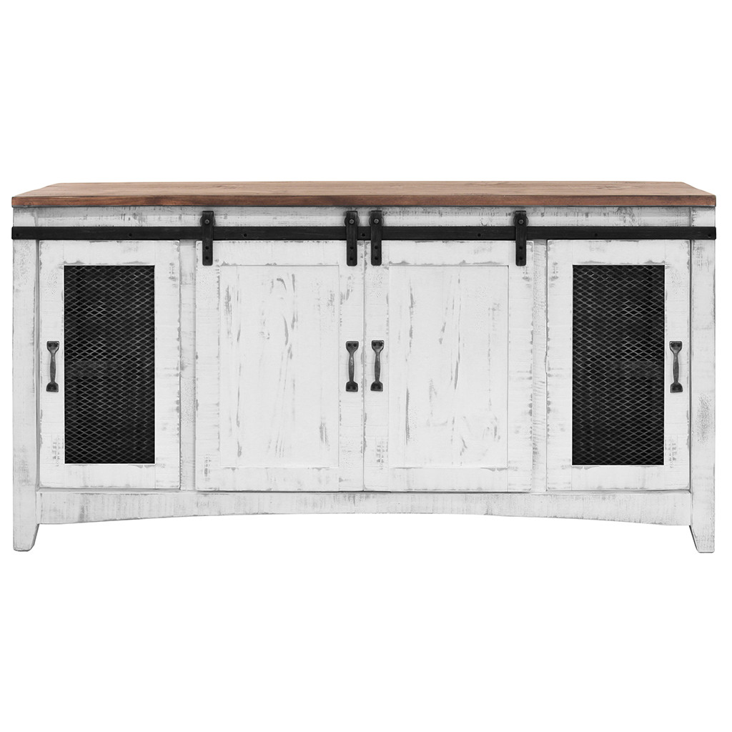 Make a true home theater of your room with this captivating 68" white solid wood cabinet enclosed storage distressed tv stand. Curated from a mix of high quality solid pine wood and durable manufactured wood, this console is beautiful, and built to last. Due to the genuine nature of the wood some natural wood knots, and grain and color variations may occur. S Built-in cable and wire management helps to keep those unseamly wires at bay. Ideal for tv placement and storage in your living room, bedroom or office. 34.75" H x 67.75" W x 19" D