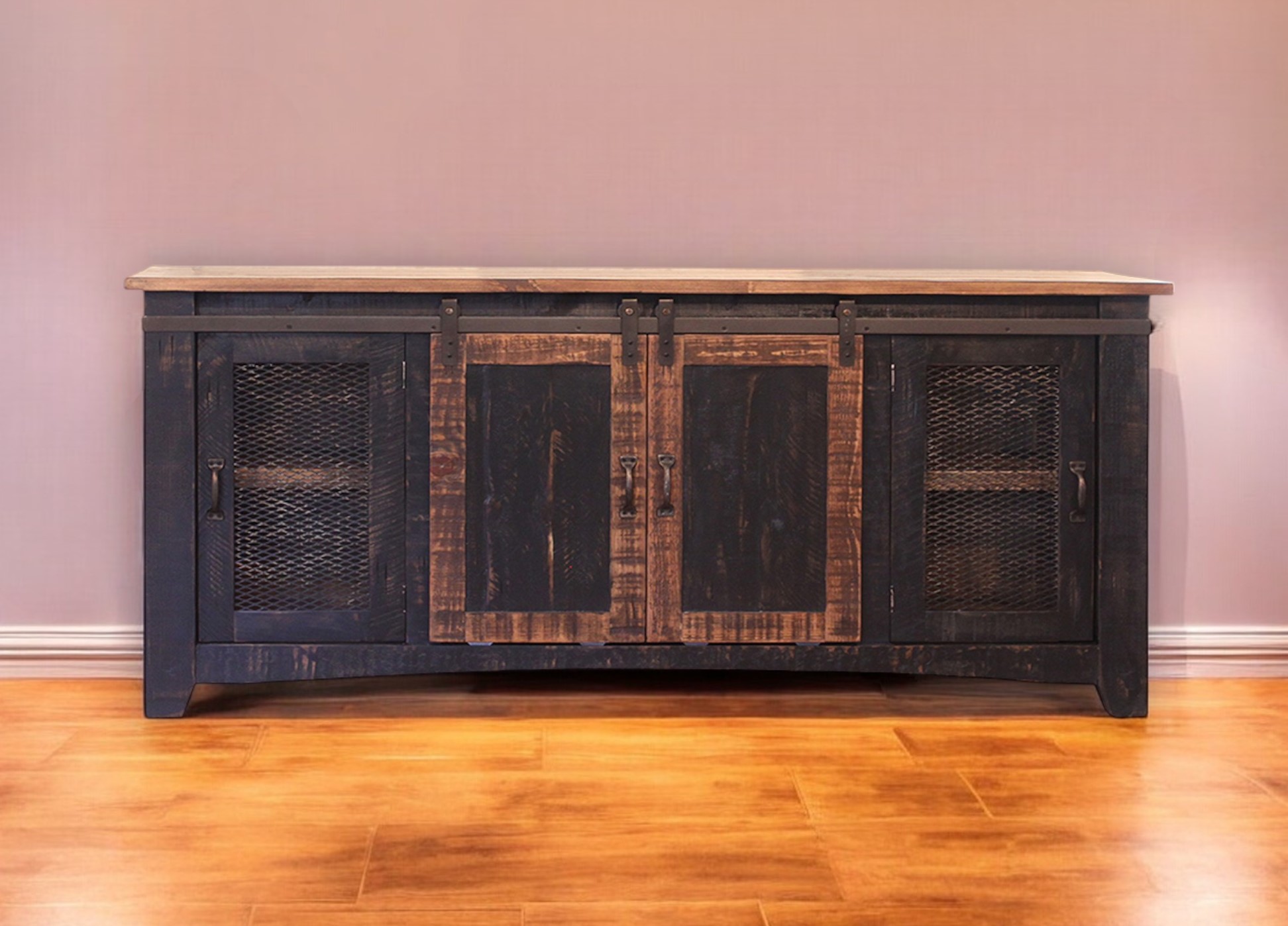 Create the ultimate blend of style, function, and design with this 70" black solid wood cabinet enclosed storage distressed tv stand. Curated from high quality solid pine wood, this console is natural, beautiful, and built to last. Due to the genuine nature of the wood some natural wood knots, and grain and color variations may occur. L Built-in cable and wire management helps to keep those unseamly wires at bay. Ideal for tv placement and storage in your living room, bedroom or office. 34.75" H x 70" W x 19" D