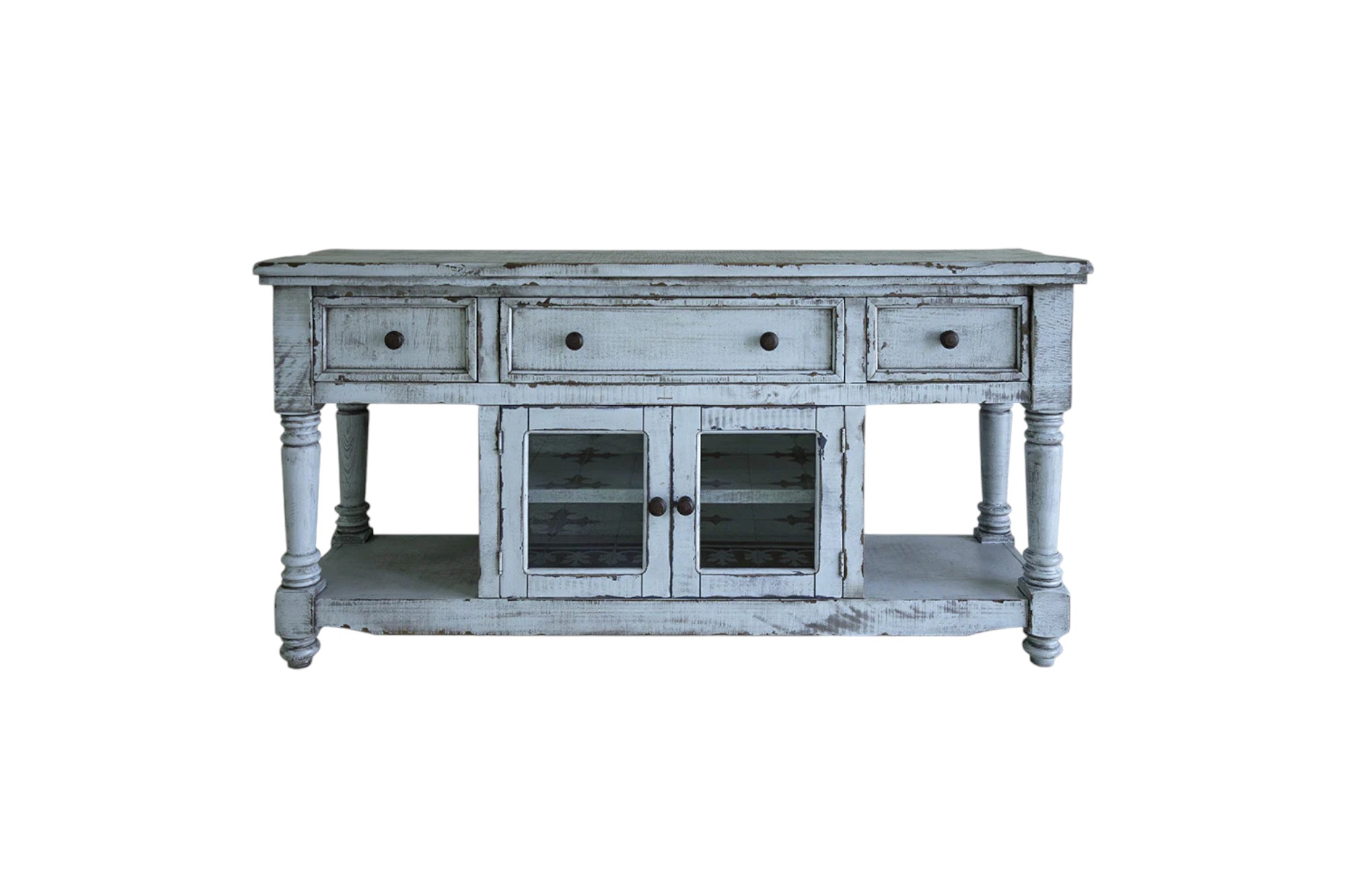 Ready to be enjoyed in your living room, family room, or recreation room, this 70" blue solid wood open shelving distressed tv stand is a practical and good looking piece of furniture that will help to anchor your room. Curated from high quality solid mango wood, this console is natural, beautiful, and built to last. Due to the genuine nature of the wood some natural wood knots, and grain and color variations may occur. E To add to the versatility, this piece features open non-concealed storage that can be used for not only storage but display as well. A cord cut out hole is ideal for wire and cable managment to keep your space looking tidy. Convert your room into a special place with your favorite collectibles and TV accessories that is suitable for living room, bedroom, or office. 34.75" H x 70" W x 19" D
