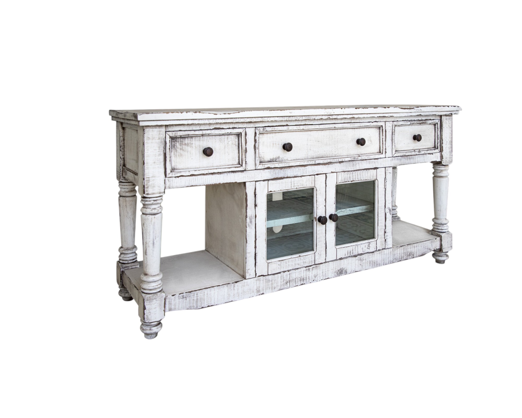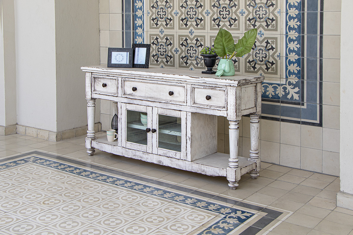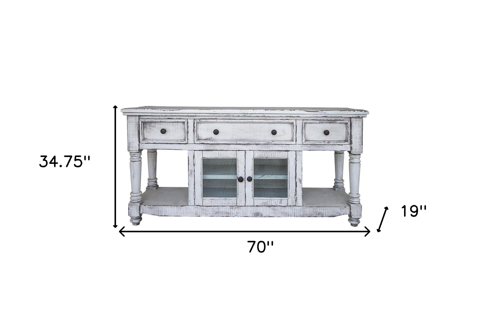 Practical, space saving, and good looking, this 70" white solid wood open shelving distressed tv stand is a versatile media storage solution. Curated from a mix of high quality solid mango wood and durable manufactured wood, this console is beautiful, and built to last. Due to the genuine nature of the wood some natural wood knots, and grain and color variations may occur. V To add to the versatility, this piece features open non-concealed storage that can be used for not only storage but display as well. A cord cut out hole is ideal for wire and cable managment to keep your space looking tidy. Ideal for tv placement and storage in your living room, bedroom or office. 34.75" H x 70" W x 19" D