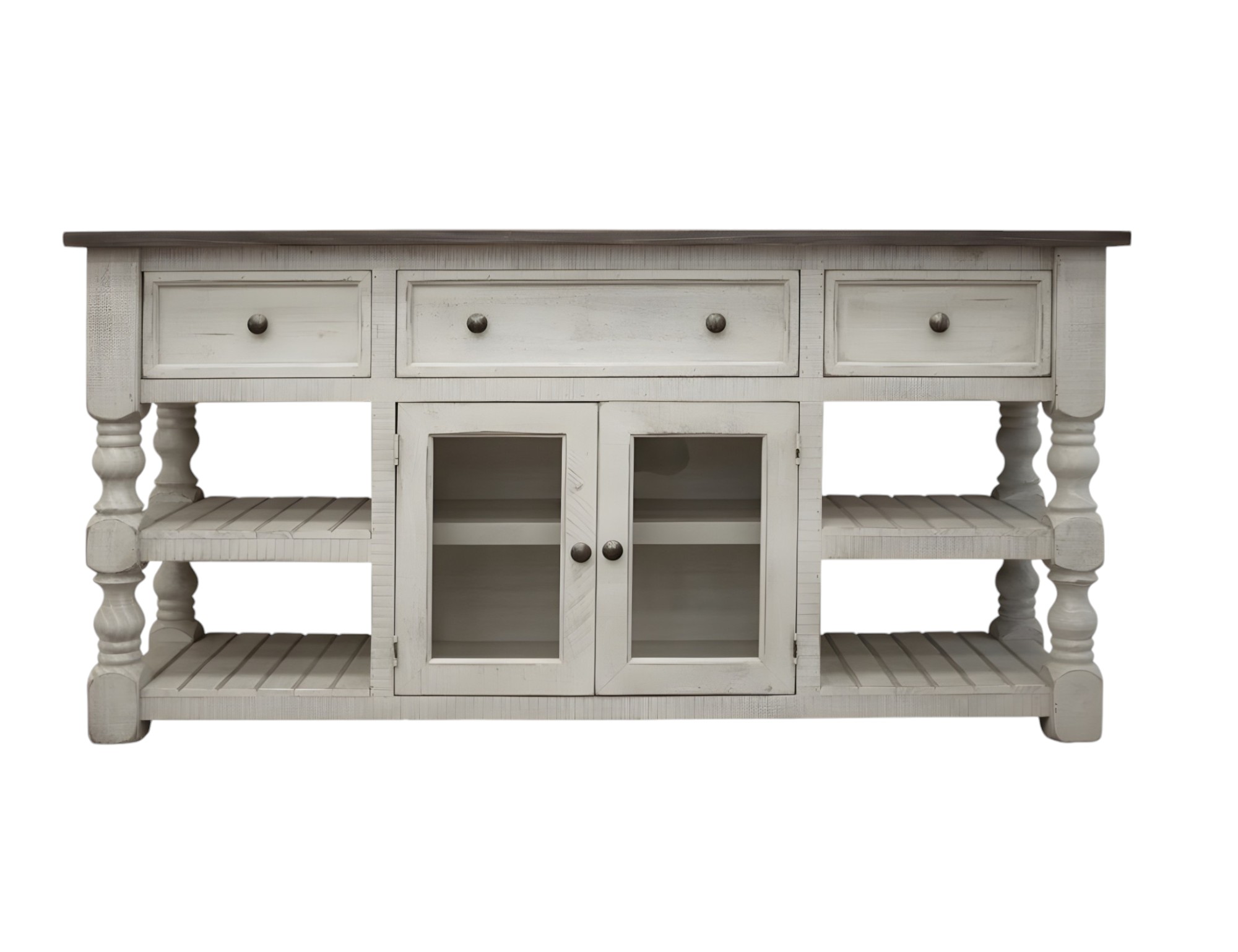Practical, space saving, and good looking, this 81" ivory solid wood open shelving distressed tv stand is a versatile media storage solution. Curated from a mix of high quality solid pine wood and durable manufactured wood, this console is beautiful, and built to last. Due to the genuine nature of the wood some natural wood knots, and grain and color variations may occur. To add to the versatility, this piece features open non-concealed storage that can be used for not only storage but display as well. A cord cut out hole is ideal for wire and cable managment to keep your space looking tidy. Convert your room into a special place with your favorite collectibles and TV accessories that is suitable for living room, bedroom, or office. 34.75" H x 80.75" W x 19" D
