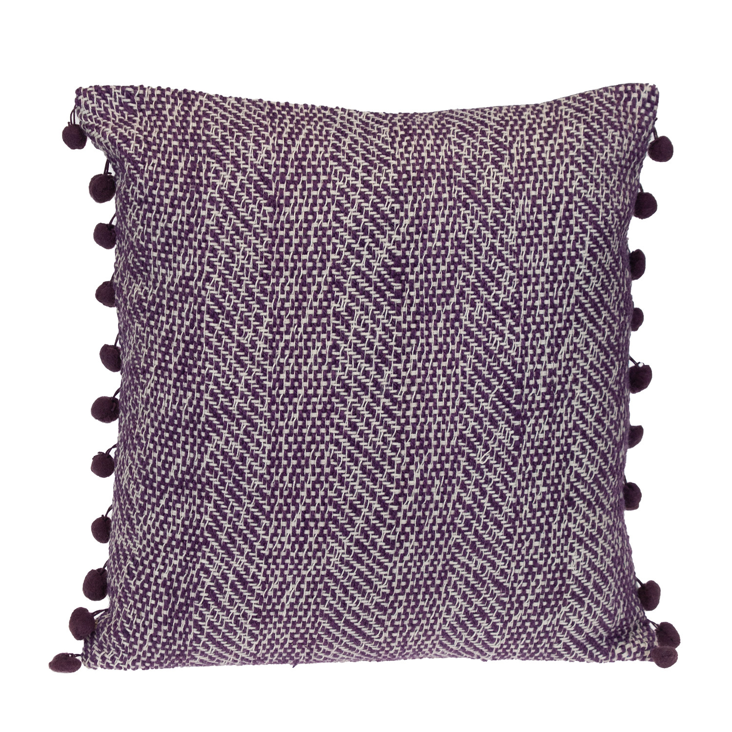 The 18-inch purple and white weave cotton throw pillow with pom poms is the perfect decorative accessory for your home. This purple and white colored decorative pillow is made from high grade cotton that is durable and long lasting. Super soft and built to hold its shape, this polyfill pillow is a great option. For anyone that loves to decorate or accent their space with color and texture. A great decorative accessory for your favorite chair, to accent your sofa, or to use as part of your bed ensemble. 18-inch H x 18-inch W x 7-inch D