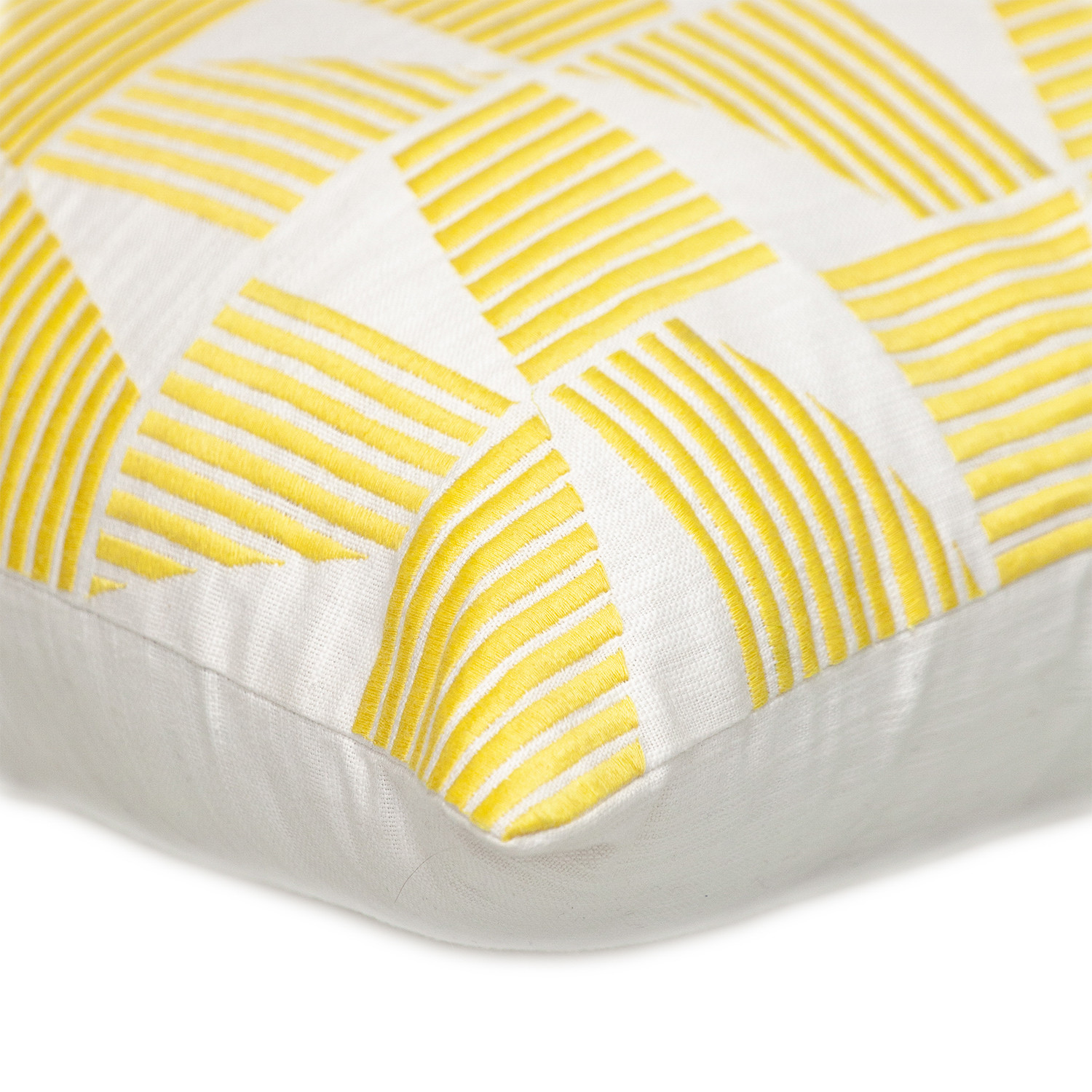 Unique and decorative, this comfortable 18-inch yellow and white geometric cotton throw pillow with embroidery will leave a lasting impression. This yellow and white hued piece represents quality construction, expertly made from durable cotton that is not only long lasting but soft to the touch as well. Super soft and built to hold its shape, this polyfill pillow is a great option. For anyone that loves to decorate or accent their space with color and texture. A great decorative accessory for your favorite chair, to accent your sofa, or to use as part of your bed ensemble. 18-inch H x 18-inch W x 7-inch D