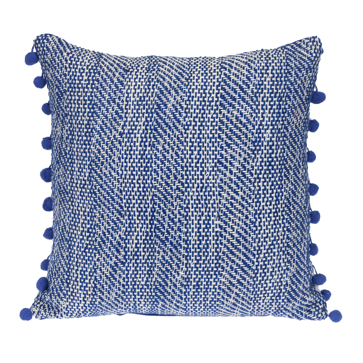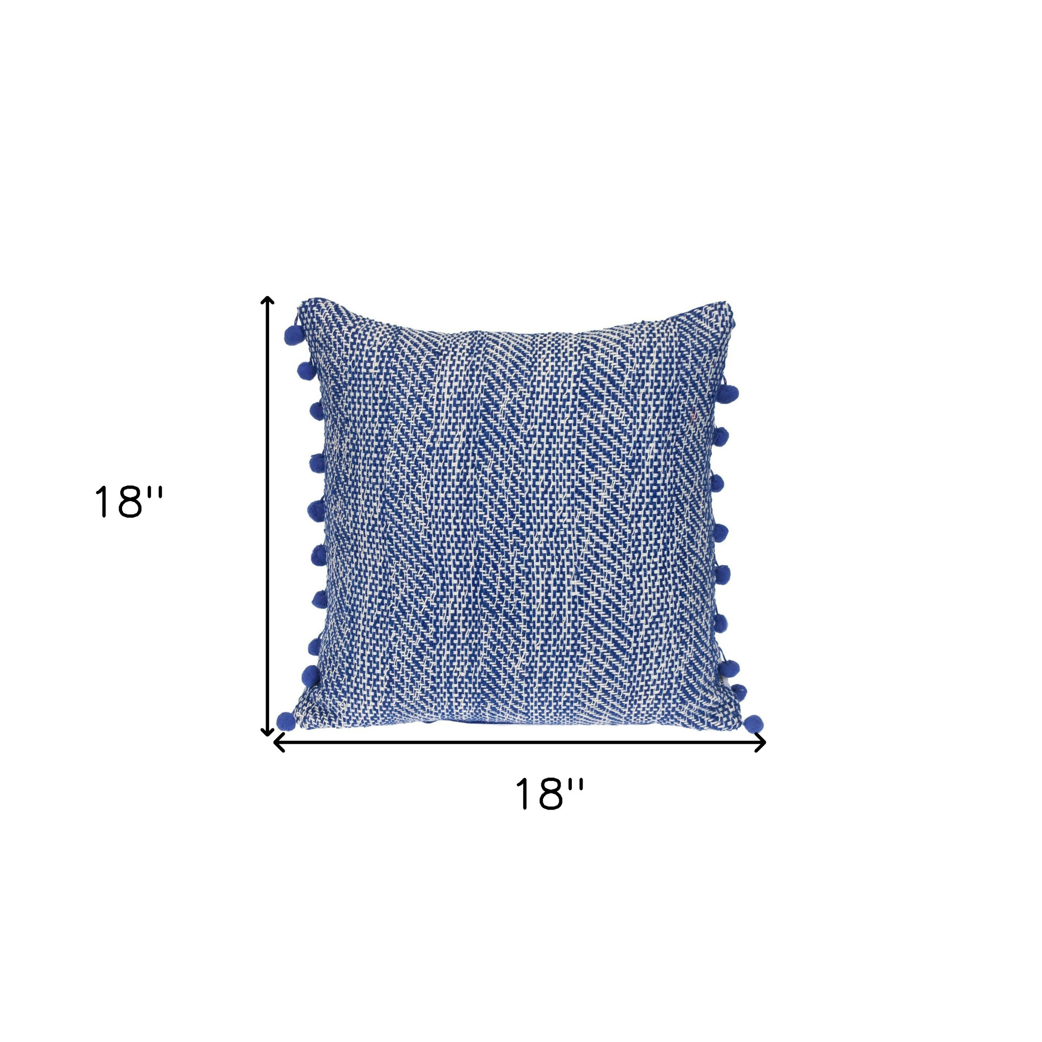 The perfect complement to your sofa, favorite chair, or bed, this 18-inch blue and white weave cotton throw pillow with pom poms is a great decorative accent. This blue and white colored decorative pillow is made from high grade cotton that is durable and long lasting. This soft polyfill filled pillow not only is decorative but made to be comfy and cozy all day long. Great to use on its own or mix with other decorations for the perfect look. A great decorative accessory for your favorite chair, to accent your sofa, or to use as part of your bed ensemble. 18-inch H x 18-inch W x 7-inch D