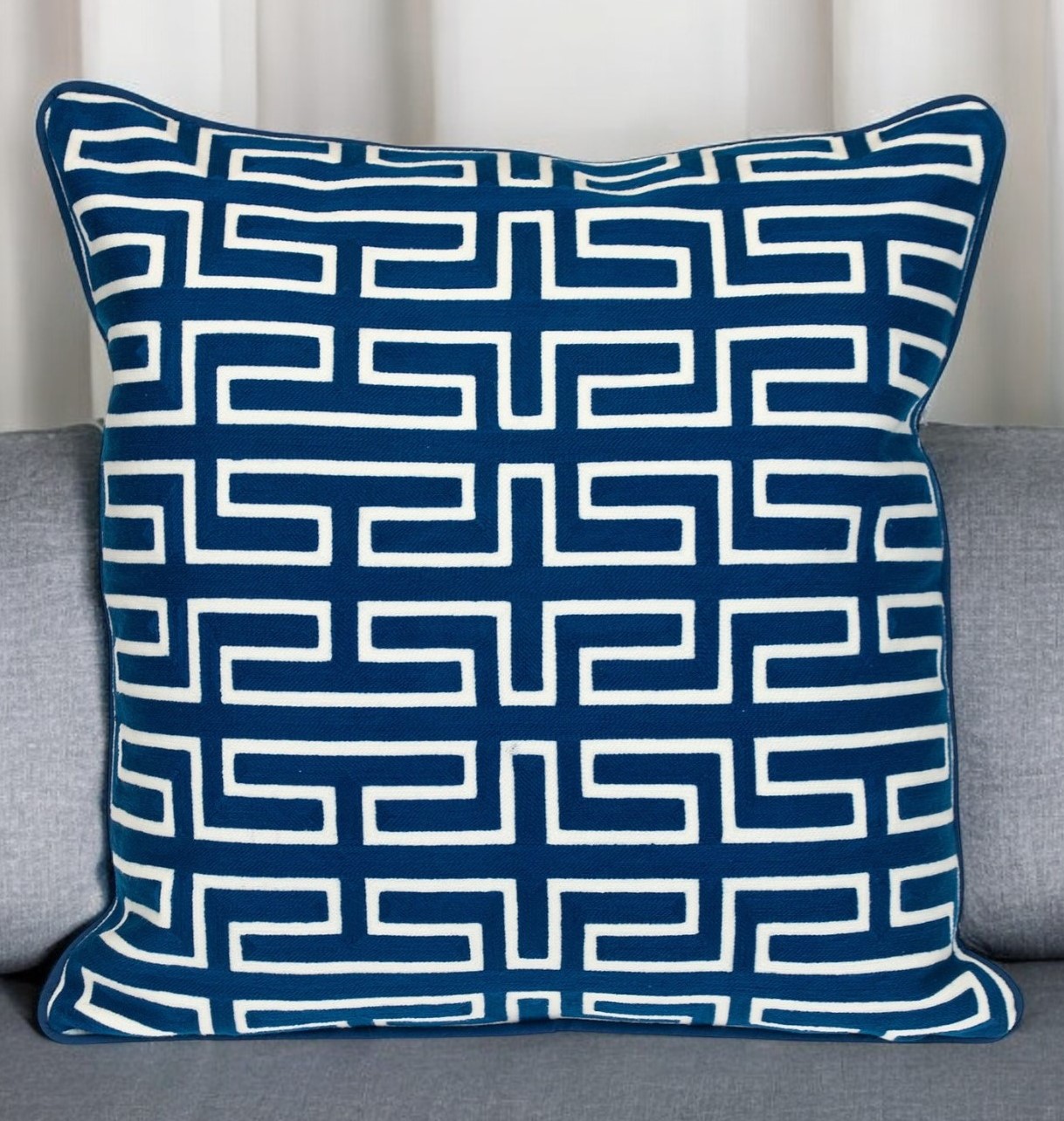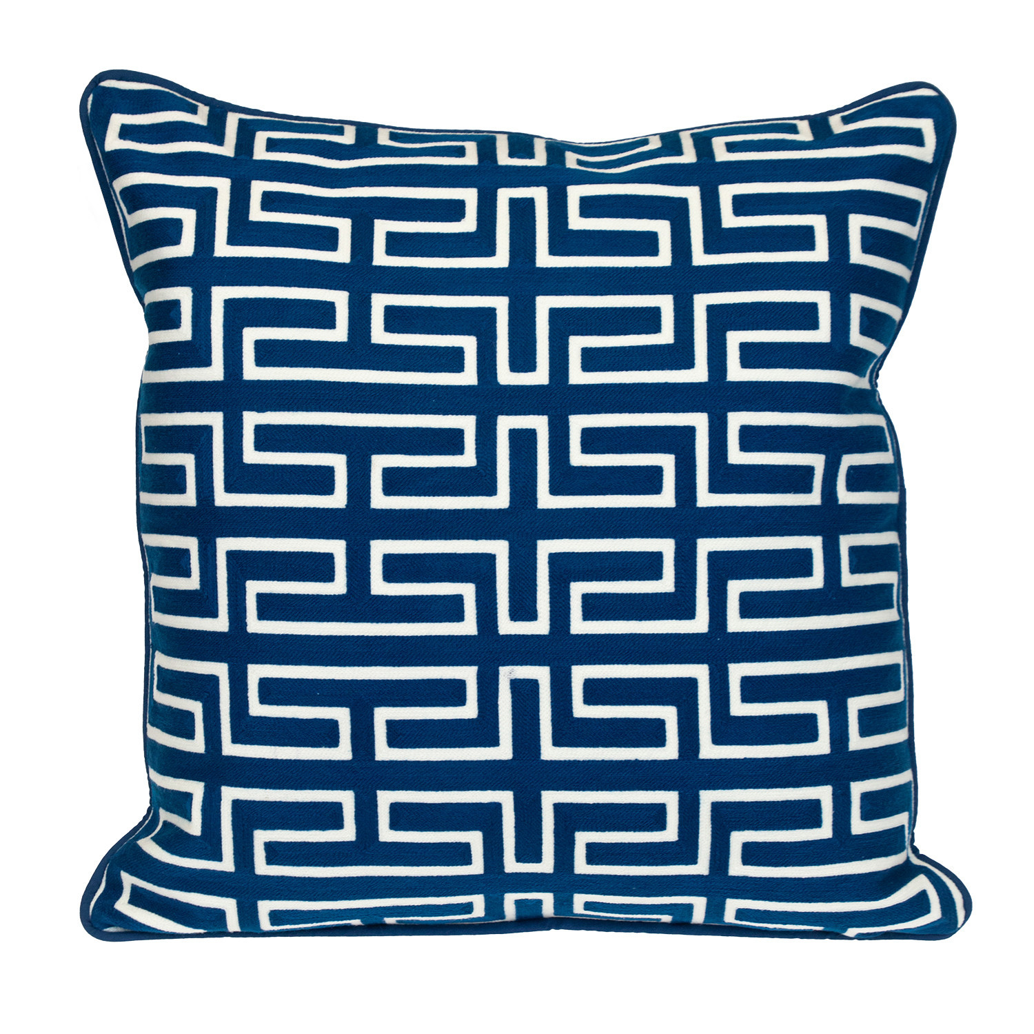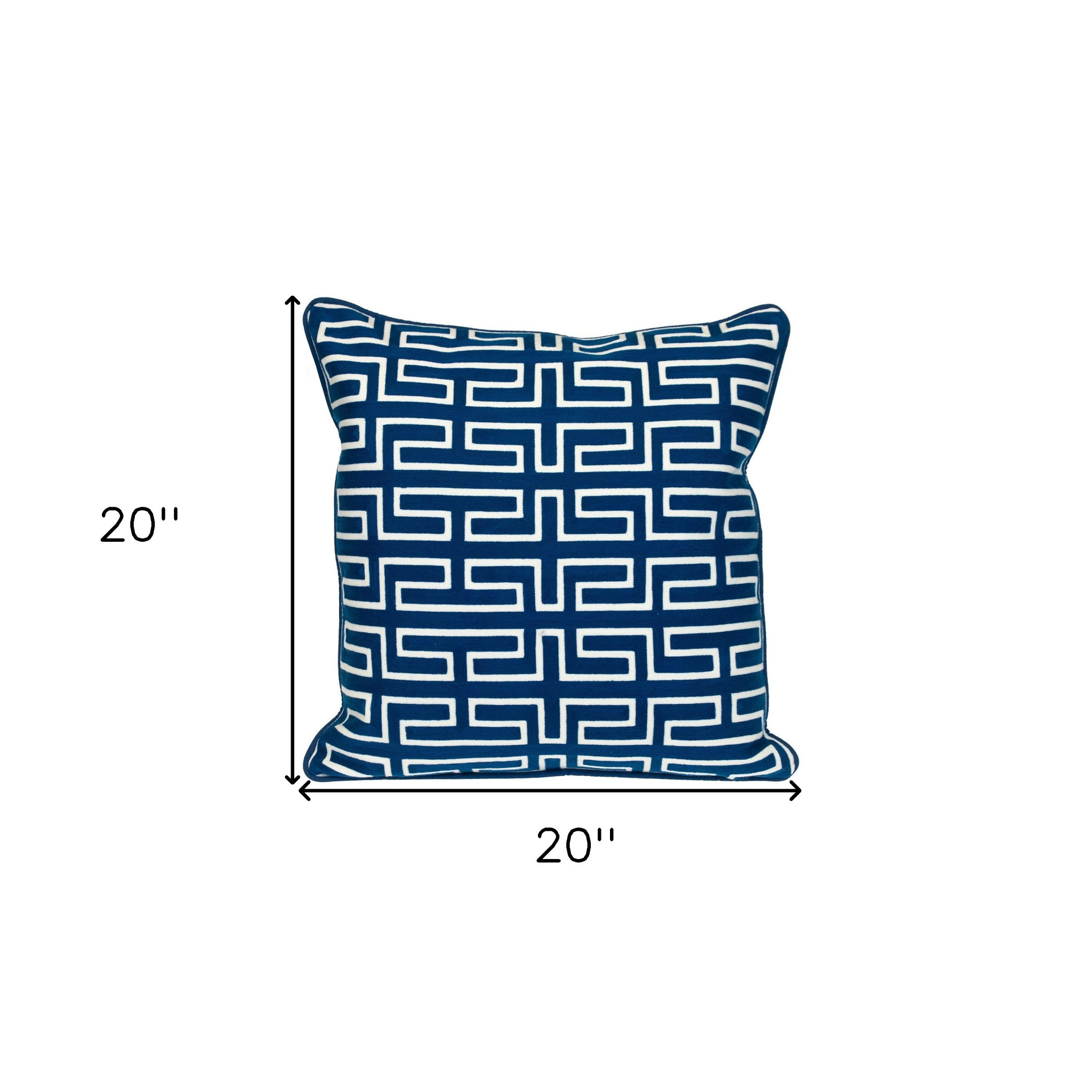 This 20-inch blue geometric cotton throw pillow will add a beautiful decorative accent to your decor. This soft and durable decorative pillow is expertly made of high grade, long lasting cotton in a blue coloration. This soft polyfill pillow not only is decorative but made to be comfy and cozy all day long. Decorative throw pillows not only add color and dimension to your space but can be comfy and supportive when you are lounging and cuddling as well. A great decorative accessory for your favorite chair, to accent your sofa, or to use as part of your bed ensemble. 20-inch H x 20-inch W x 7-inch D