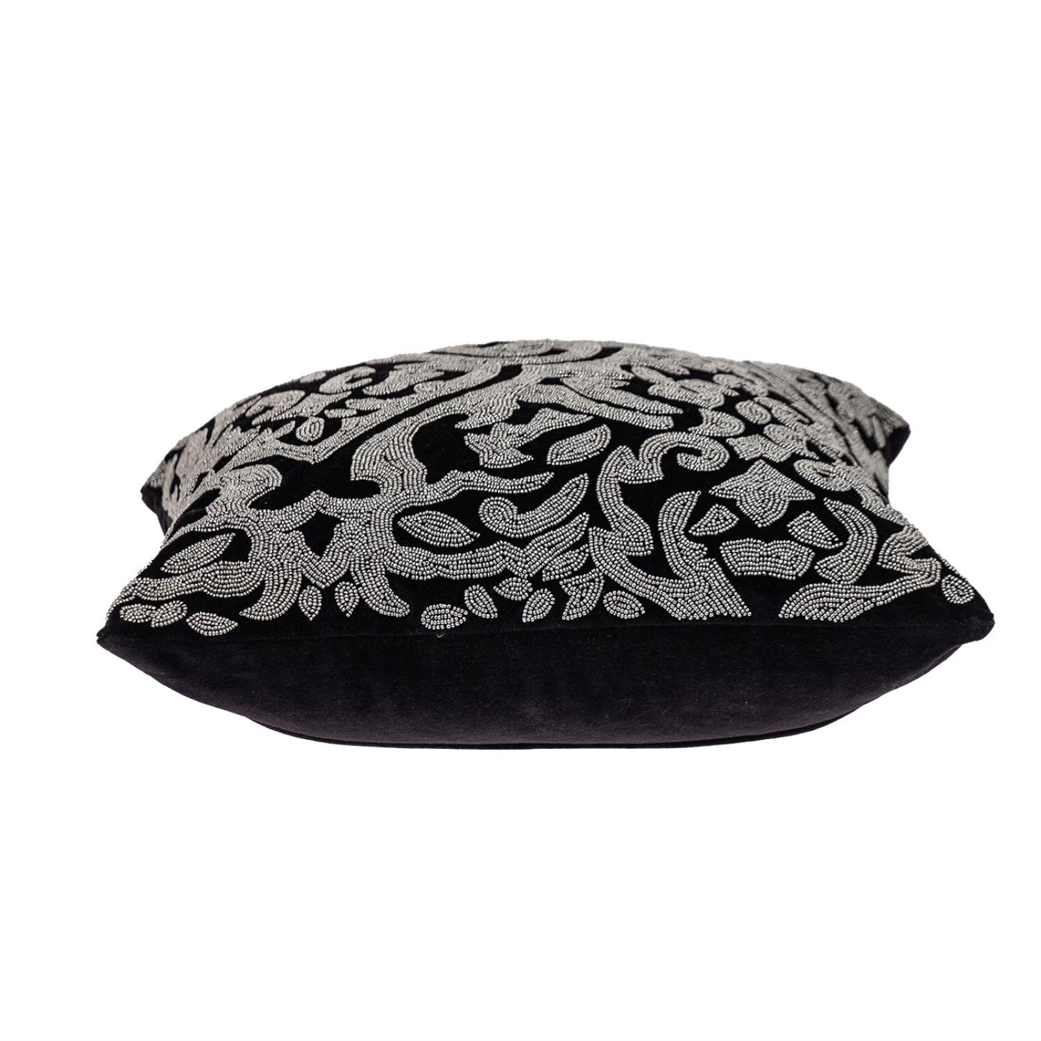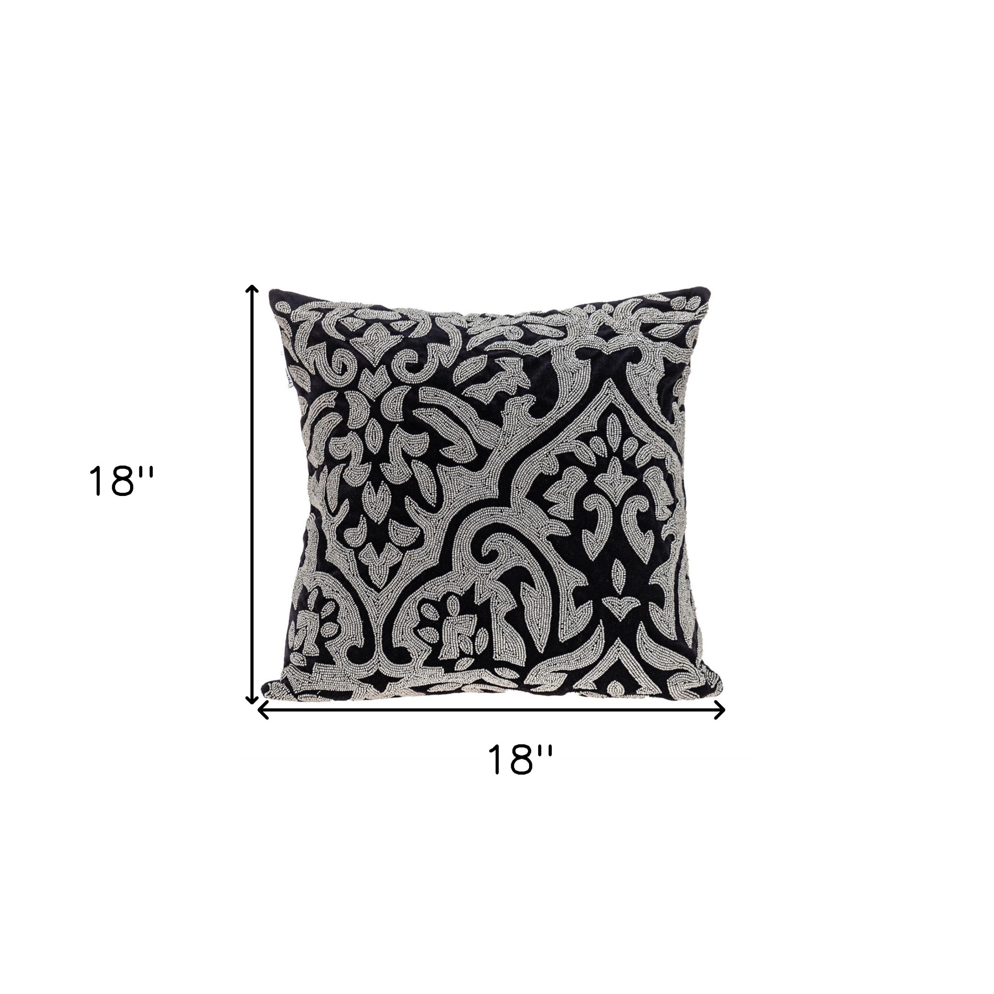 Add an air of fashion to your room and rejuvenate the space with this cute and fashionable 18-inch black and silver damask velvet throw pillow with beads. The black and silver coloring of the soft and long lasting velvet will add dimension and texture to your space. Super soft and built to hold its shape, this polyfill pillow is a great option. For anyone that loves to decorate or accent their space with color and texture. Decorative pillows are a great way to change up the look and feel of your space easily and quickly. 18-inch H x 18-inch W x 4-inch D
